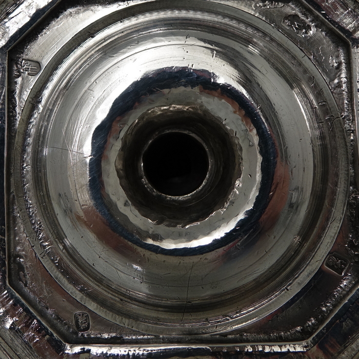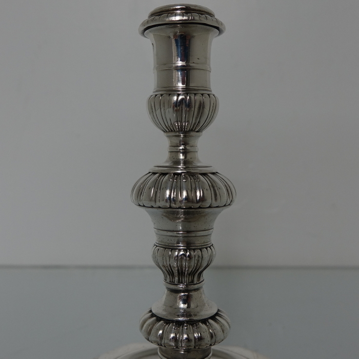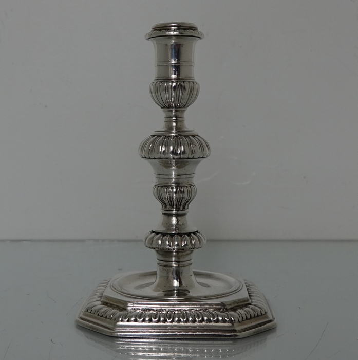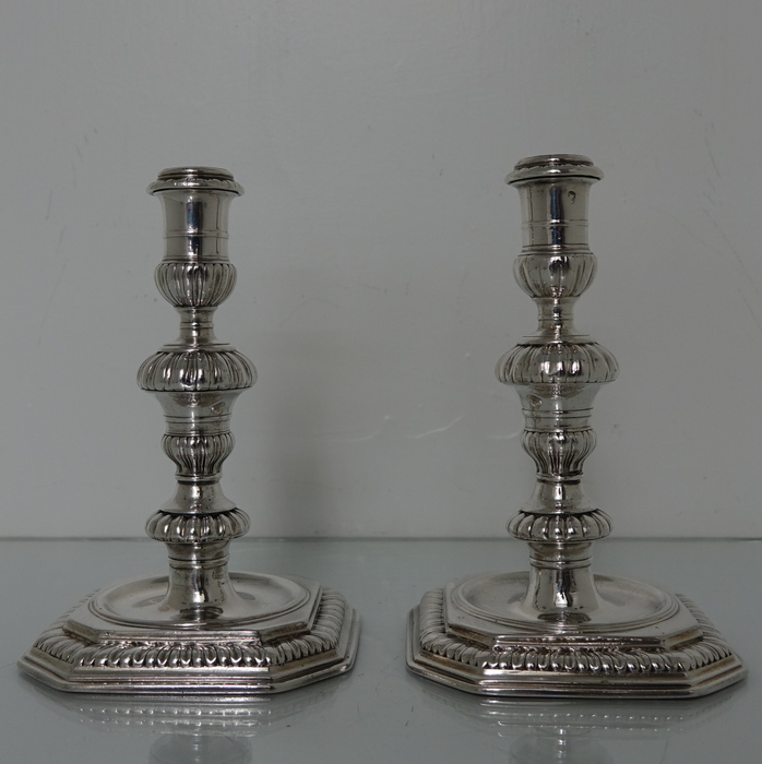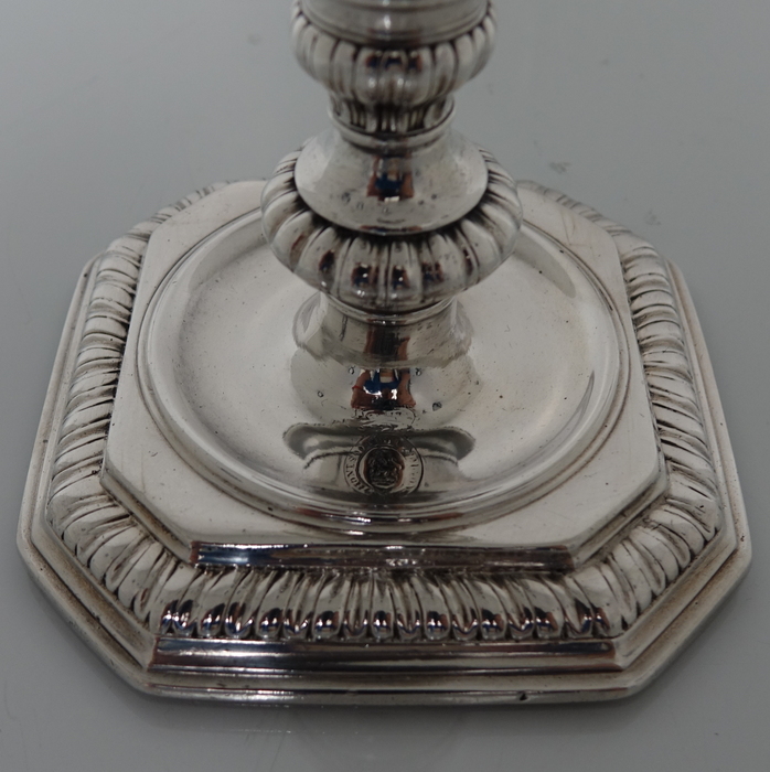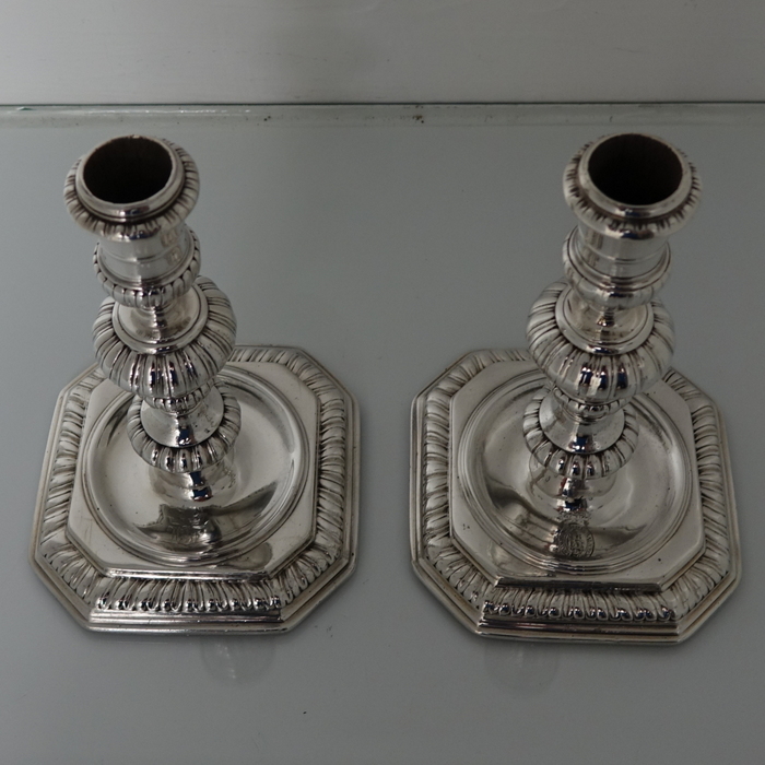 A stunning beautiful and highly collectable pair of cast candlesticks with lobed and gadroon decoration. Â The candlestick shave a double crest and are made by the world renowned Huguenot David Willaume.