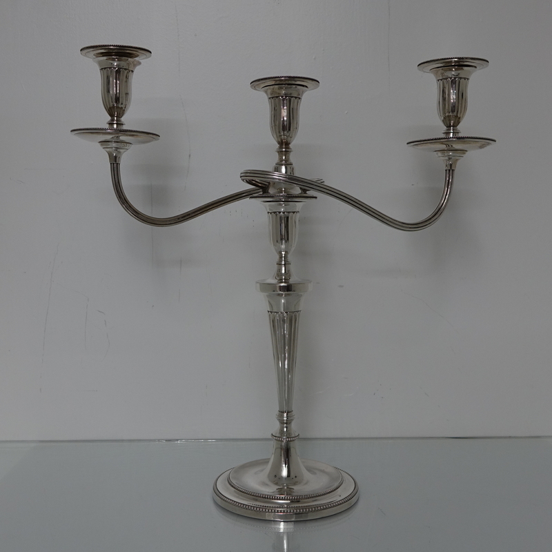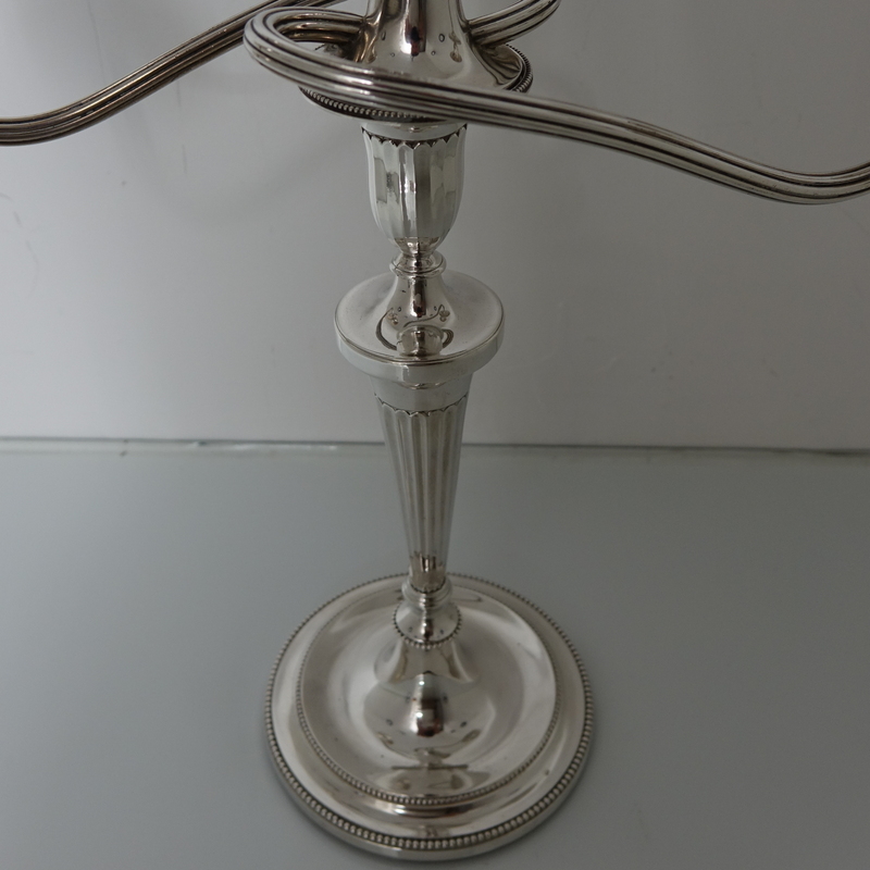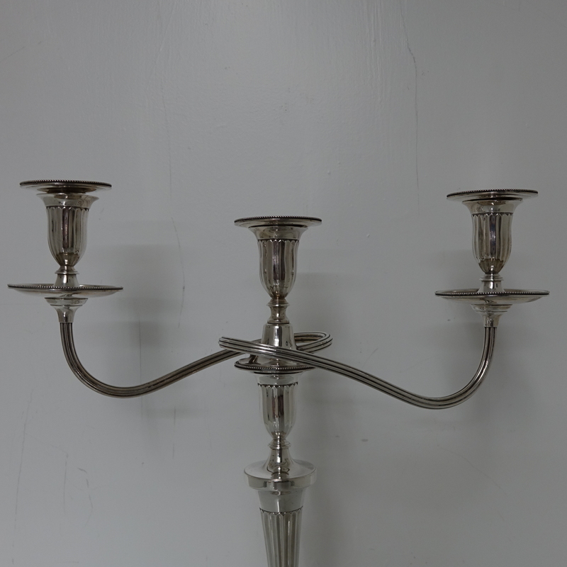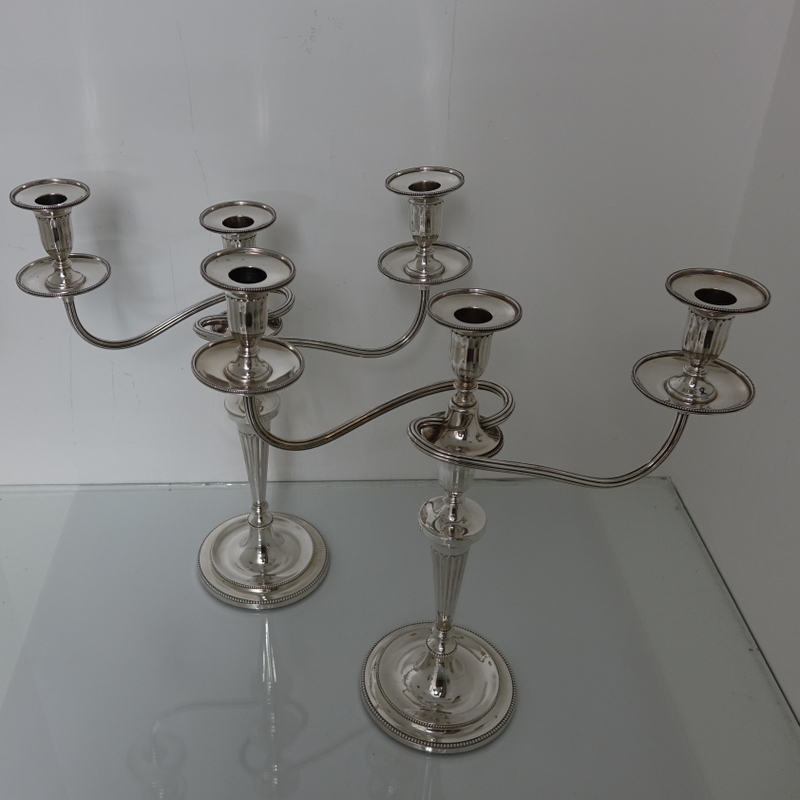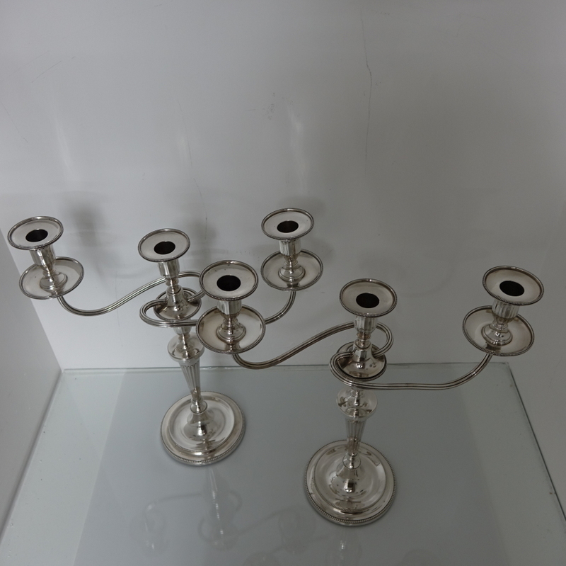 A stunningly beautiful pair of three light candelabra with bead borders and three quarter fluted capitals. Â The candlesticks have sunken in wells with two bands of outer beading for highlights. Â The branches and sconces are detachable.