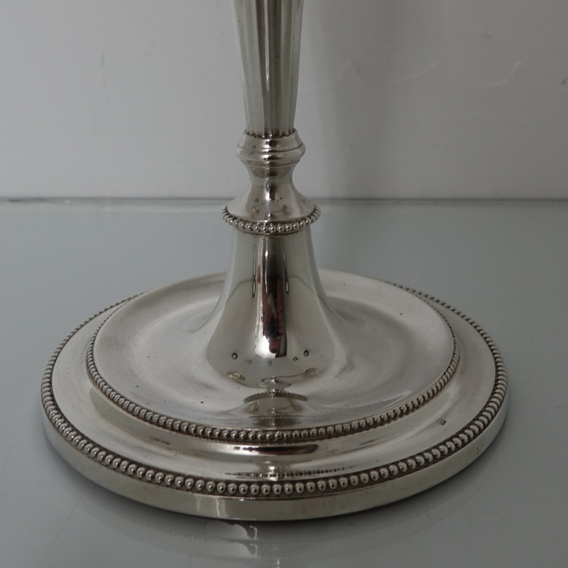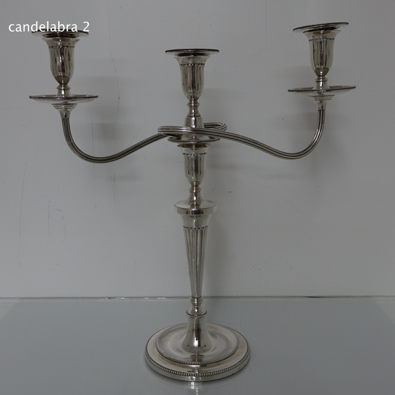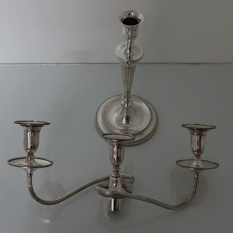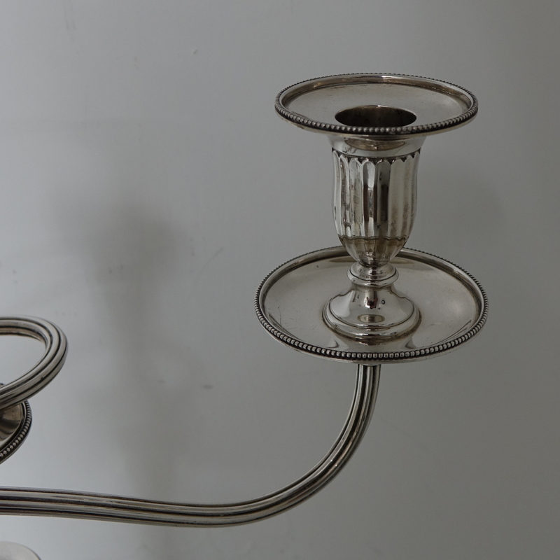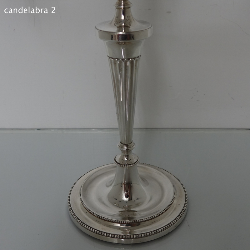 A stunningly beautiful pair of three light candelabra with bead borders and three quarter fluted capitals. Â The candlesticks have sunken in wells with two bands of outer beading for highlights. Â The branches and sconces are detachable.