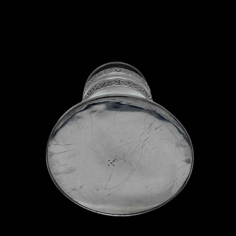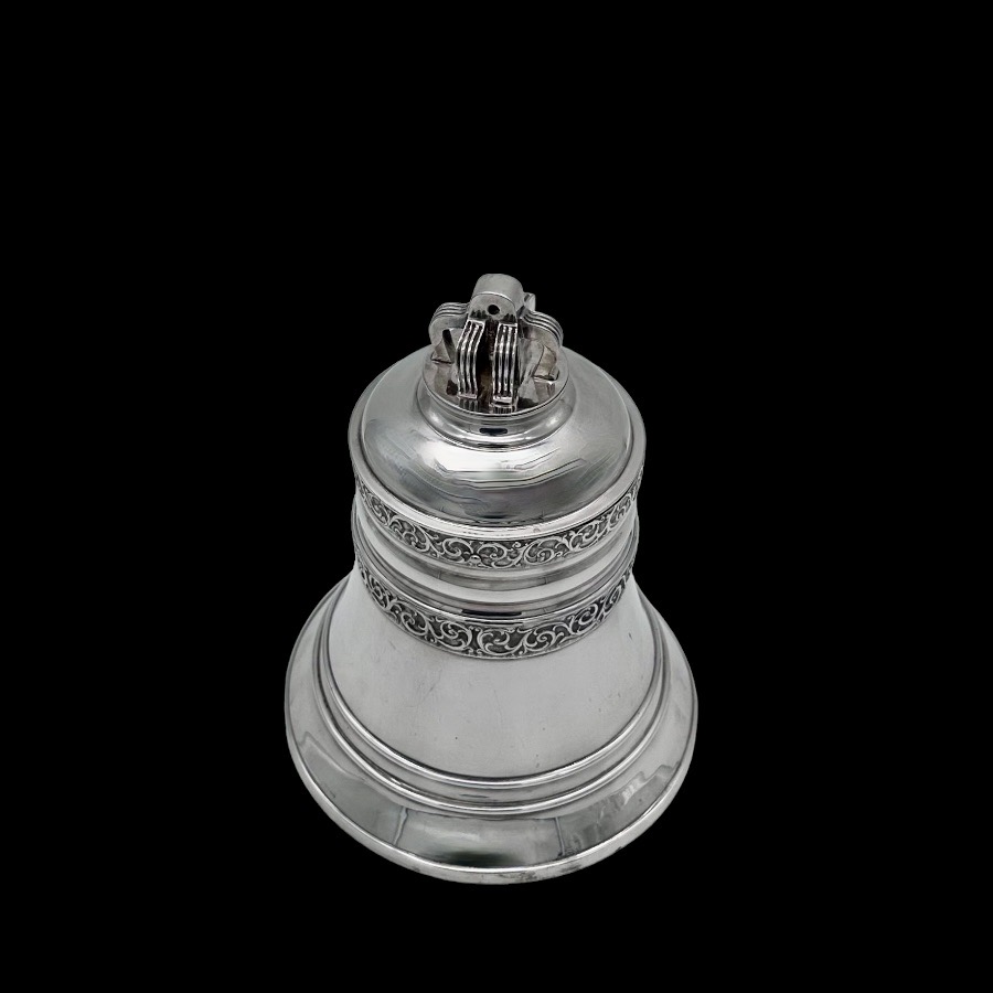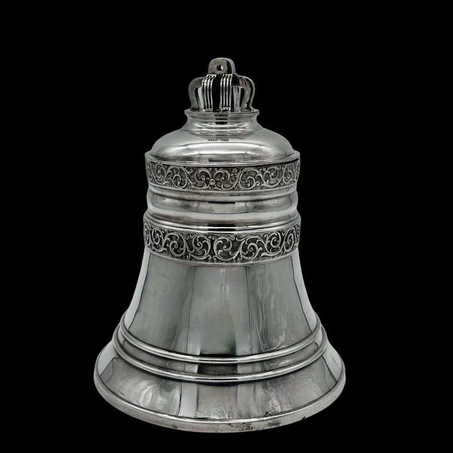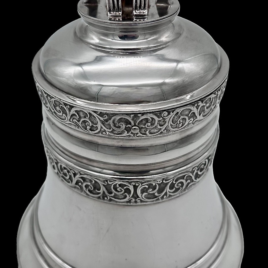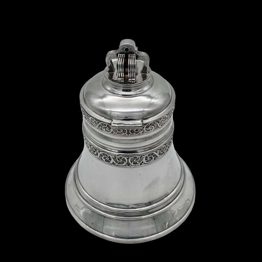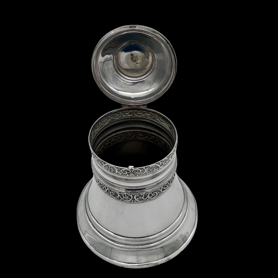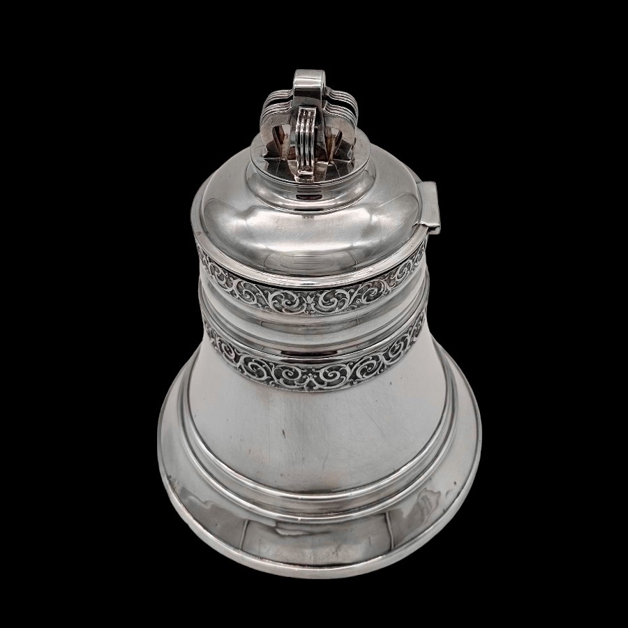 Large Victorian silverplate bell shaped biscuit box designed with two beautiful scrolling bands. The hinged lid has a fabulously stylish handle for decorative highlights.