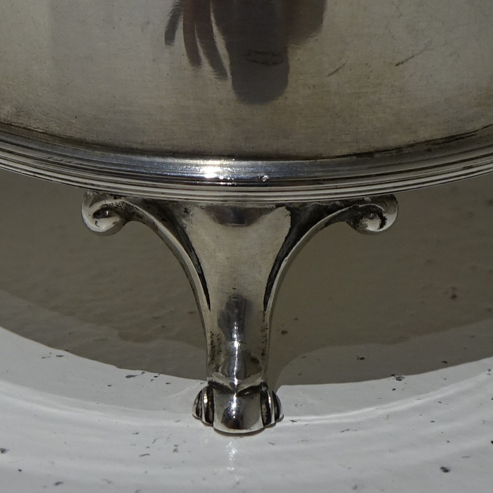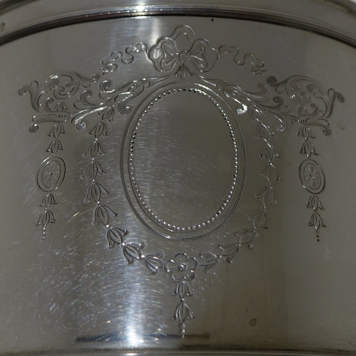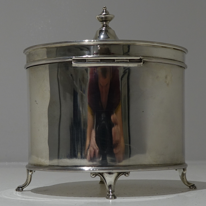 A large stylish 20th century oval tea caddy/biscuit box with hinged lid.  The caddy sits on four decorative feet and has a elegant bright cut engraved cartouche on the center front of the body.