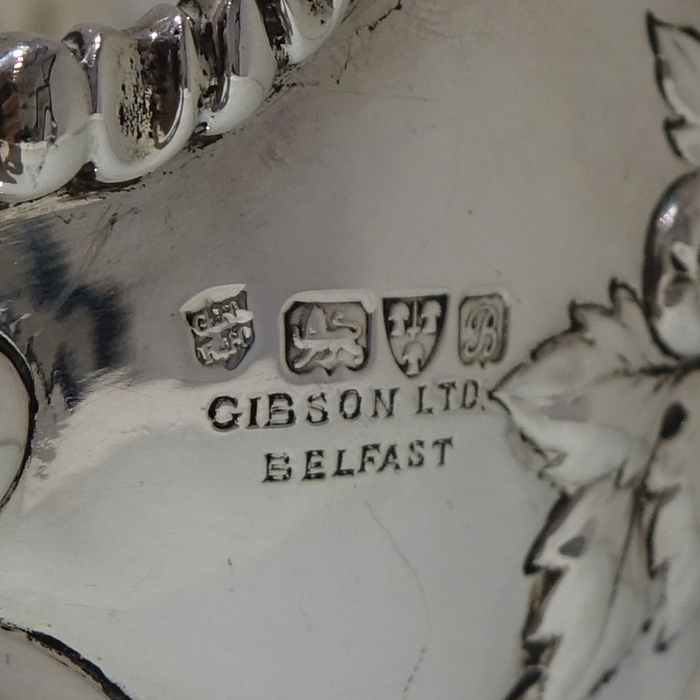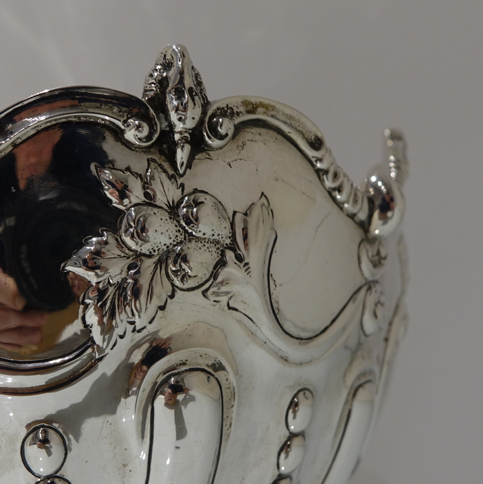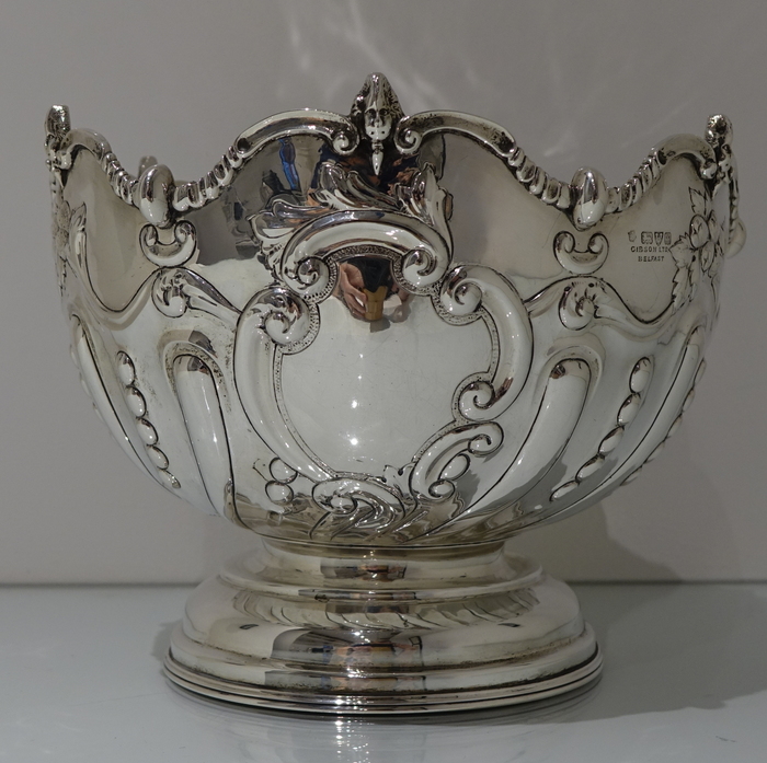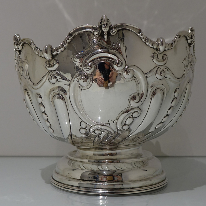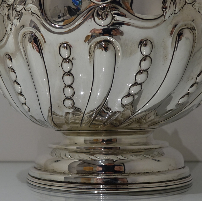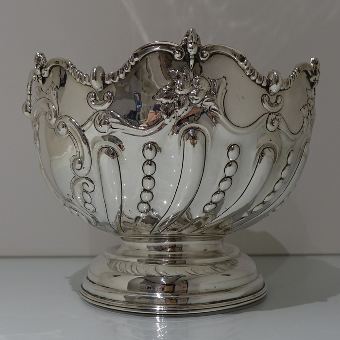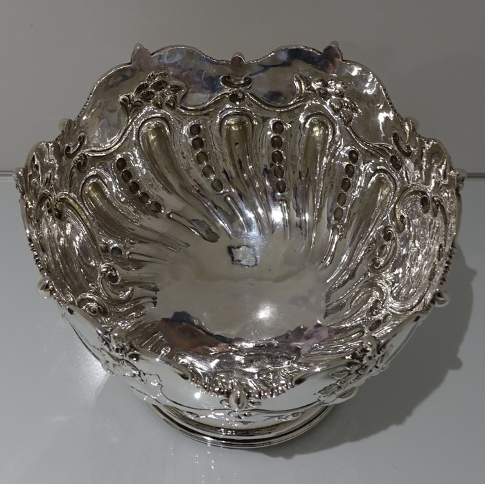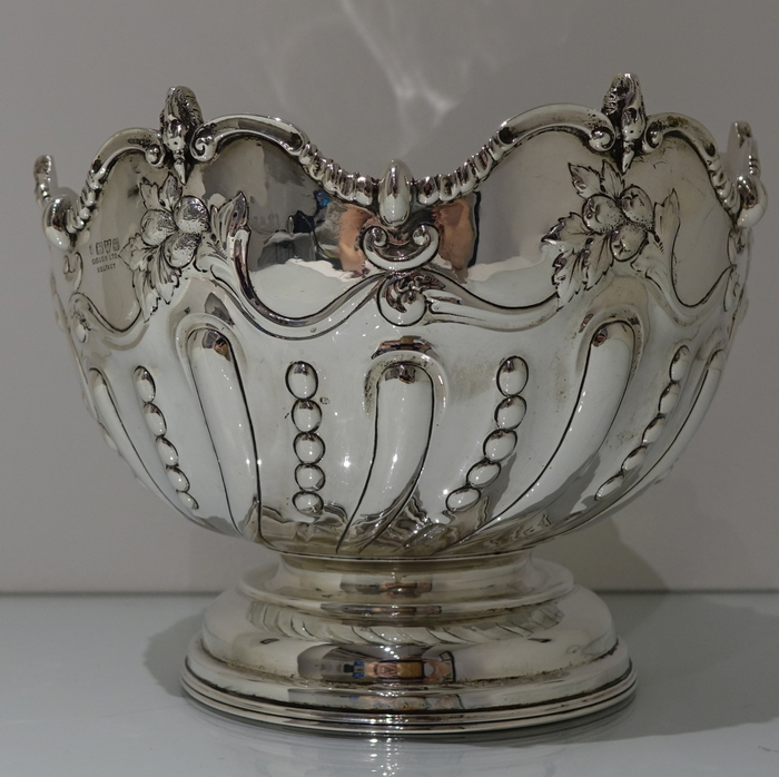 A beautifully designed mid sized circular silver rose bowl decorated with elegant swirl fluting and bead designs. Â The edge of the rim is wavy and has figural motifs for highlights.