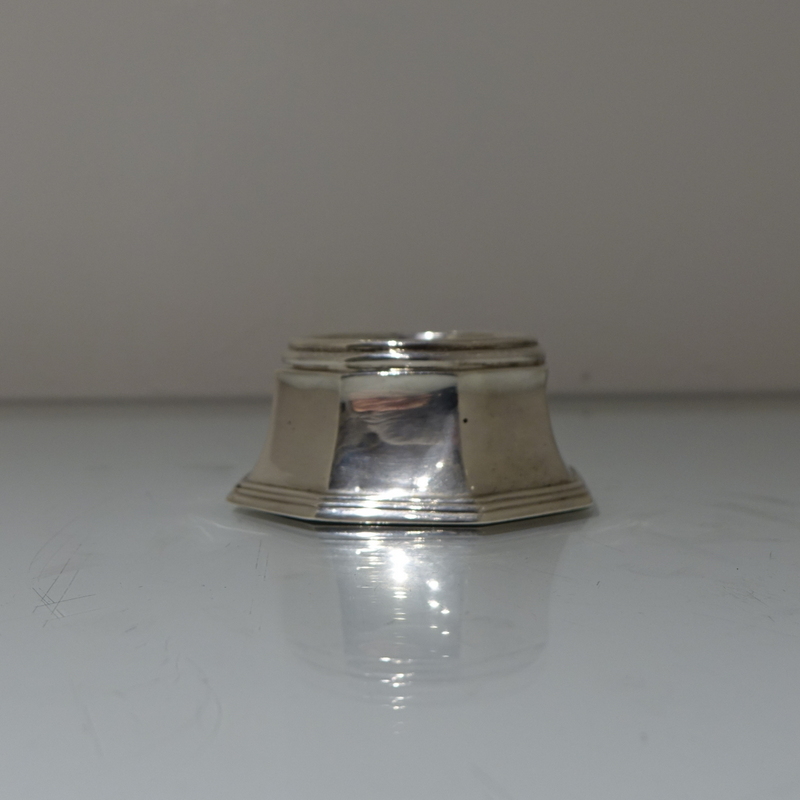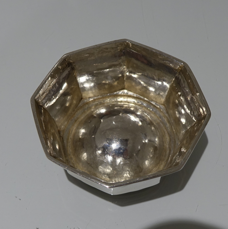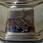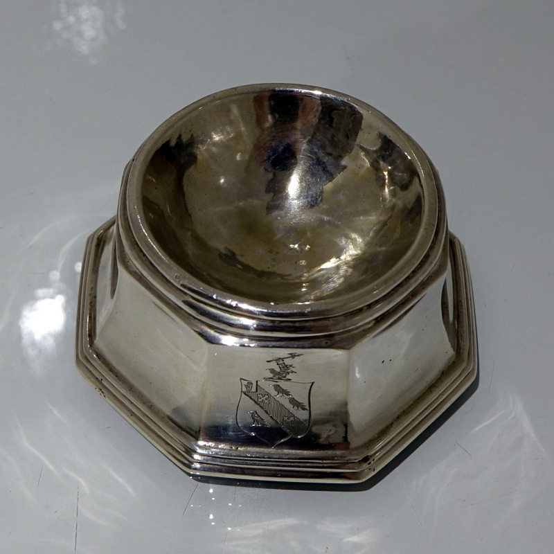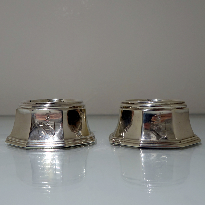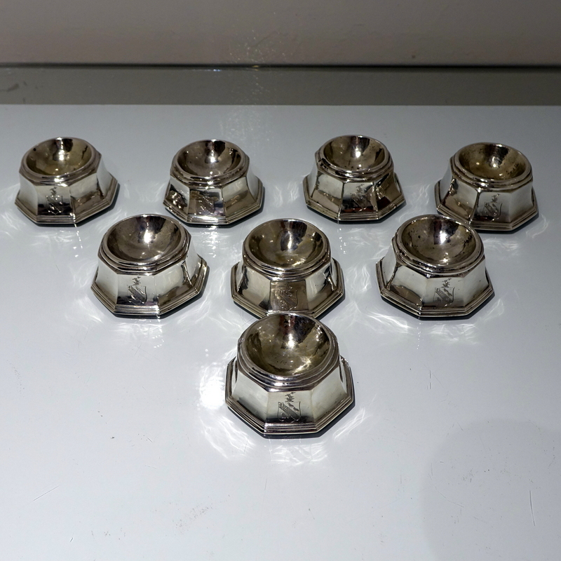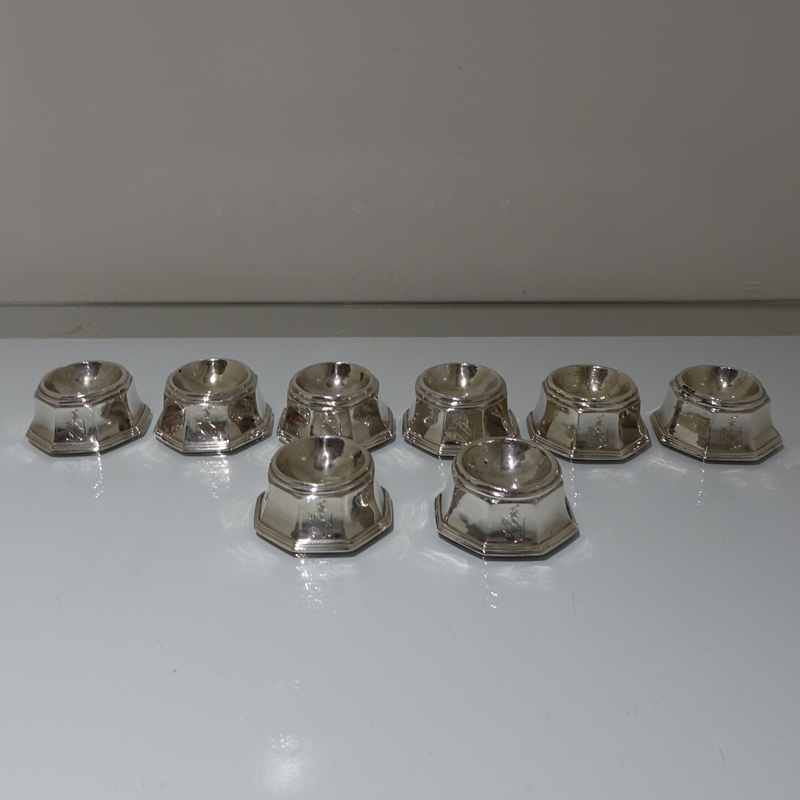 A stylish set of eight plain formed octagonal Britannia silver salt cellars decorated with elegant armorials to their centre fronts.