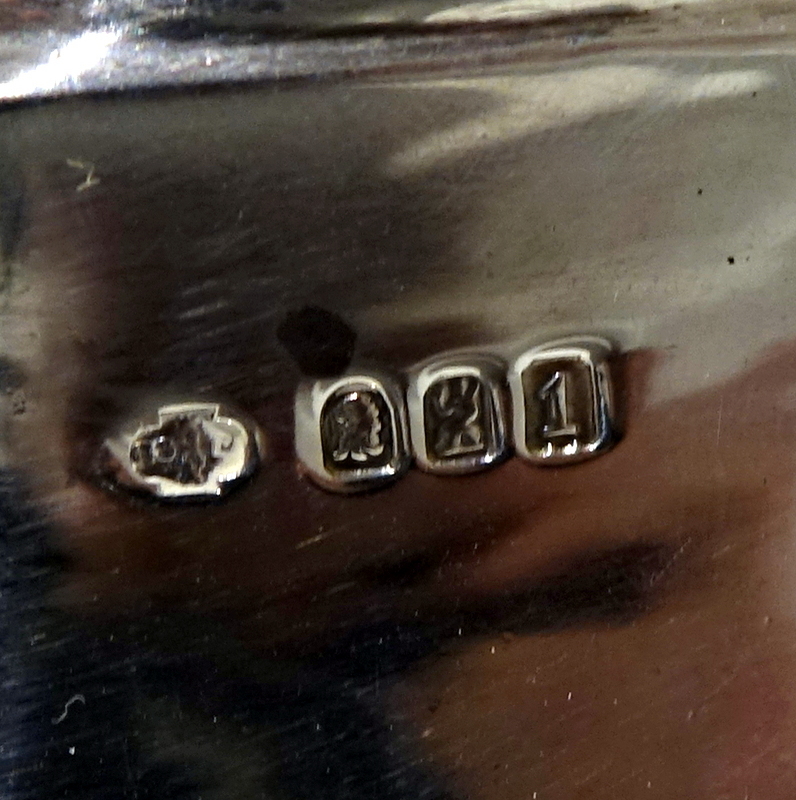After his death the business was continued under the same style by the founder’s son William Carr Hutton until 1864, when the name was changed to William Hutton & Son. This was a partnership of William Carr Hutton and his youngest son Herbert Hutton (senior, born 1843). Â William Carr Hutton died in 1865 and c. 1870 Herbert Hutton Sr. was joined by his brothers James Edward Hutton (b. 1839) and Robert (b. 1840) and the name was changed to William Hutton & Sons. Â A London showroom was opened in 1863 (13 Thavies Inn Holborn until 1891, and later 7 Farrington Road until 1918). Â In 1893 the firm acquired Rupert Favell & Co (manufacturer silversmith at Bucknall Street, Oxford Street, London) and in the same year became William Hutton & Sons Ltd. Â The firm acquired Creswick & Co in 1902, beginning to use their crossed arrows marks. Â The last Hutton family MD was Herbert Hutton Jr. before the company failed in 1930. That was due to lack of foresight by the Chairman of the Board of directors (information courtesy Michael Hutton). Â The firm was absorbed by James Dixon & Sons in 1930.