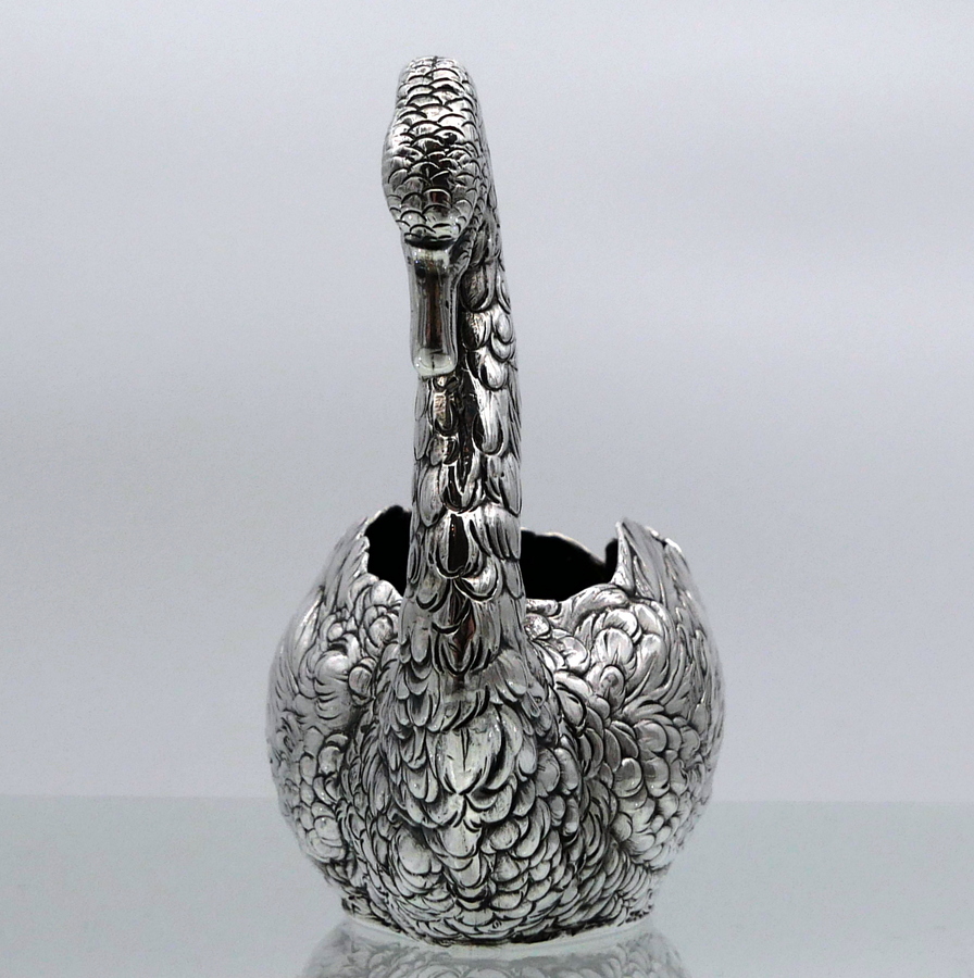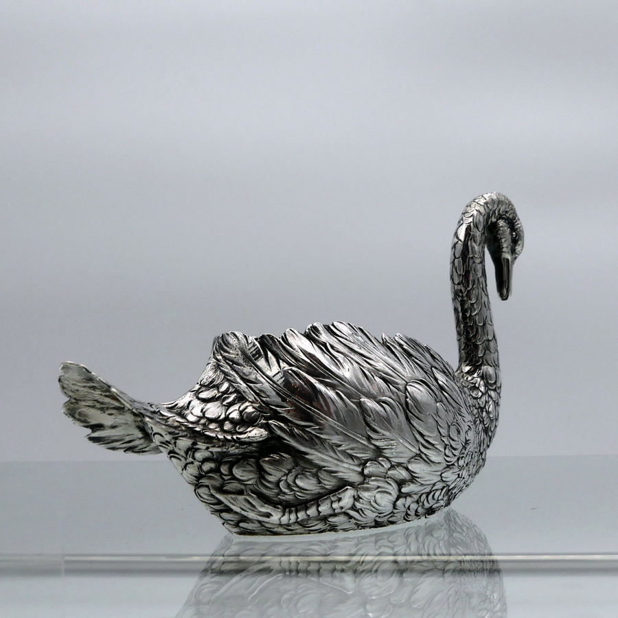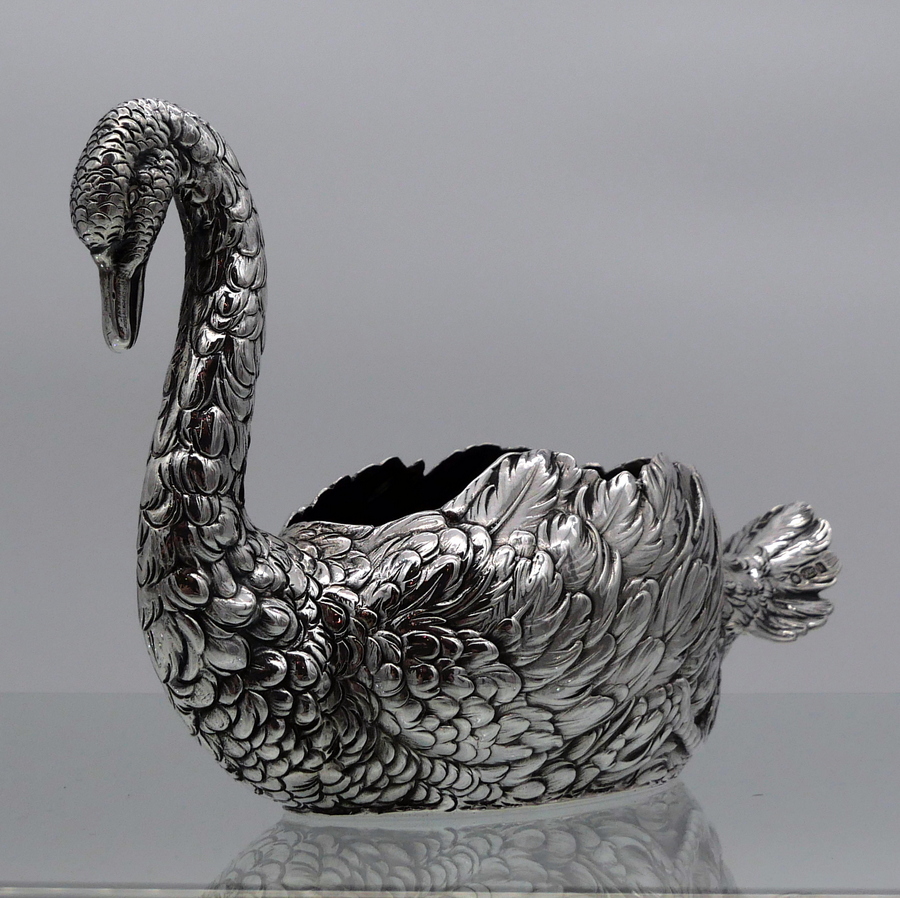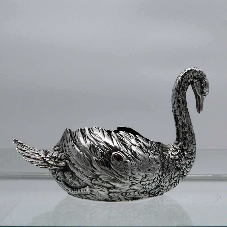 A truly wonderful cast Edwardian silver swan designed with an open bowl and a beautifully etched feather plumage.
