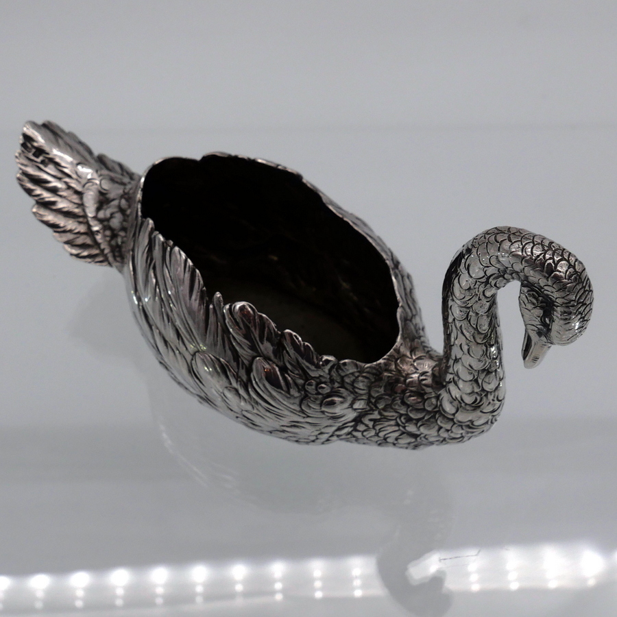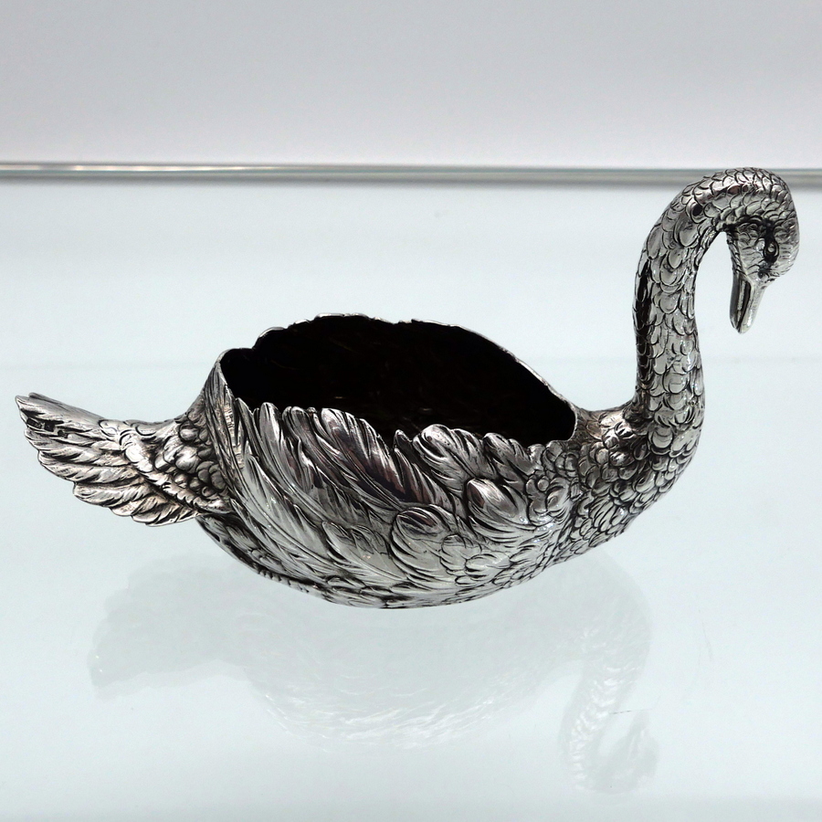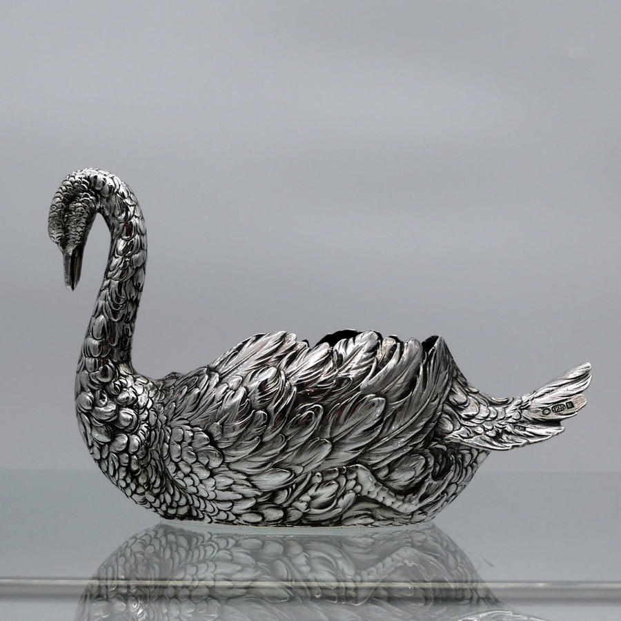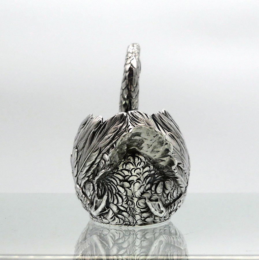 A truly wonderful cast Edwardian silver swan designed with an open bowl and a beautifully etched feather plumage.