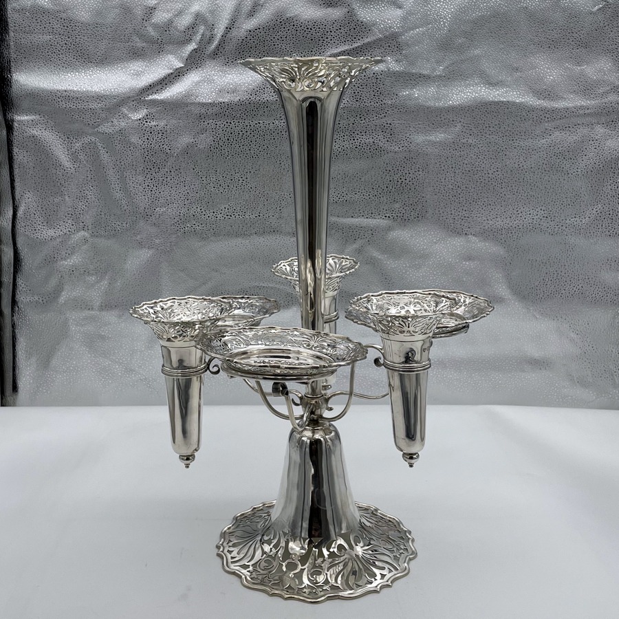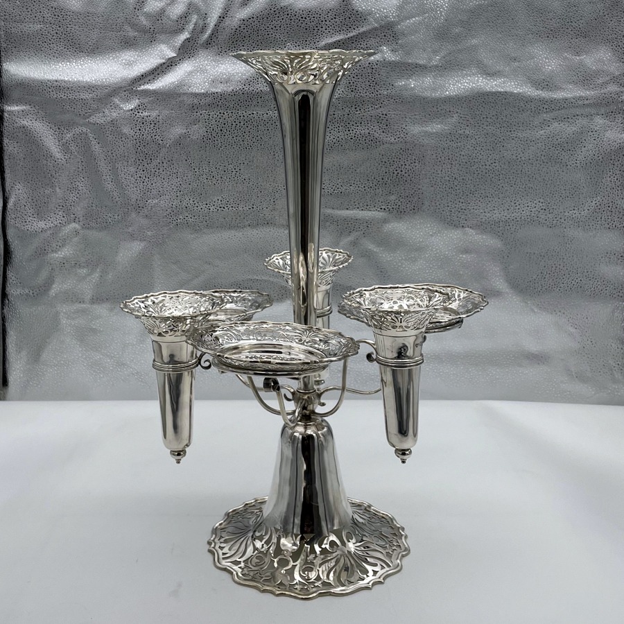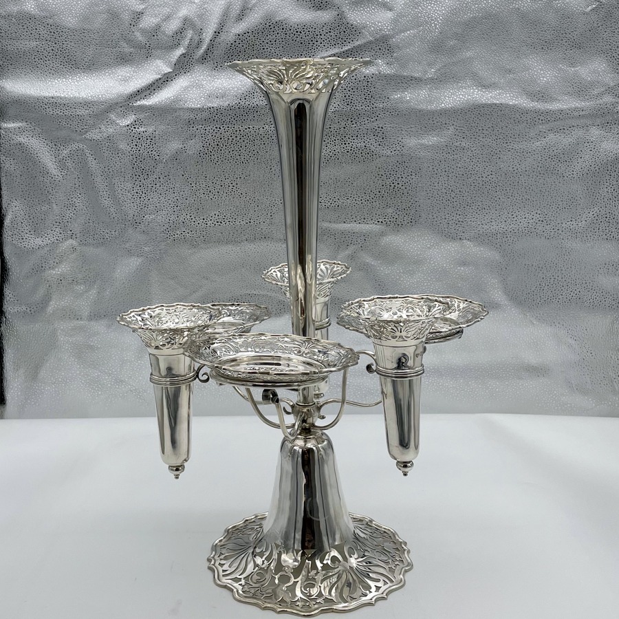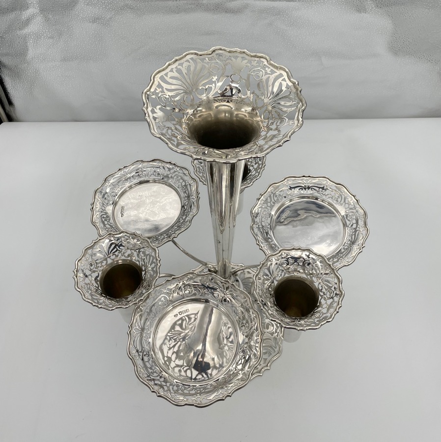 A wonderful large sterling silver Edwardian centrepiece set with three elegant flower vase holders alternating three stylish shaped circular dishes all decorated with wonderfully intricate outer pierced galleries.