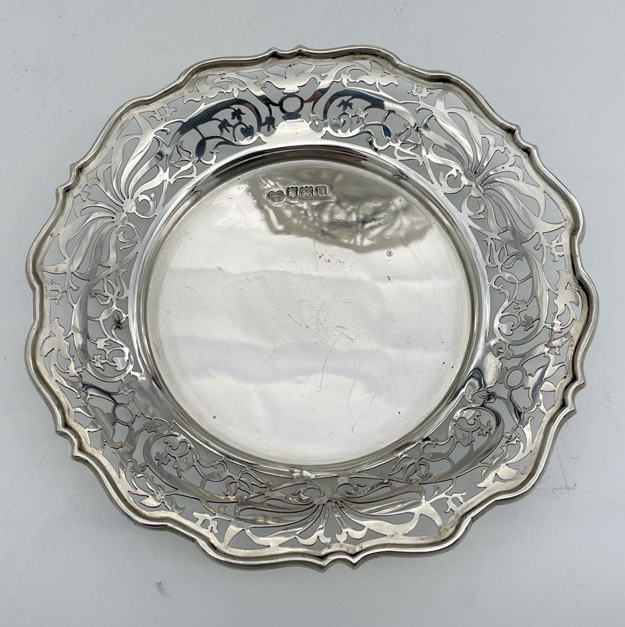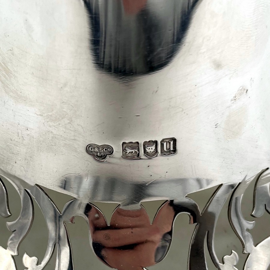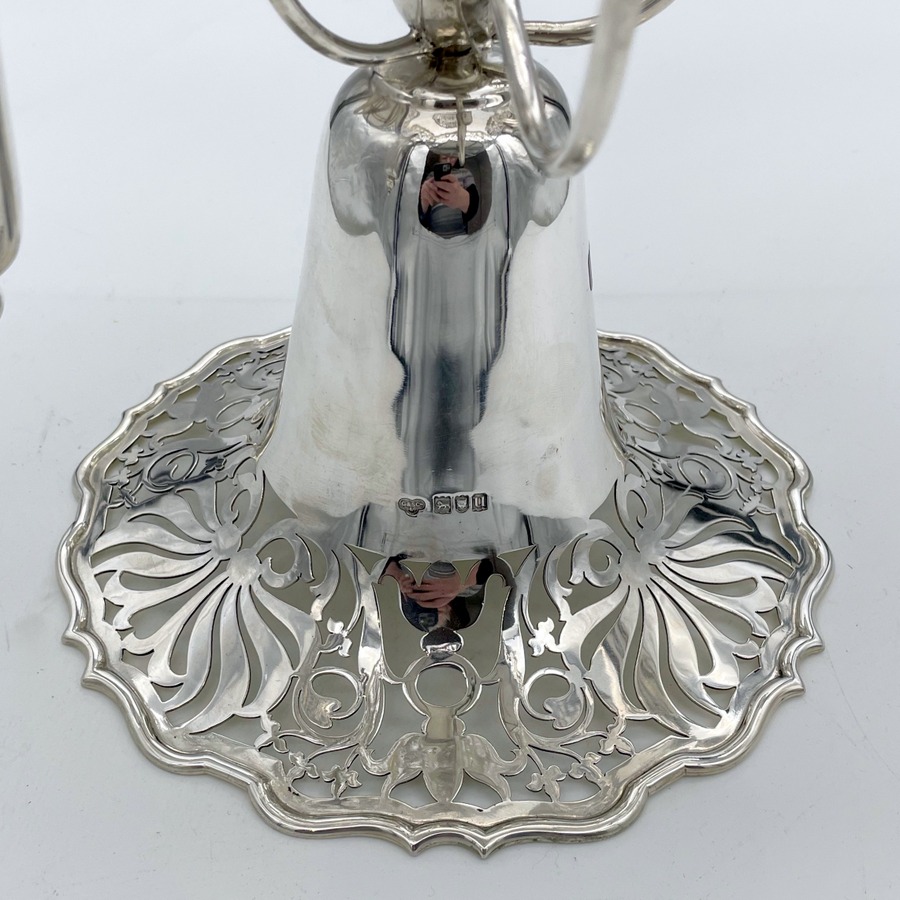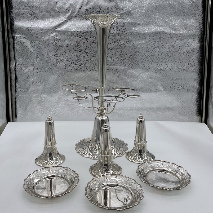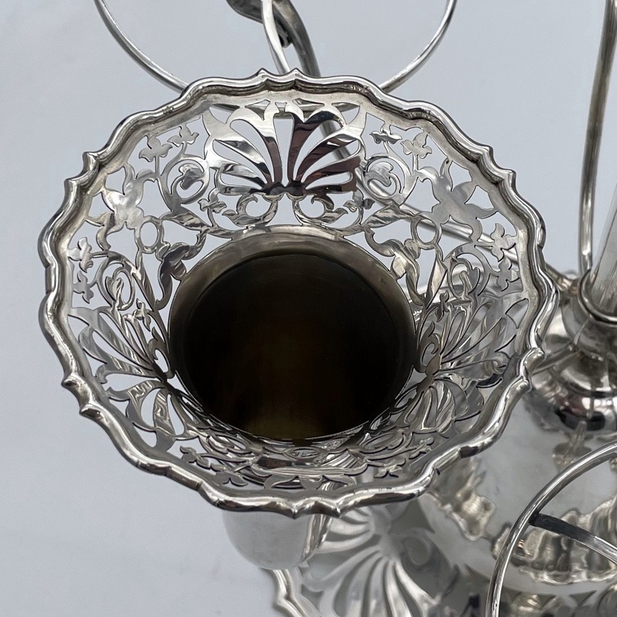 A wonderful large sterling silver Edwardian centrepiece set with three elegant flower vase holders alternating three stylish shaped circular dishes all decorated with wonderfully intricate outer pierced galleries.