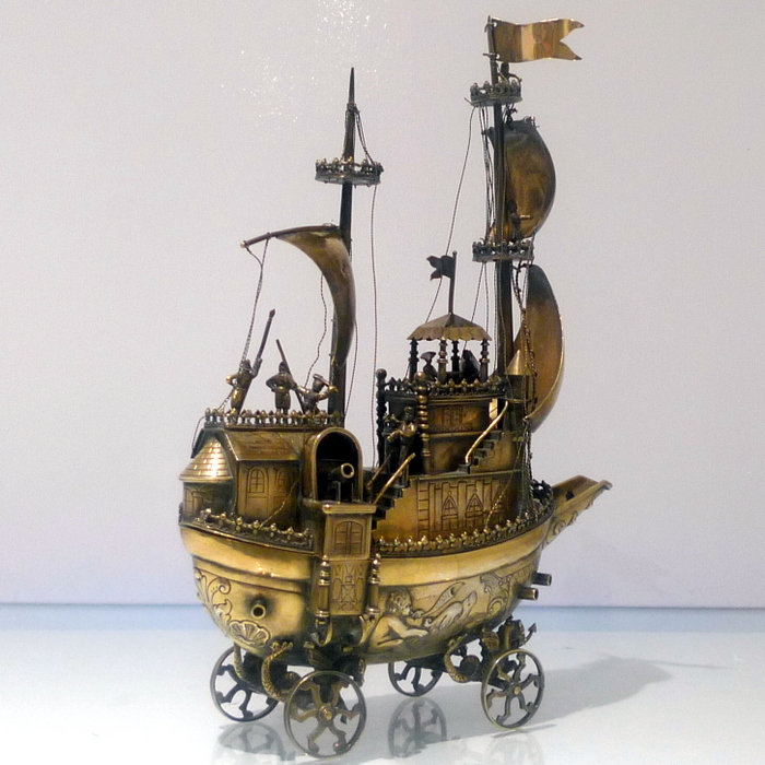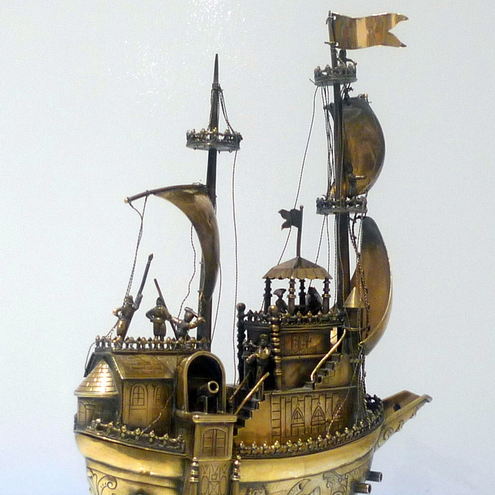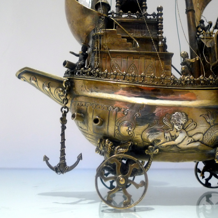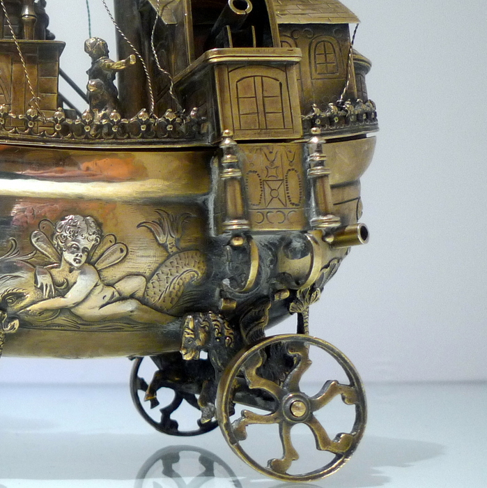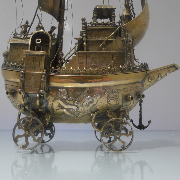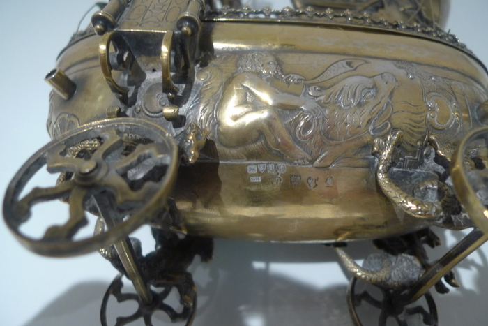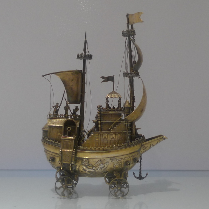A very elegant mid sized silver gilt Edwardian neff elegantly decorated with cherubs and floral motifs to the base. Â The deck of the neff has splendid scenes depicting “everyday” sailors lives.