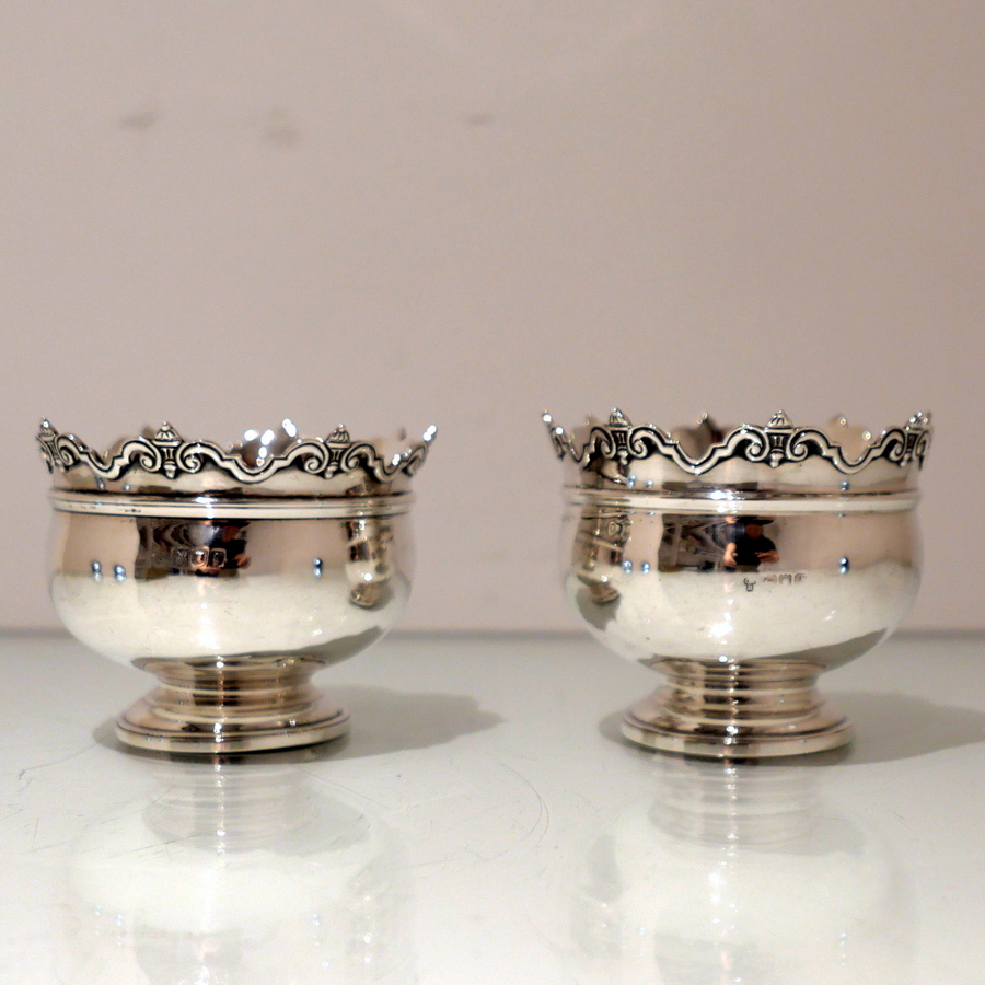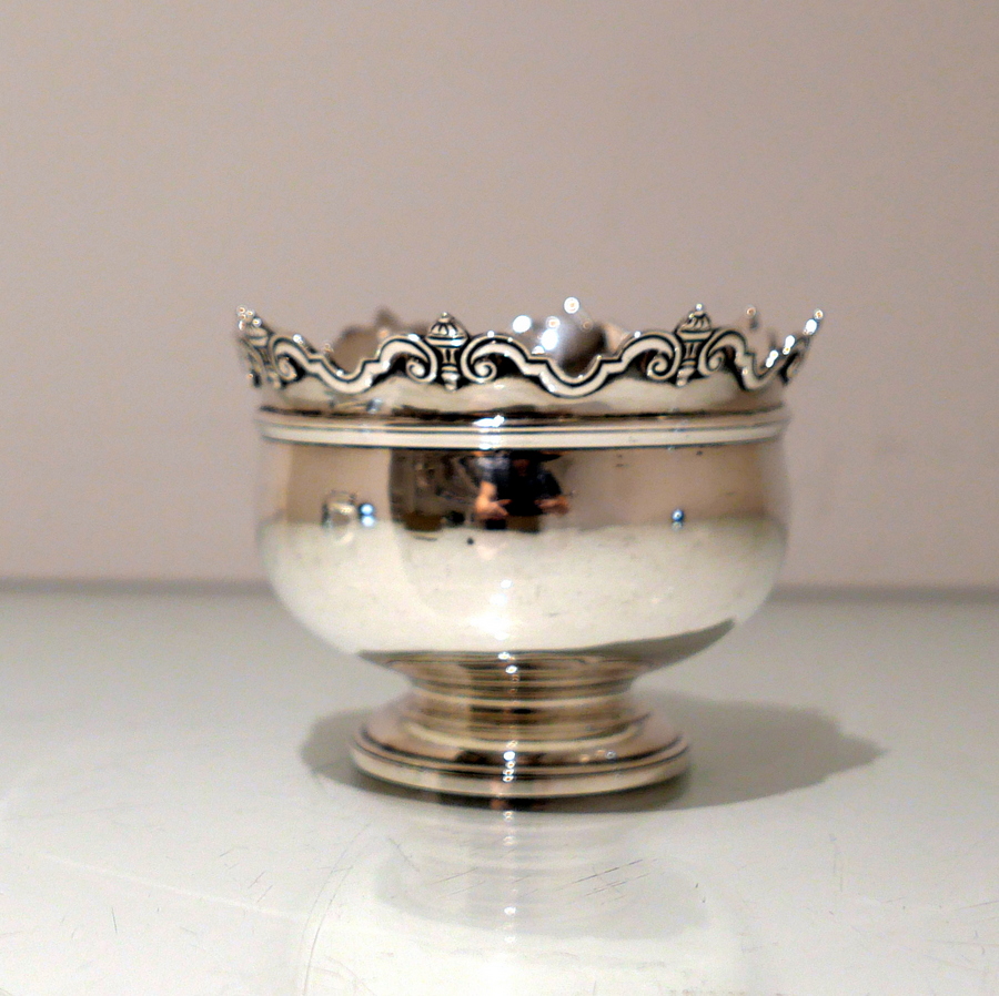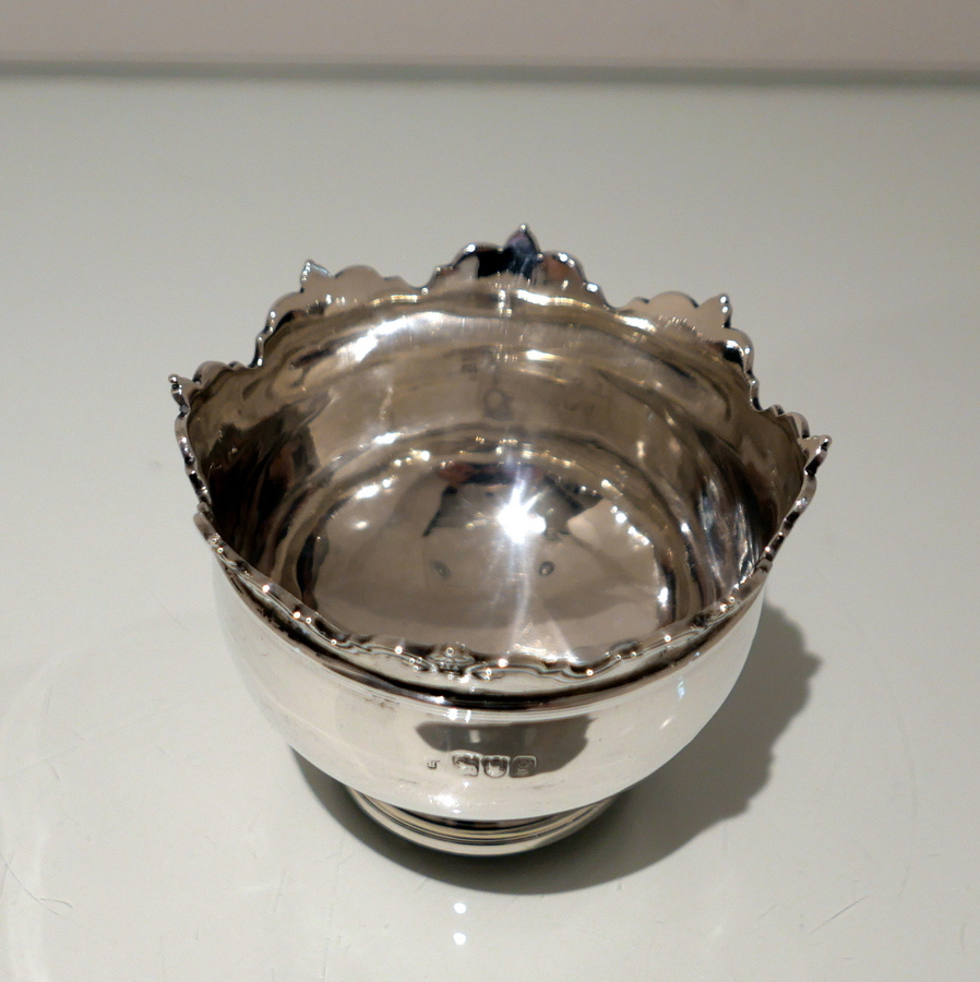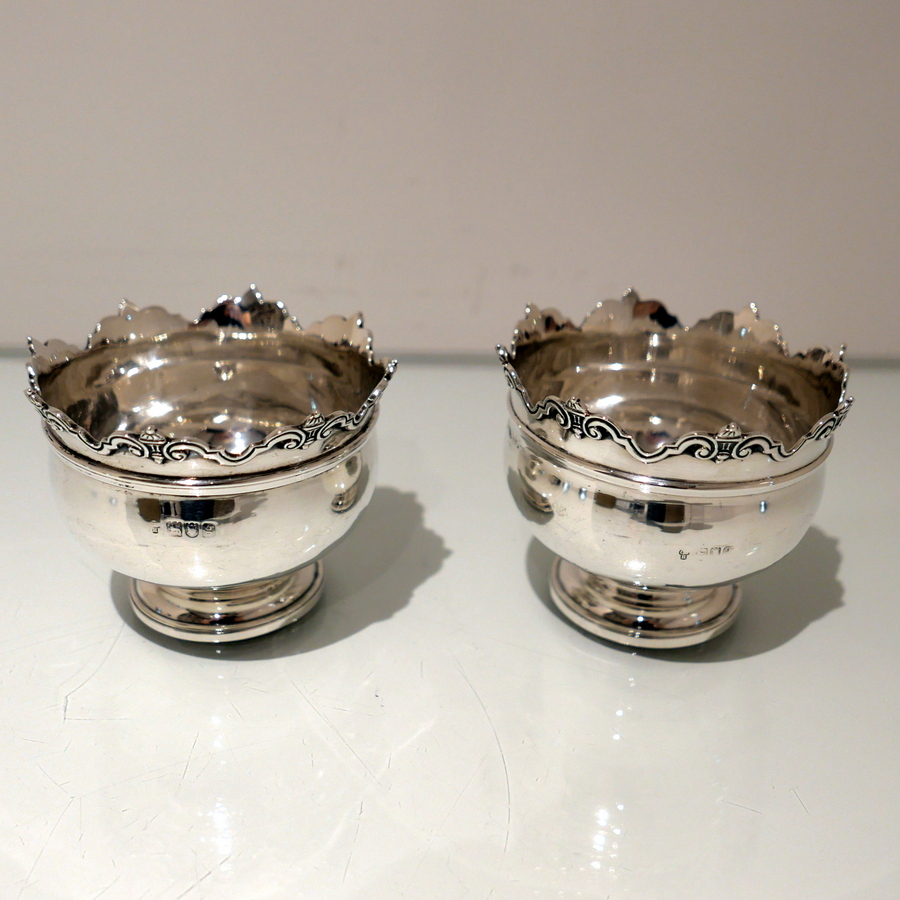 A delightful pair of miniature sterling silver Monteith bowls designed with elegant fixed capes and beautifully shaped bulbous bodies (walls) sitting on a circular pedestal feet.