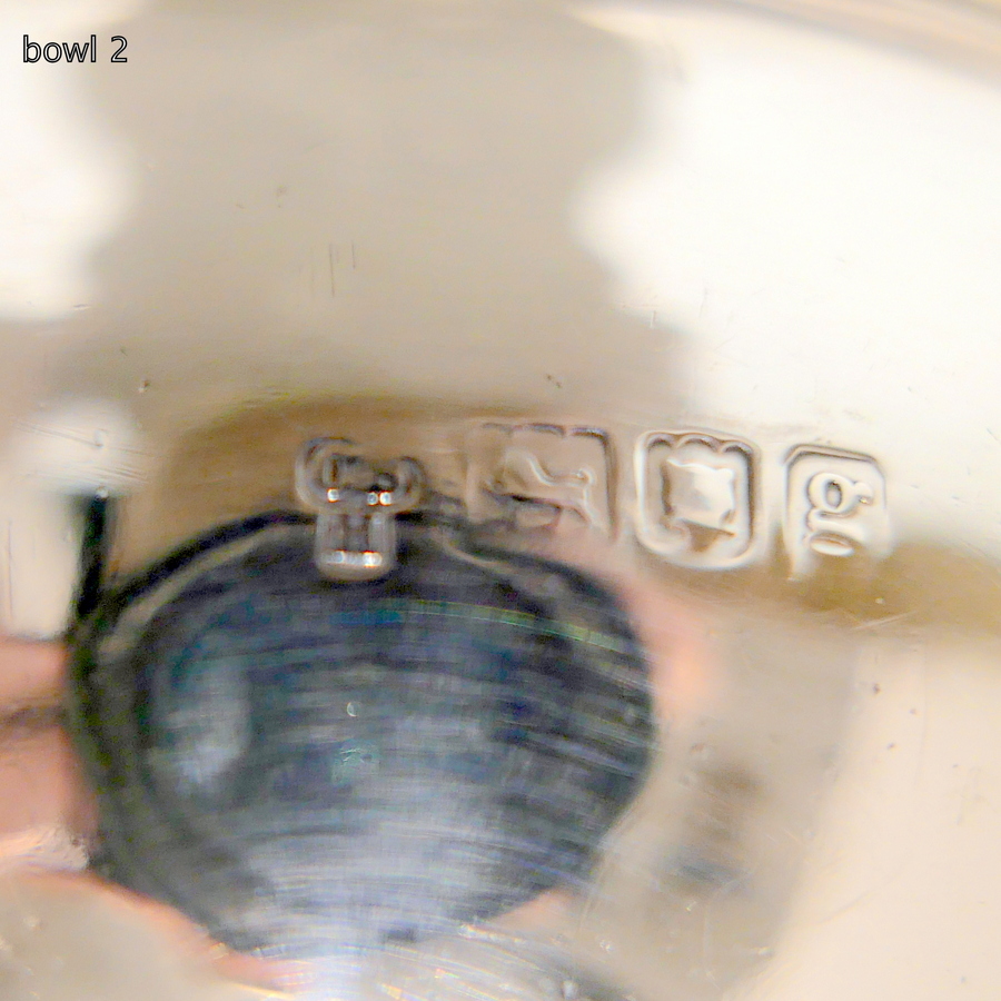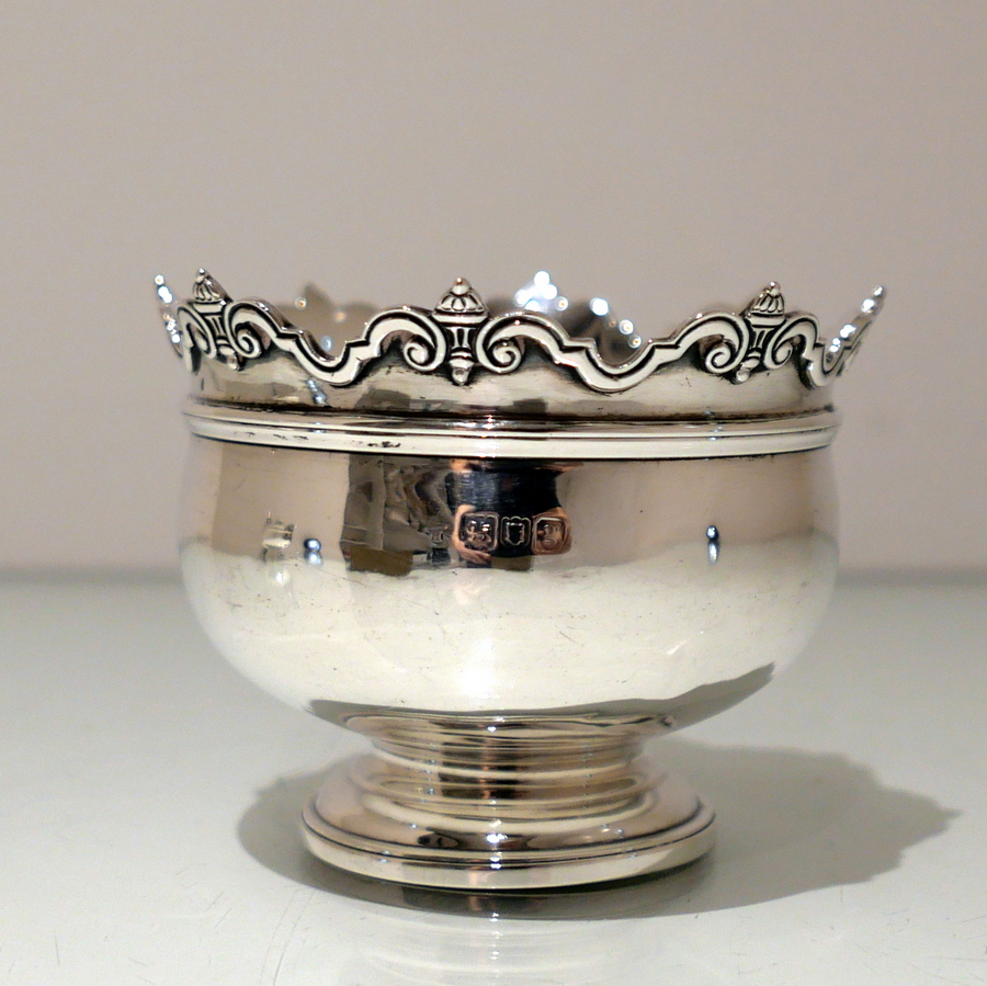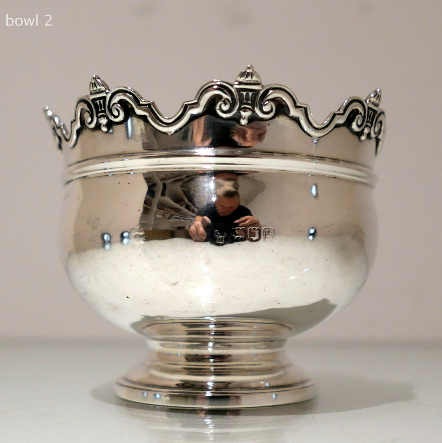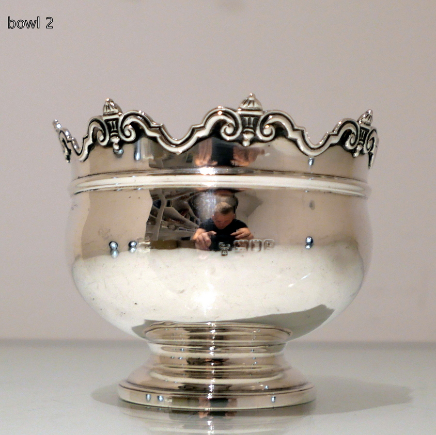 A delightful pair of miniature sterling silver Monteith bowls designed with elegant fixed capes and beautifully shaped bulbous bodies (walls) sitting on a circular pedestal feet.