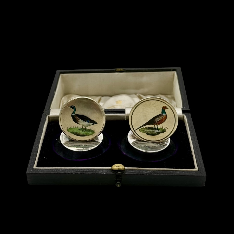 Delight pair of enamelled menu holders decorated with colourful game bird shillings and raised circular bases all beautifully presented in a velvet lined presentation case.