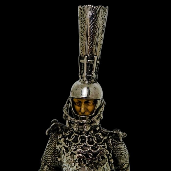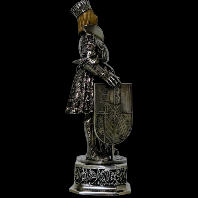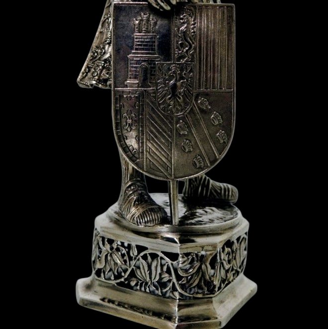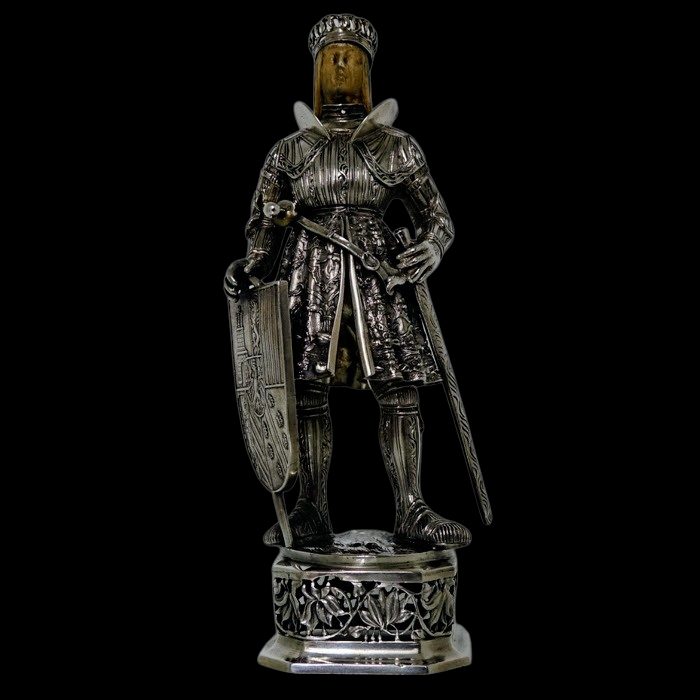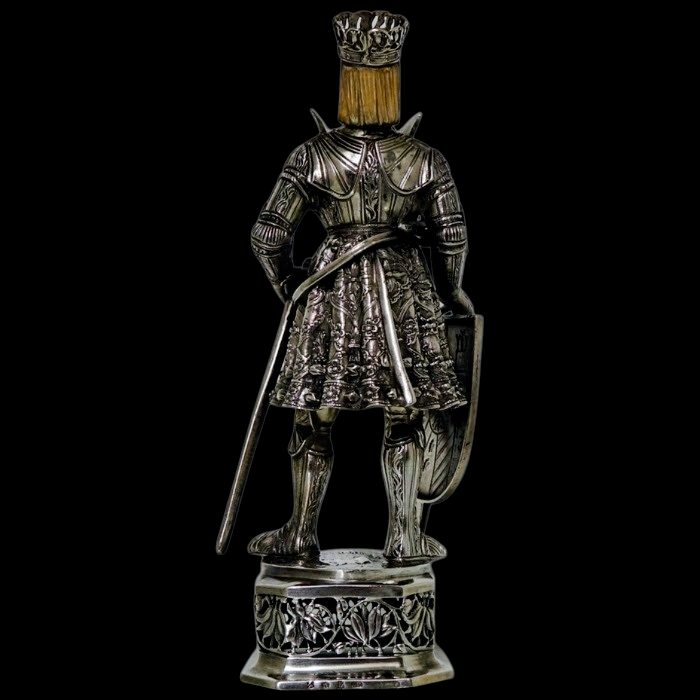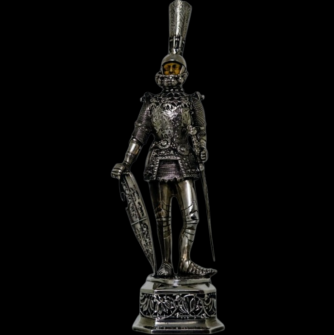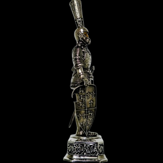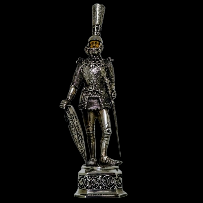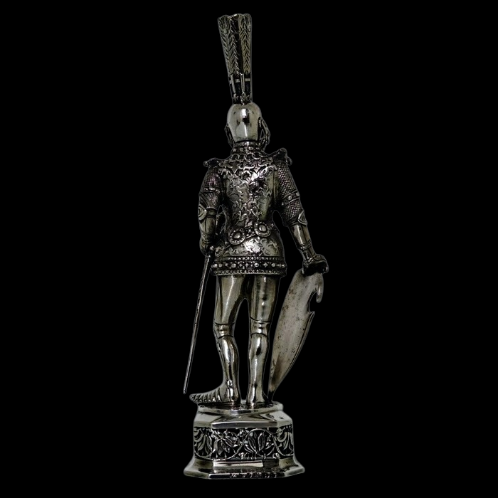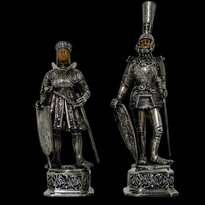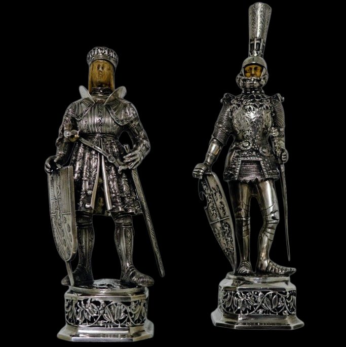 A noble looking pair of German made silver knights designed for the renowned Chester based importer Berthold Muller.  The knights are decorated with chain mail and armour craftsmanship with sword and shield for added decorative effect.  They stand on an ornate silver pierced plymth and the faces are intricately hand carved ivory.