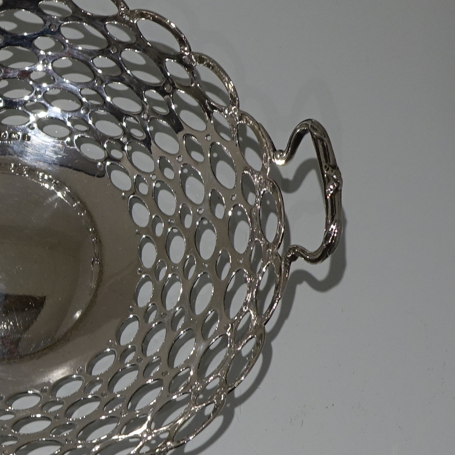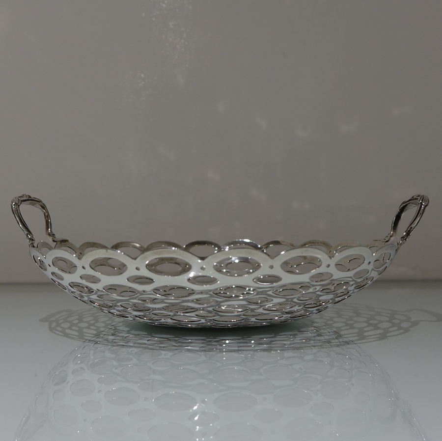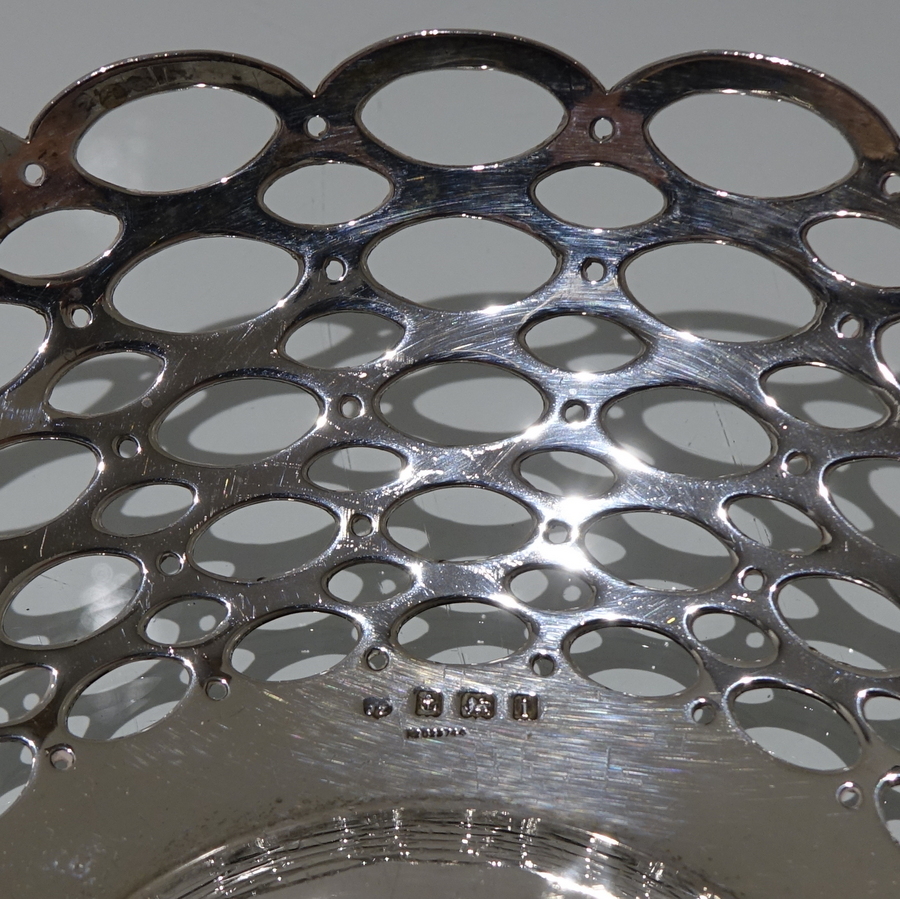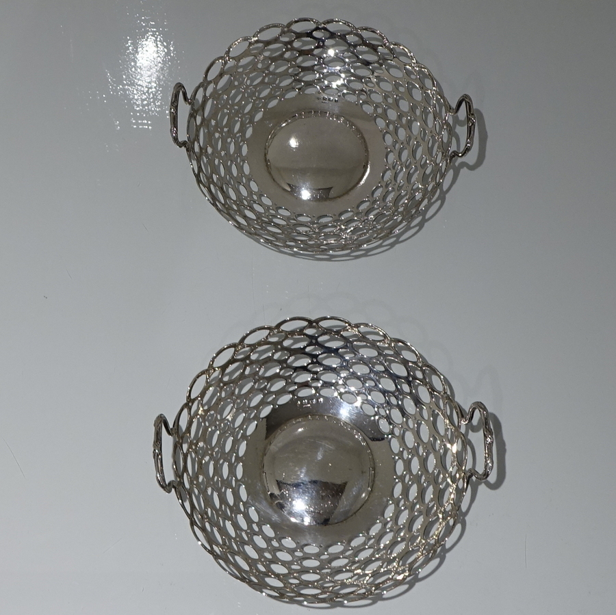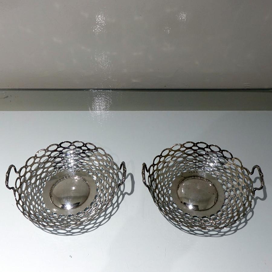 A beautiful pair of circular silver dishes decorated with elegant oval pierced walls and stylish incuse floating handles.