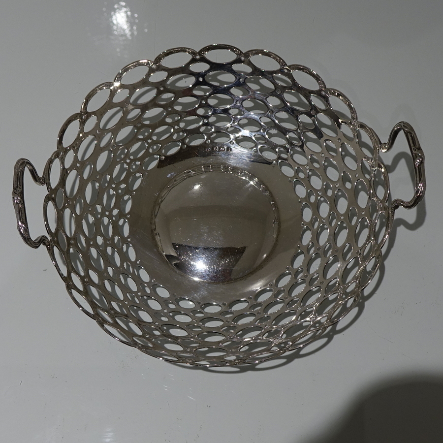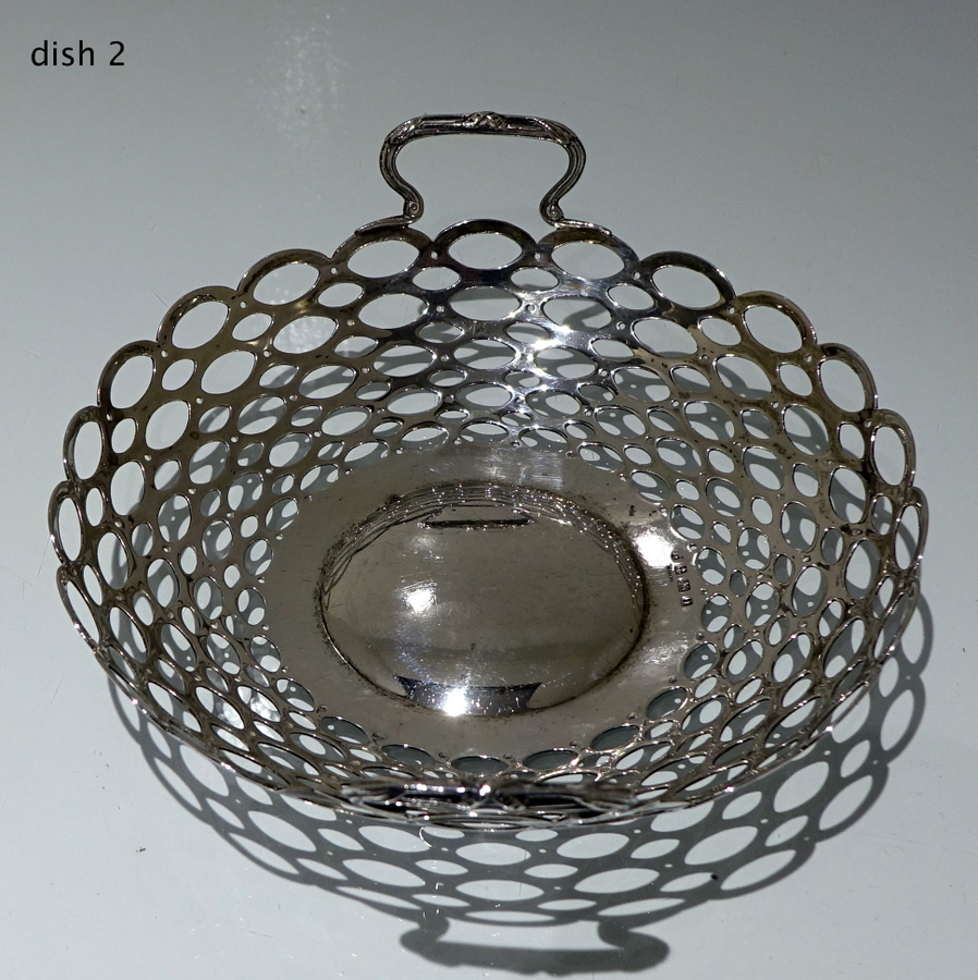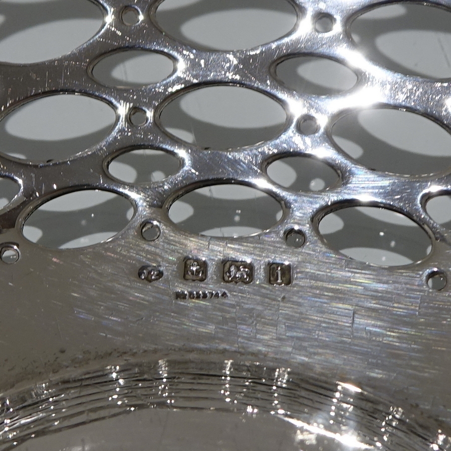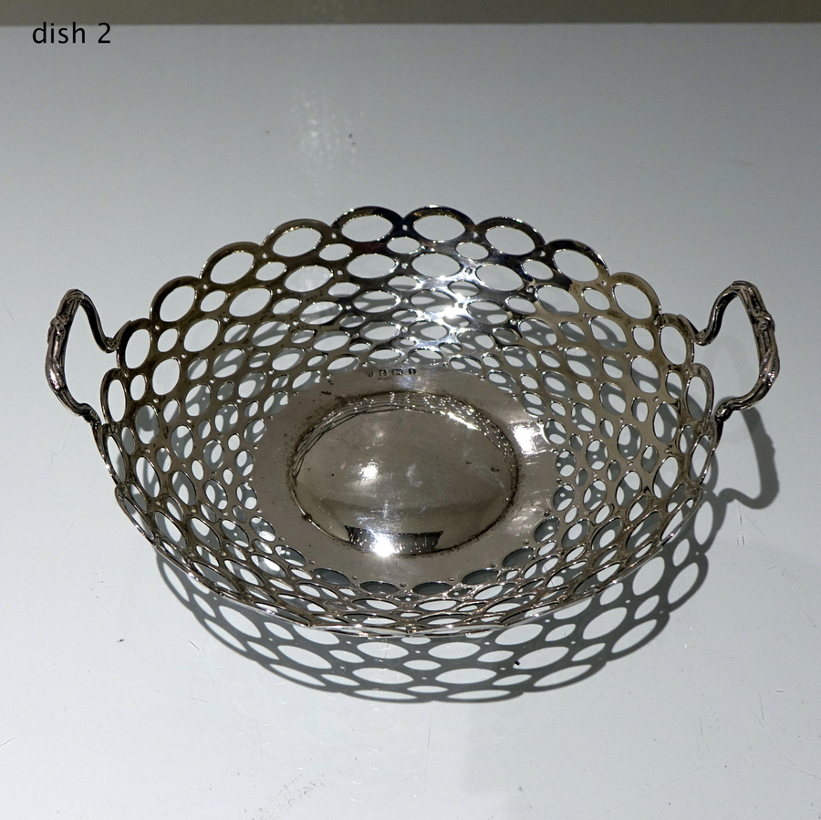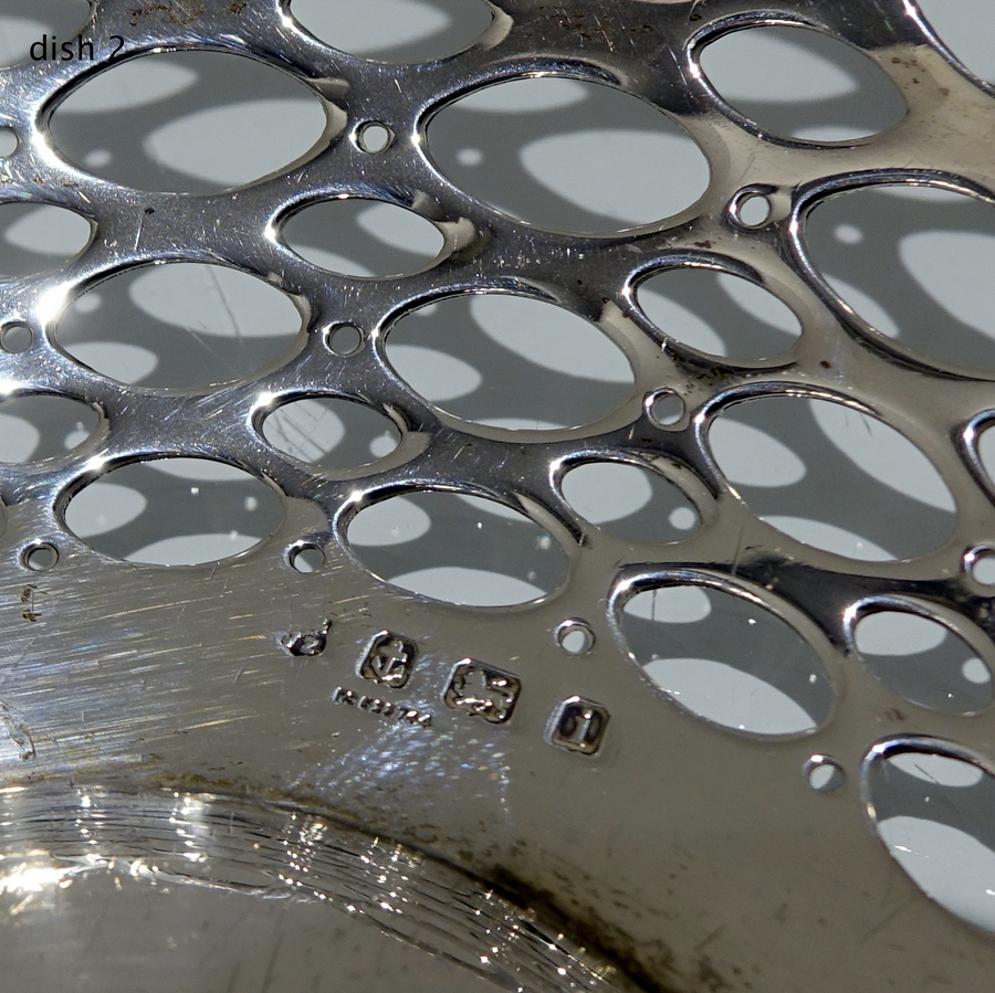 A beautiful pair of circular silver dishes decorated with elegant oval pierced walls and stylish incuse floating handles.