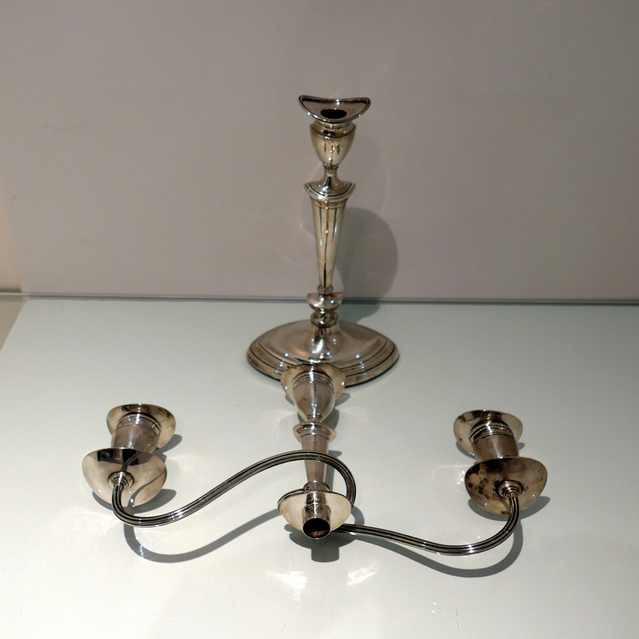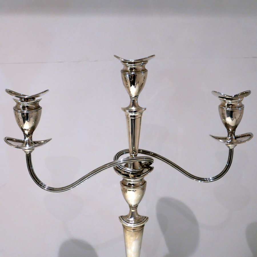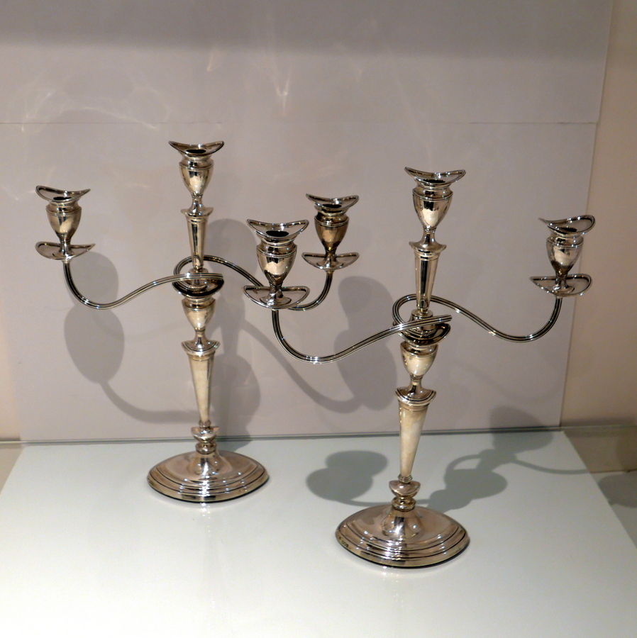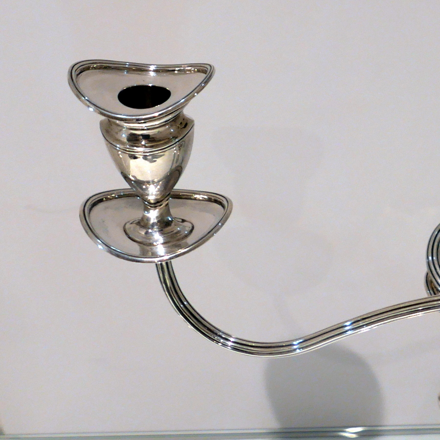 A stylish pair of sterling silver three light plain formed oval candelabra designed with elegant tapering features throughout. Â The elegant branches are detachable.
