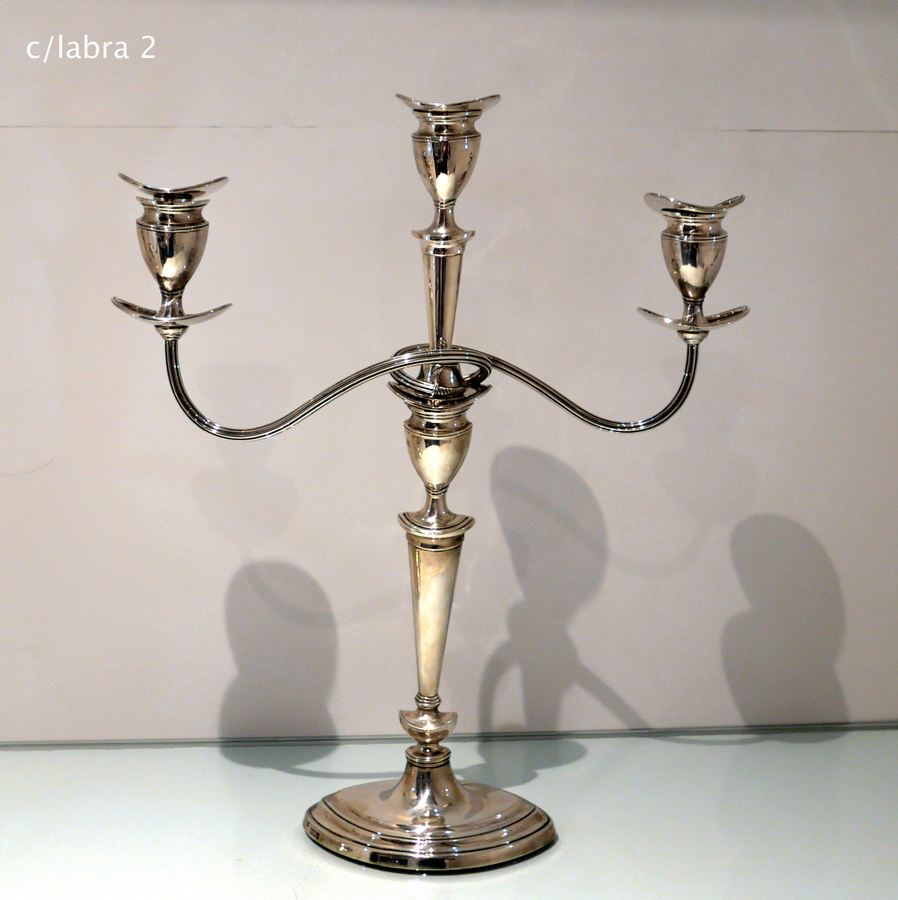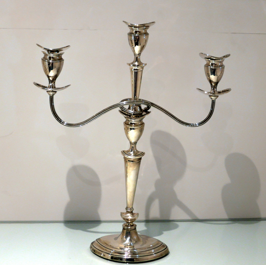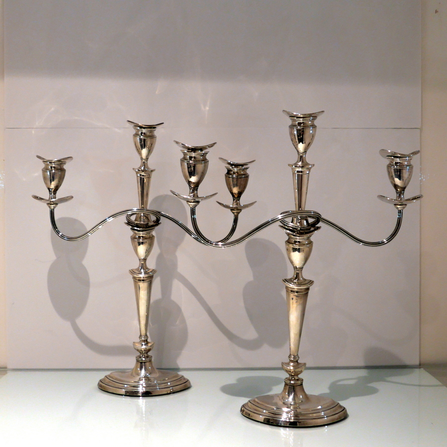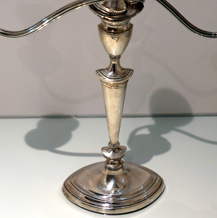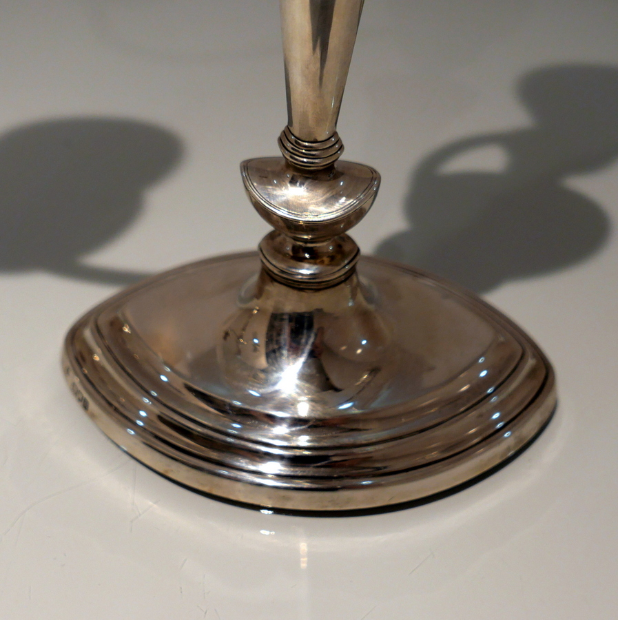 A stylish pair of sterling silver three light plain formed oval candelabra designed with elegant tapering features throughout. Â The elegant branches are detachable.