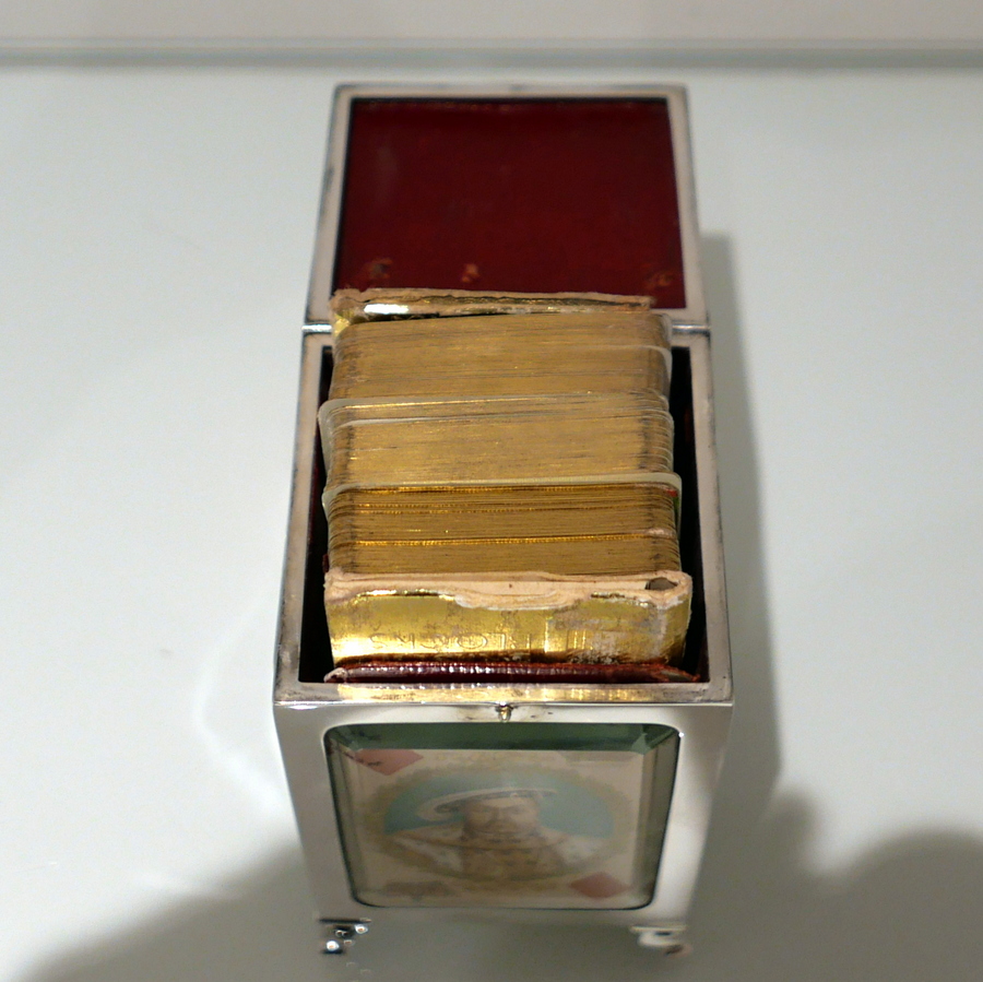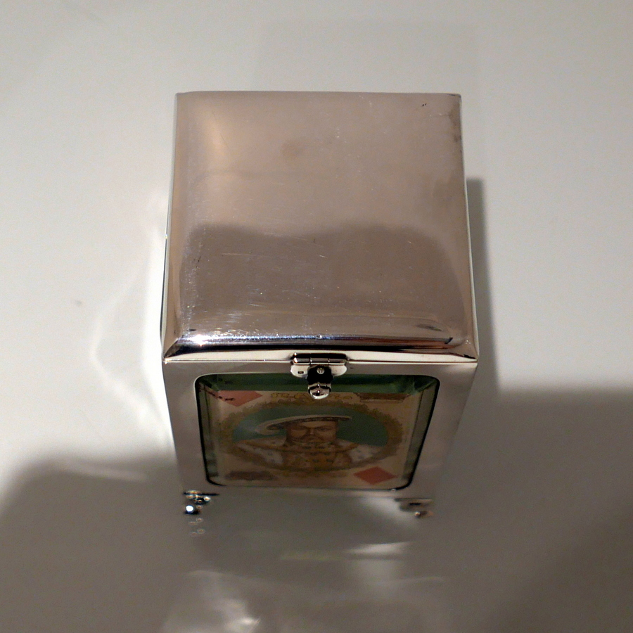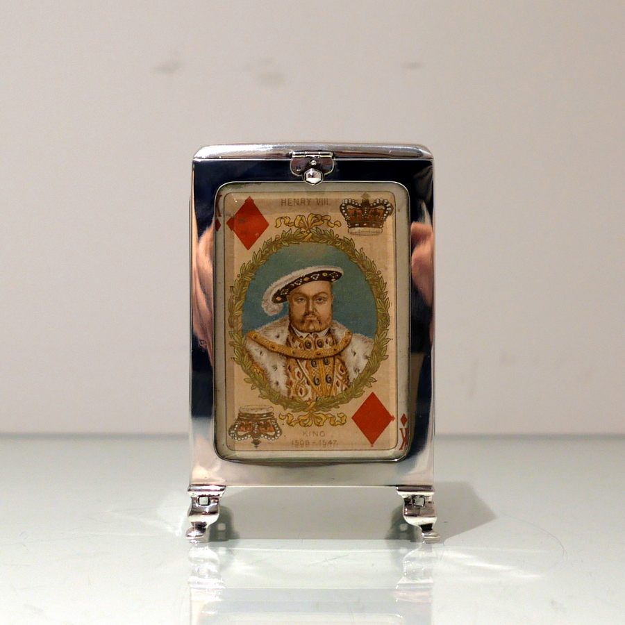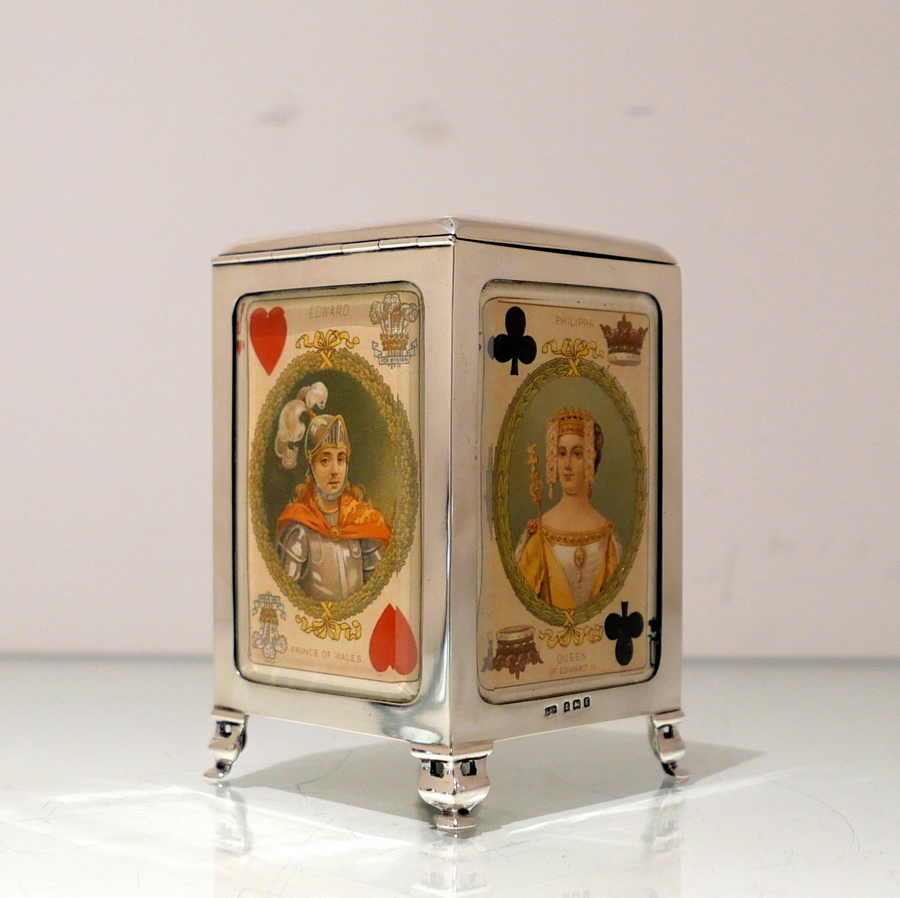 A truly fine Edwardian silver playing card box designed with open sides displaying antique playing cards framed behind beveled glass and plain formed silver surrounds. Â The lid is hinged and the red leather lined interior has a delightful spring loaded card holder action.