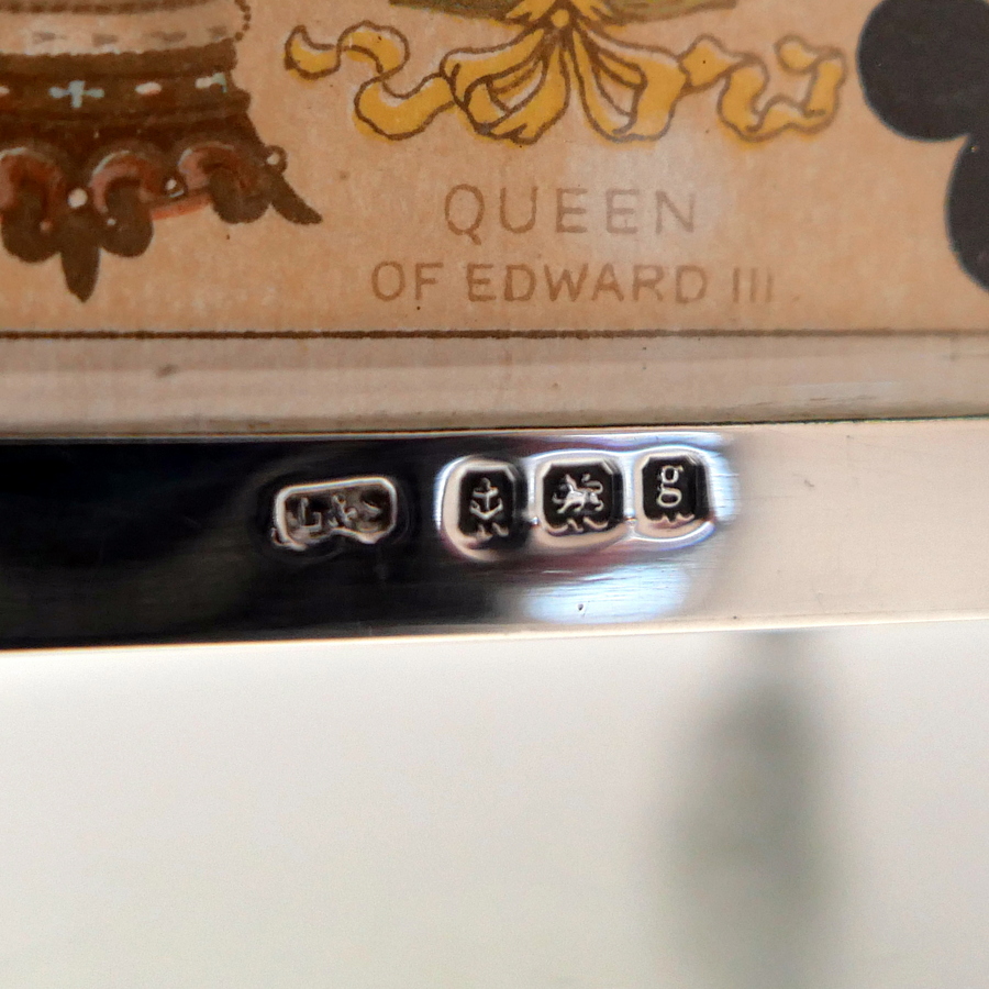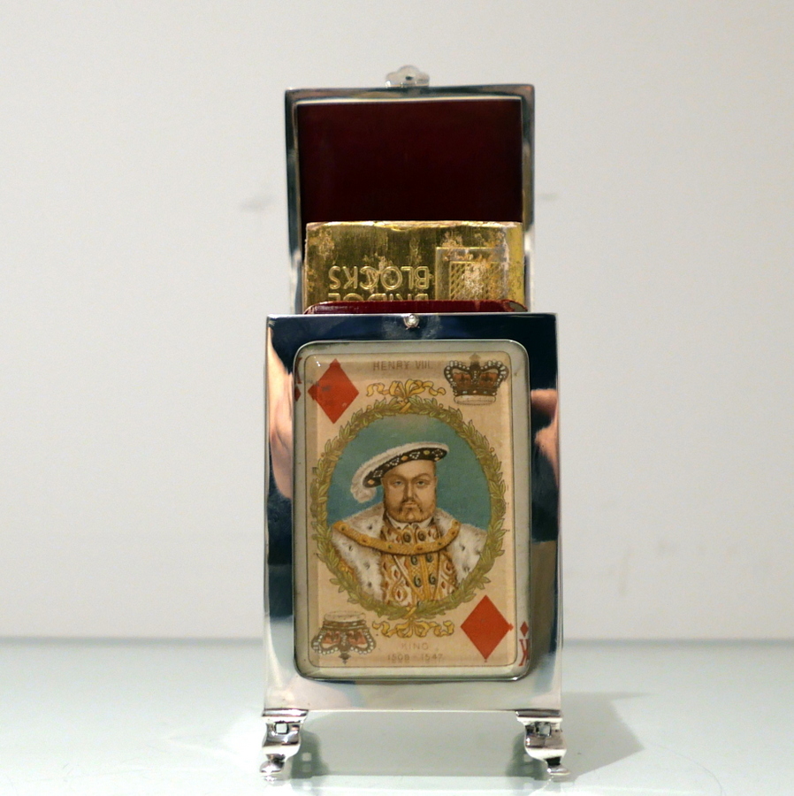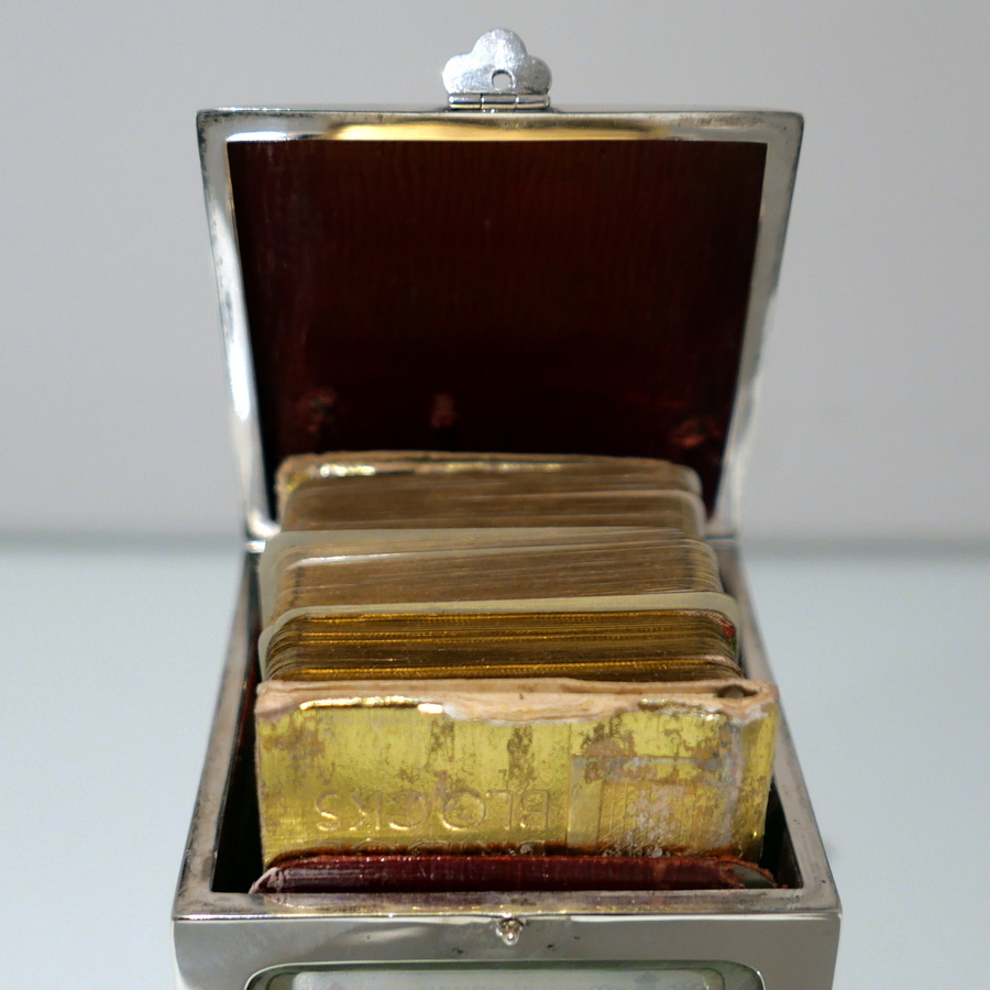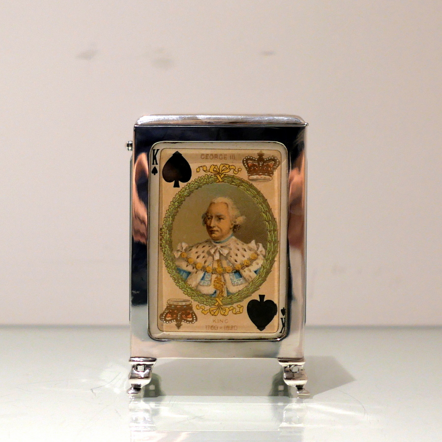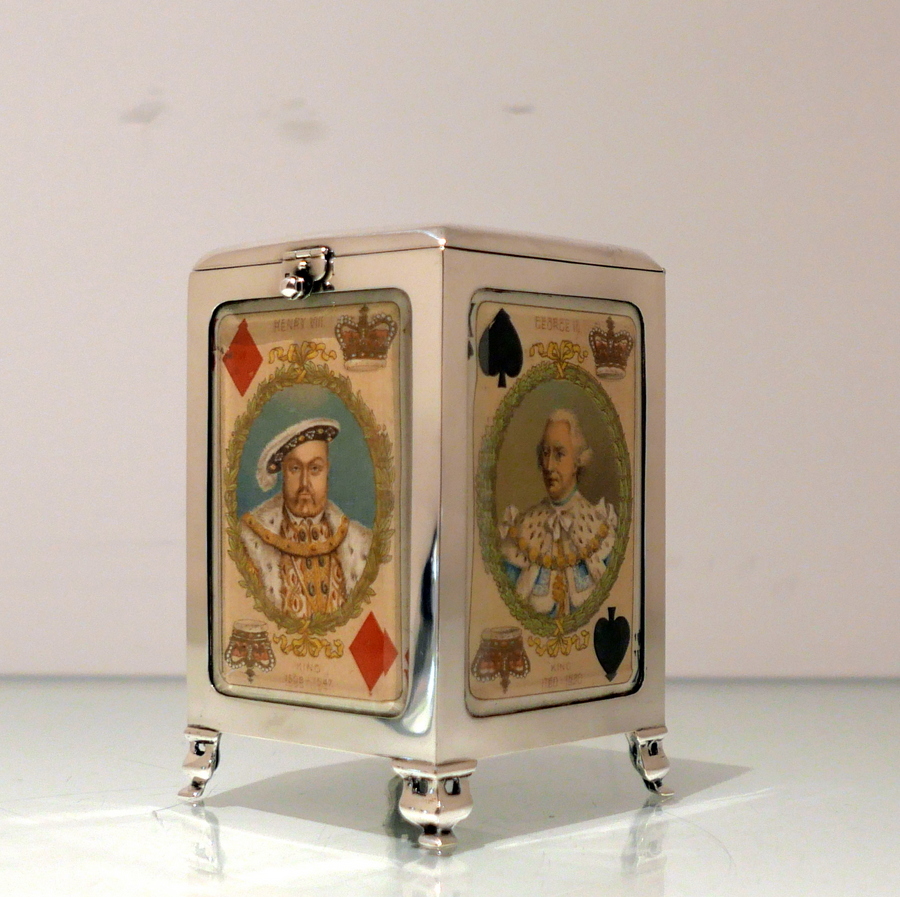 A truly fine Edwardian silver playing card box designed with open sides displaying antique playing cards framed behind beveled glass and plain formed silver surrounds. Â The lid is hinged and the red leather lined interior has a delightful spring loaded card holder action.