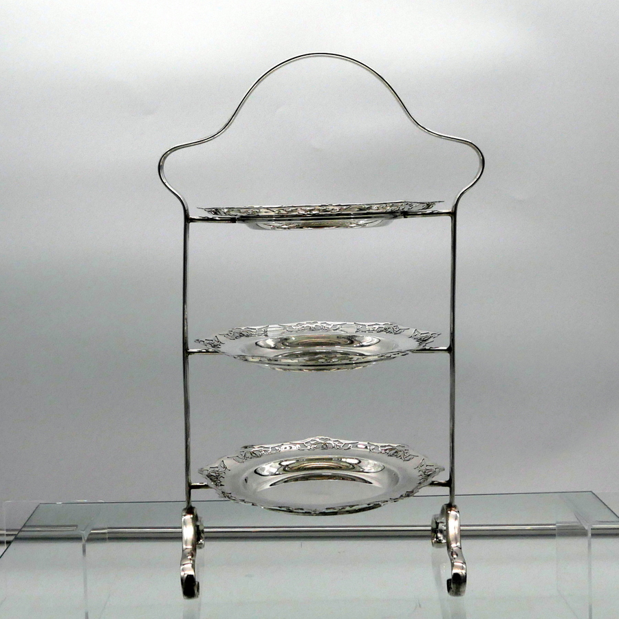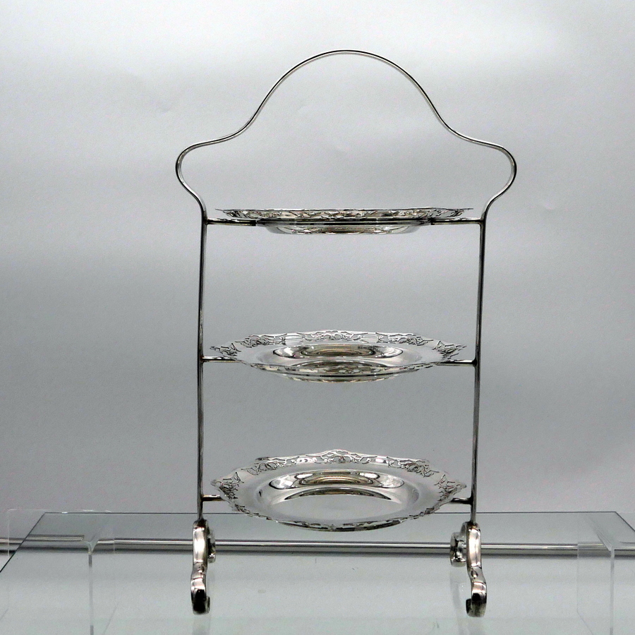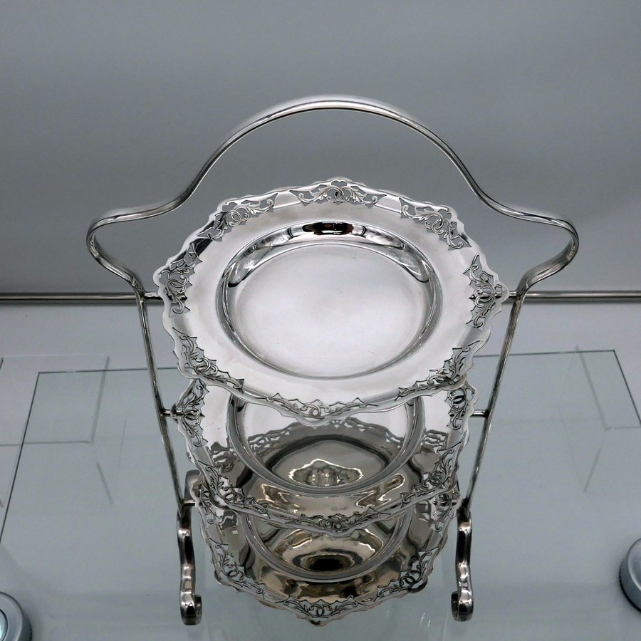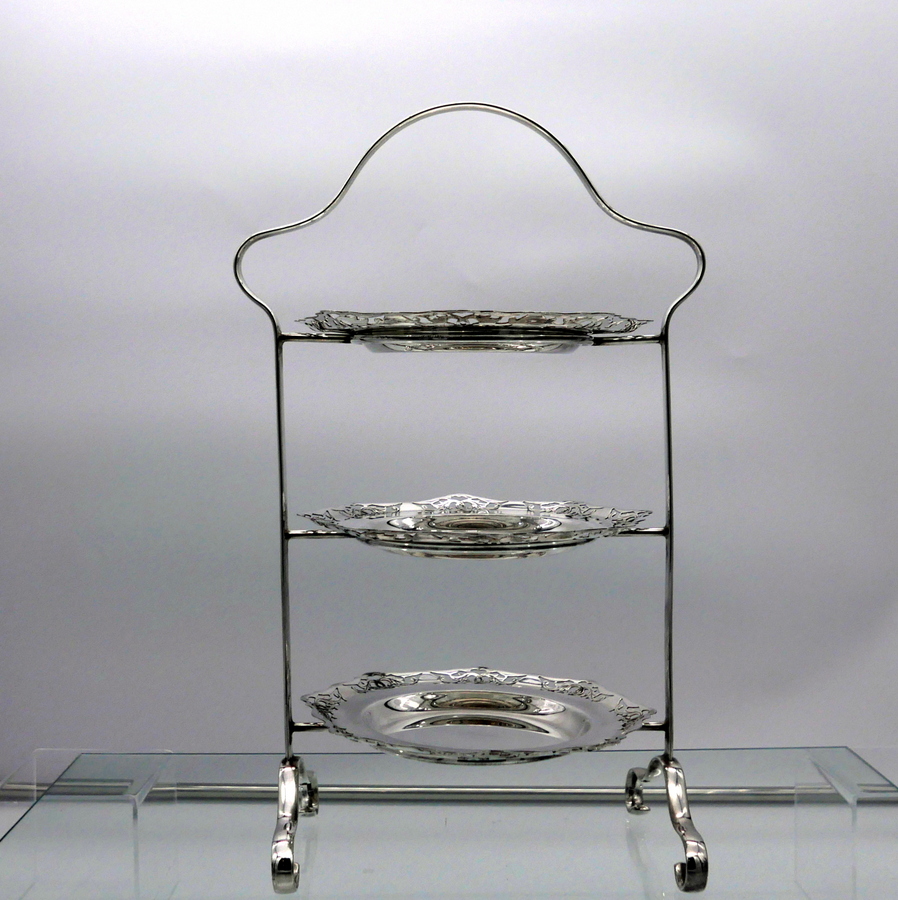 An Edwardian silverplate three tier cake stand designed with an elegant shaped wire frame and three handsome detachable shaped circular pierced edged plates.