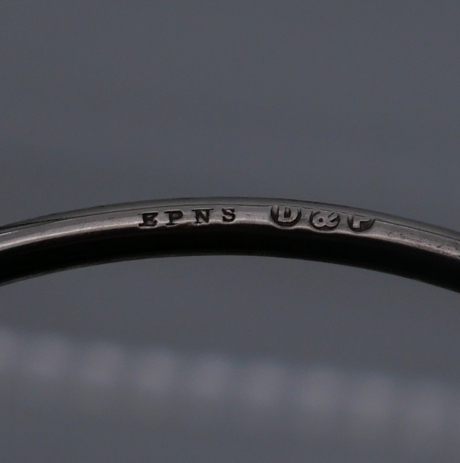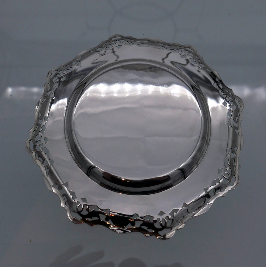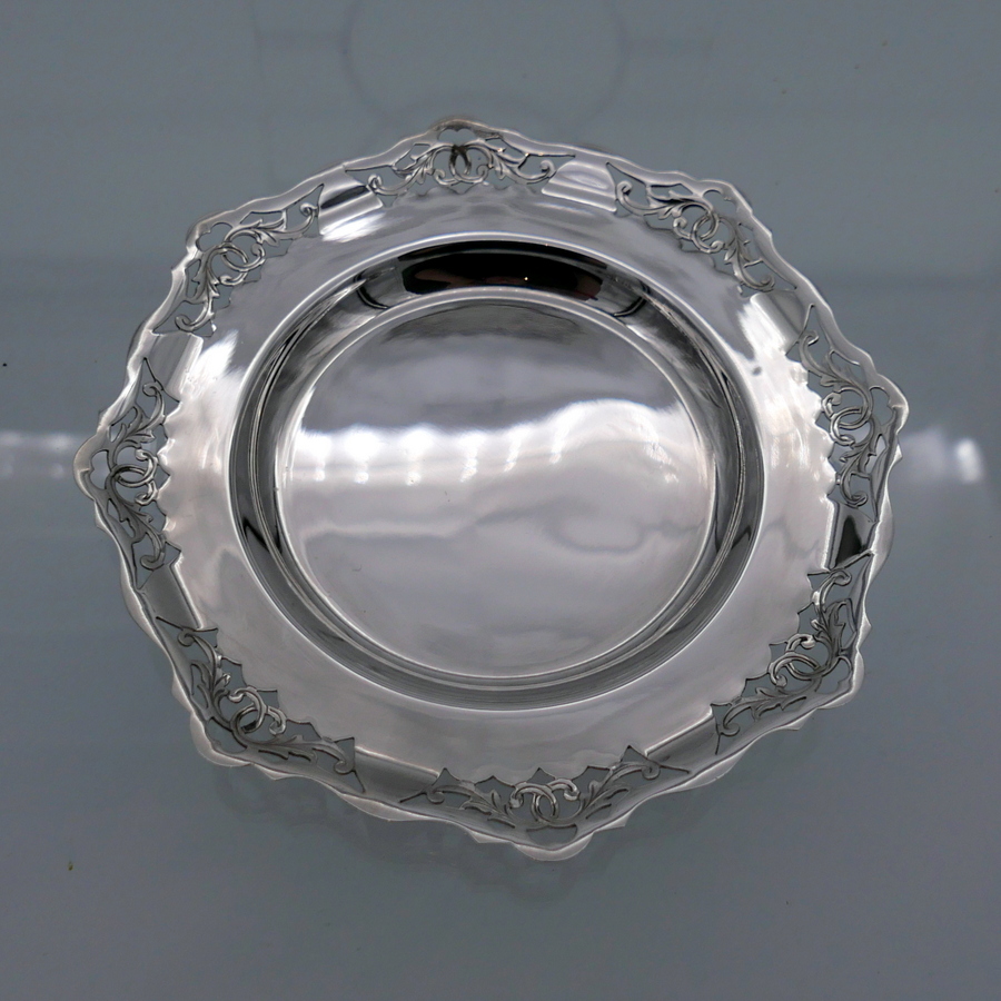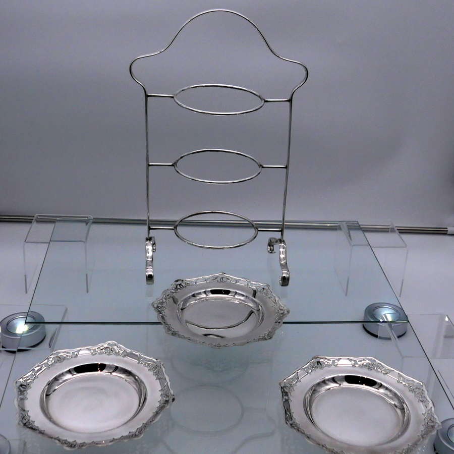 An Edwardian silverplate three tier cake stand designed with an elegant shaped wire frame and three handsome detachable shaped circular pierced edged plates.
