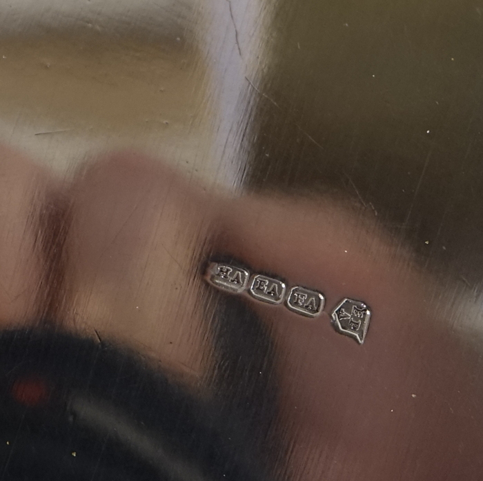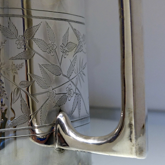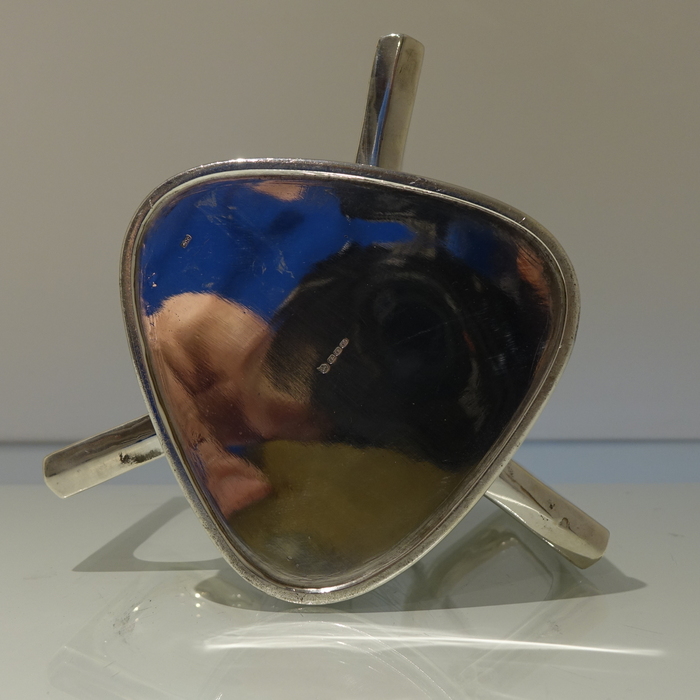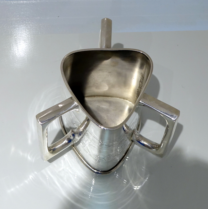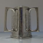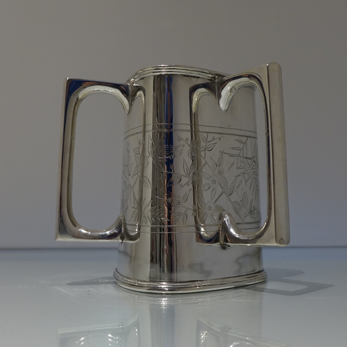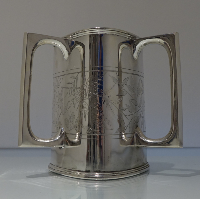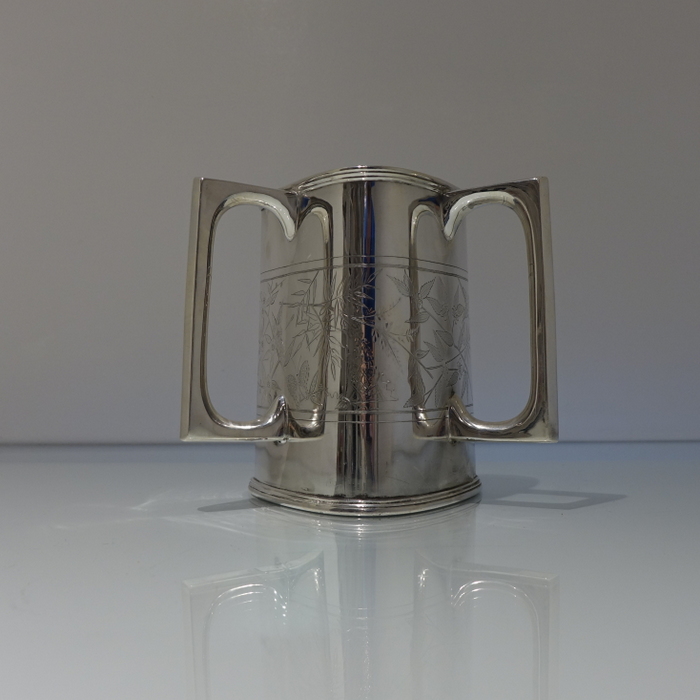 A very rare and extremely stylish triangular shaped cornered three handled cup with a central band of elegant floral engraving threading through the centre of the handles for artistic design.