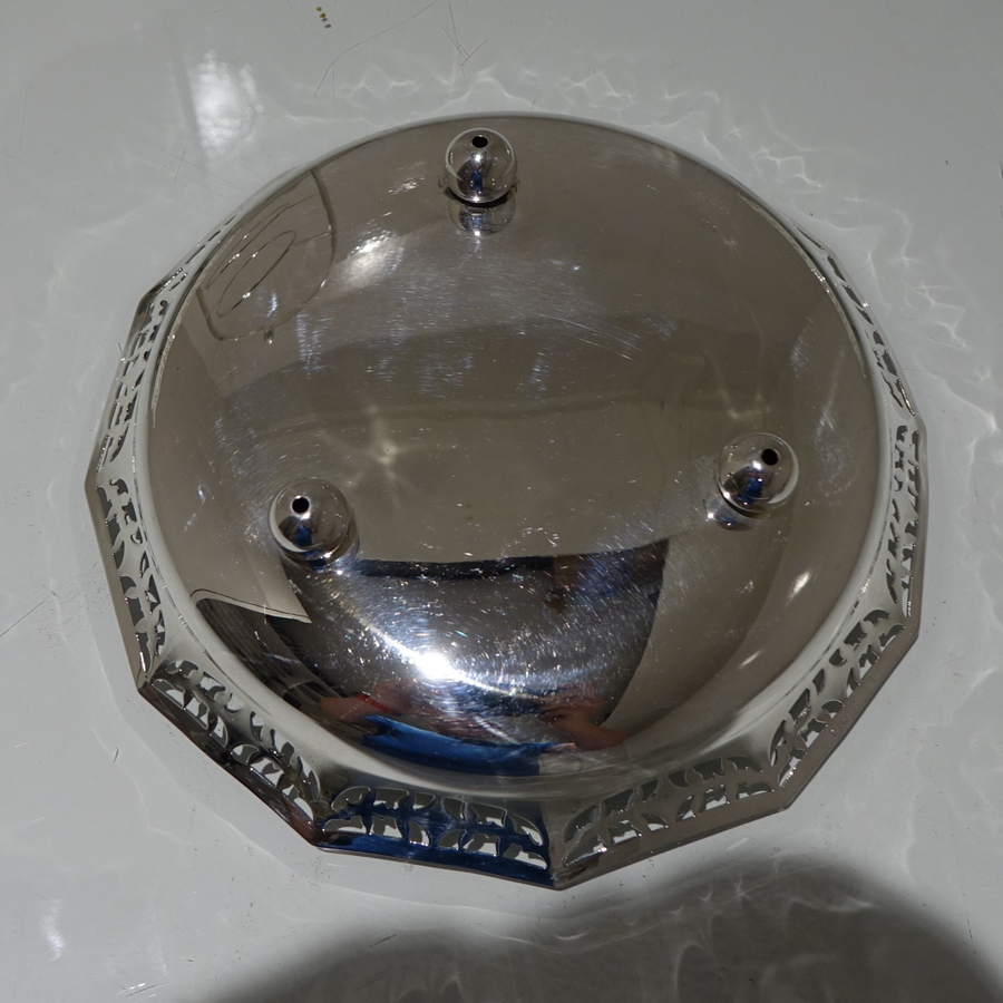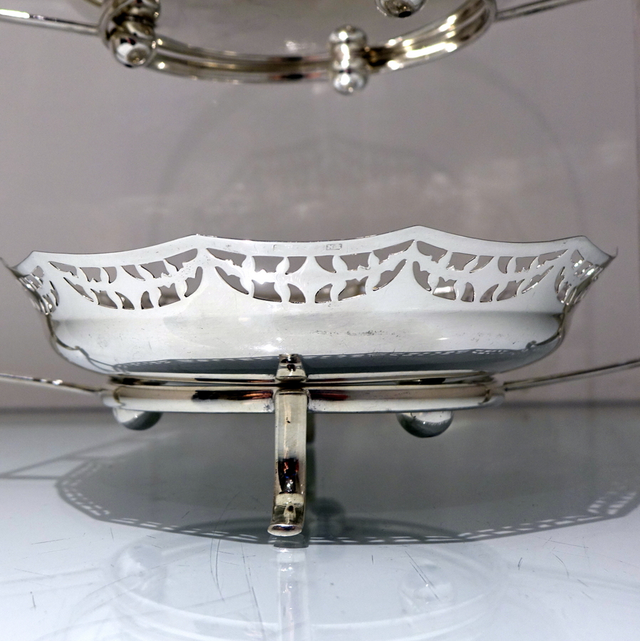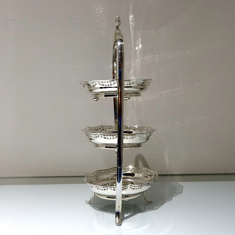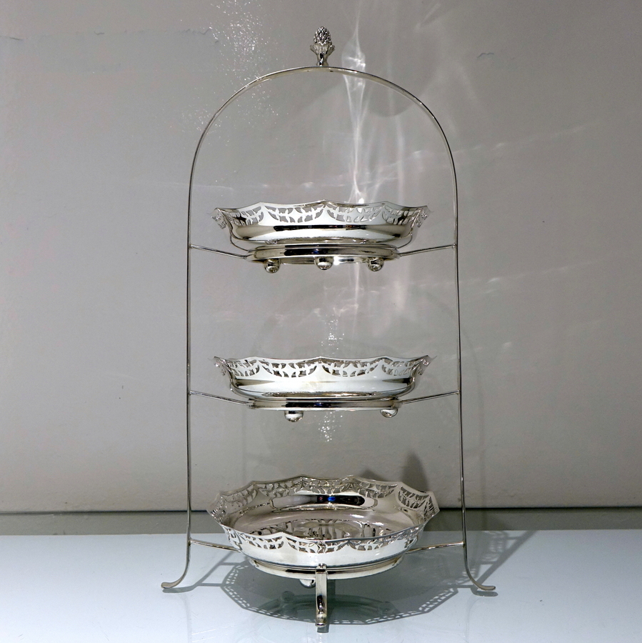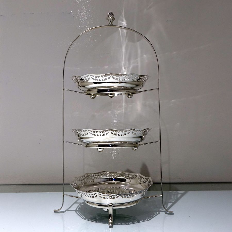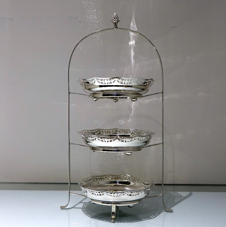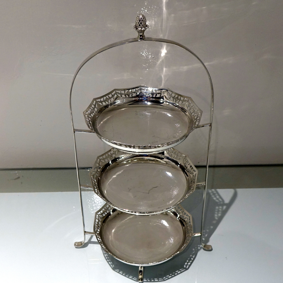 A highly desirable silverplated cake stand designed with three detachable circular dishes which have elegant pierced upper galleries for decoration. Â The dishes then sit into a “tower” frame which has stylishly been shaped out of thick wire.