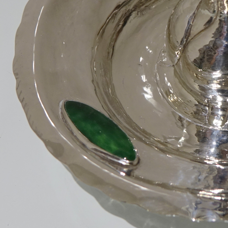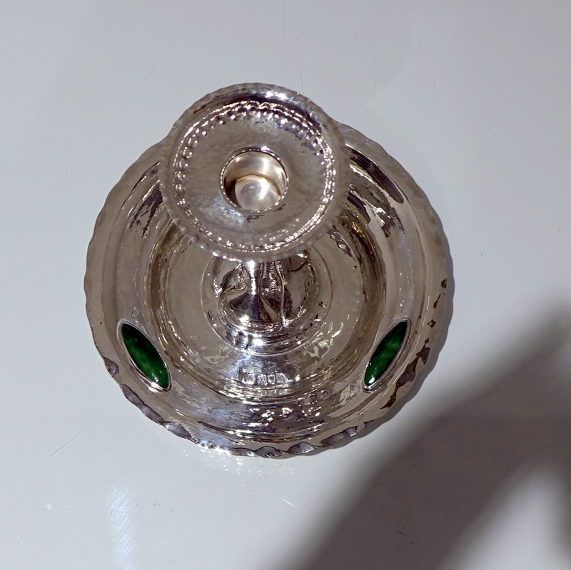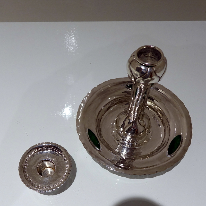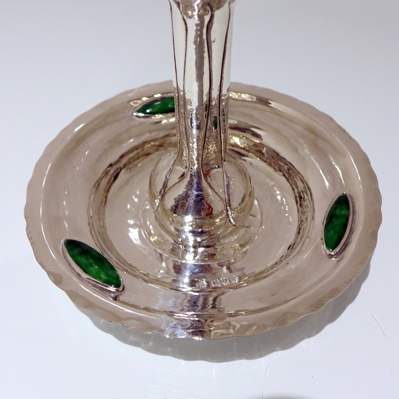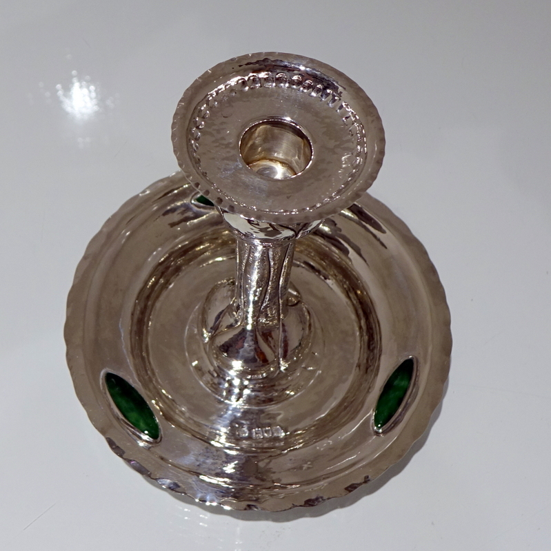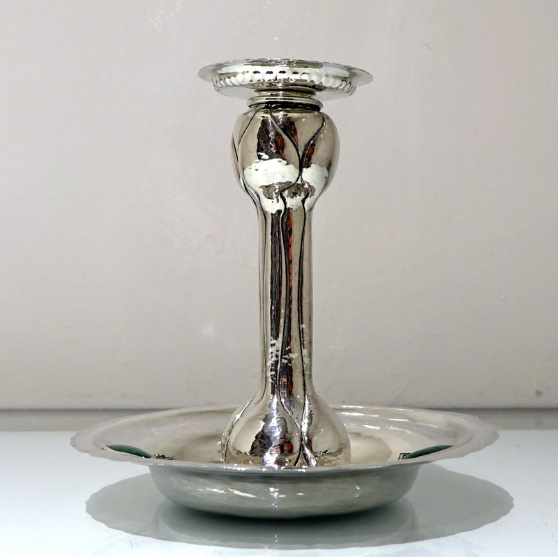 A highly collectable art nouveau silver chamberstick designed with an elegant “hammered” finish and three oval enamelled plaques. Â The central column has floral designs for additional decoration.