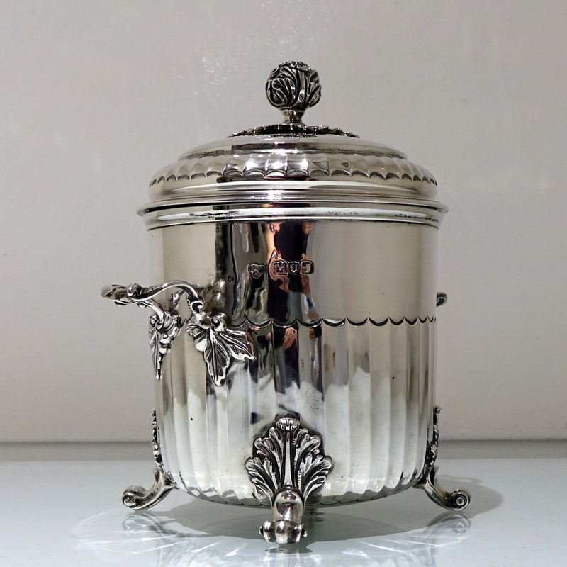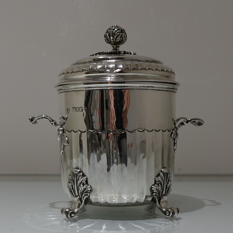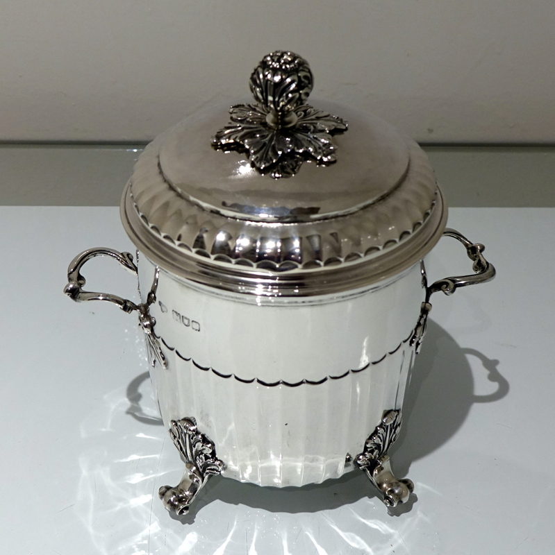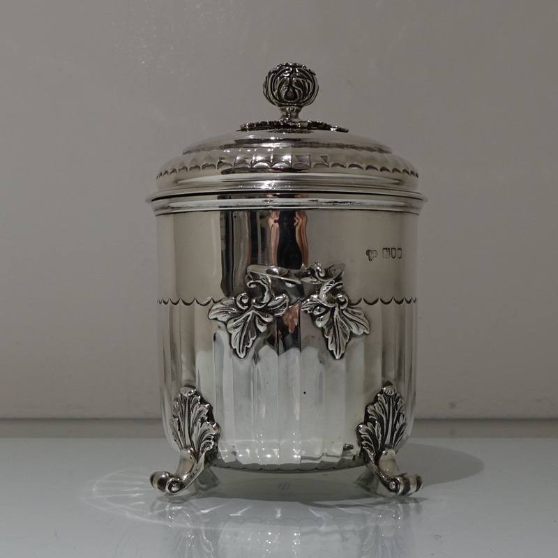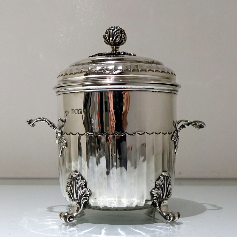 A beautiful half fluted design circular biscuit box with ornate applied floral feet and handles for decoration. Â The lid is detachable and crowned with a stylish acorn finial.