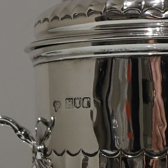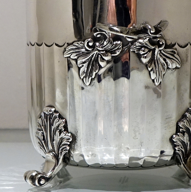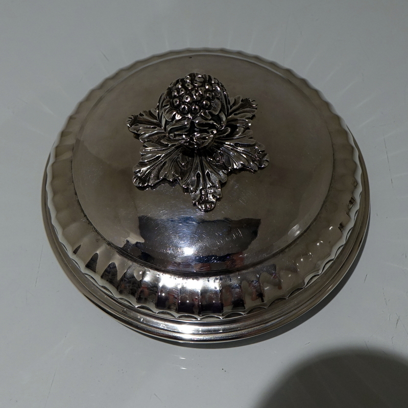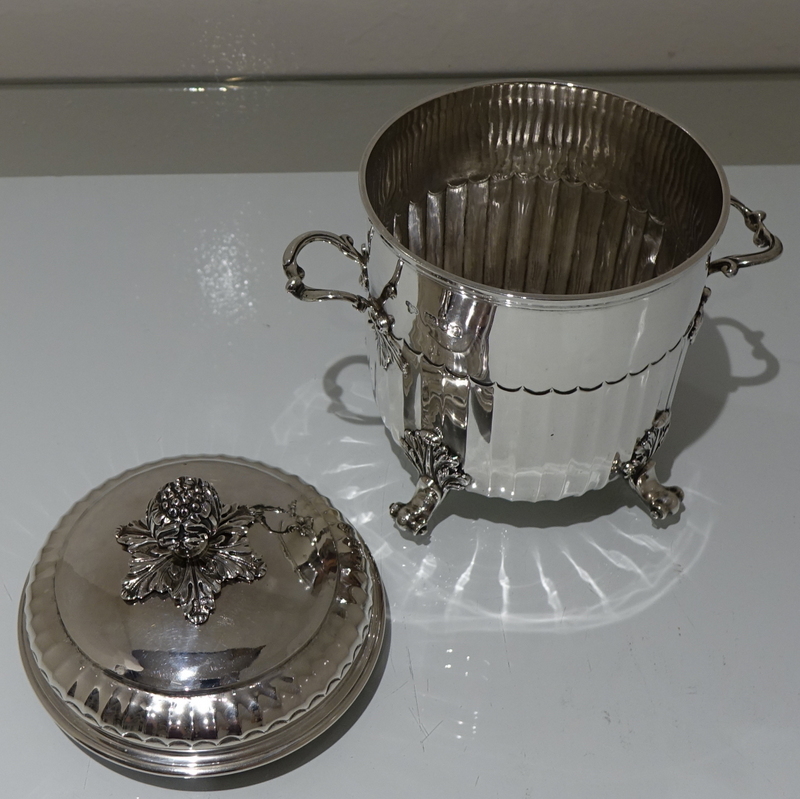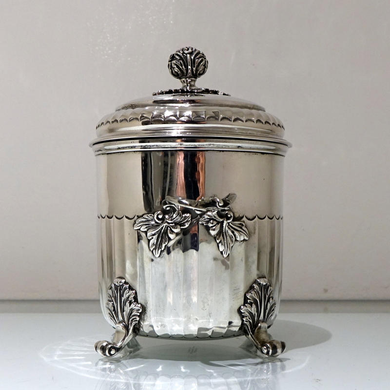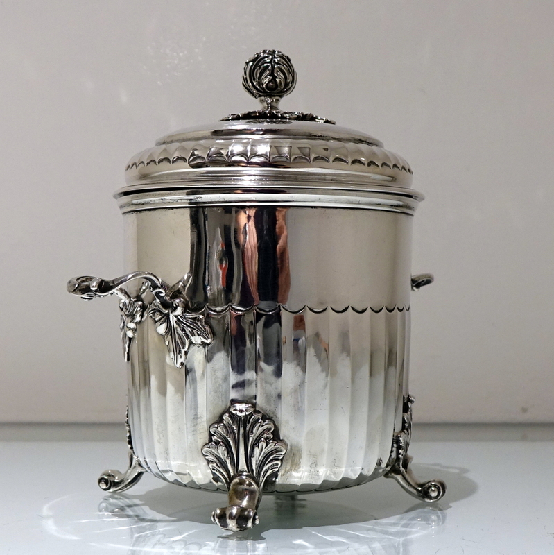 A beautiful half fluted design circular biscuit box with ornate applied floral feet and handles for decoration. Â The lid is detachable and crowned with a stylish acorn finial.