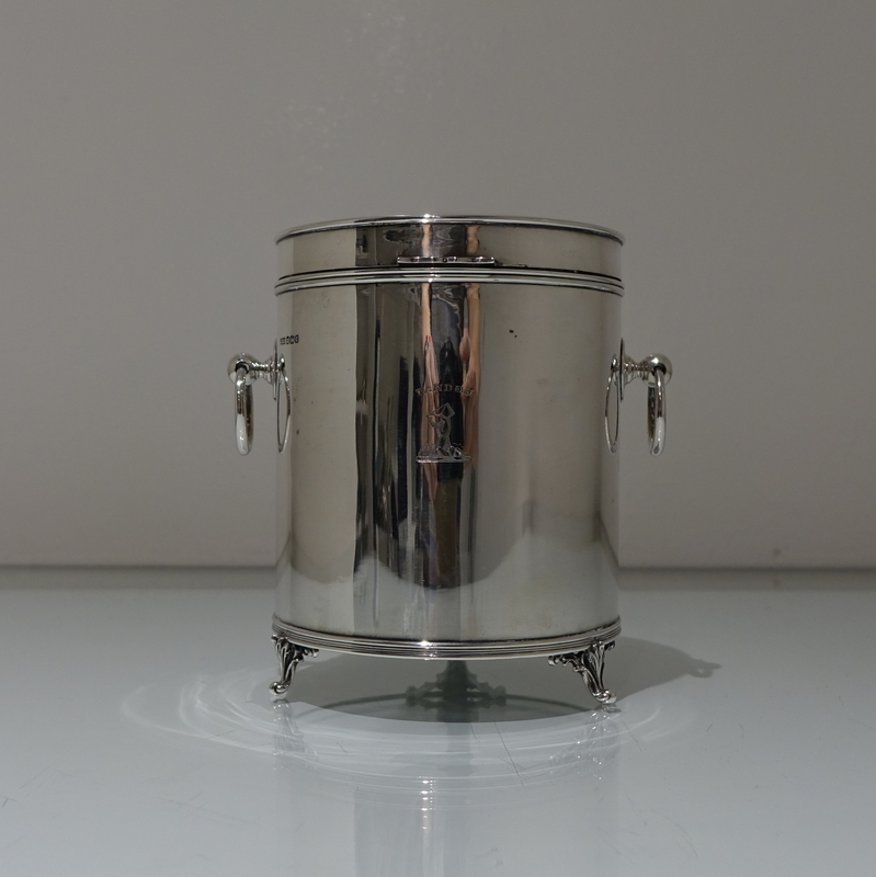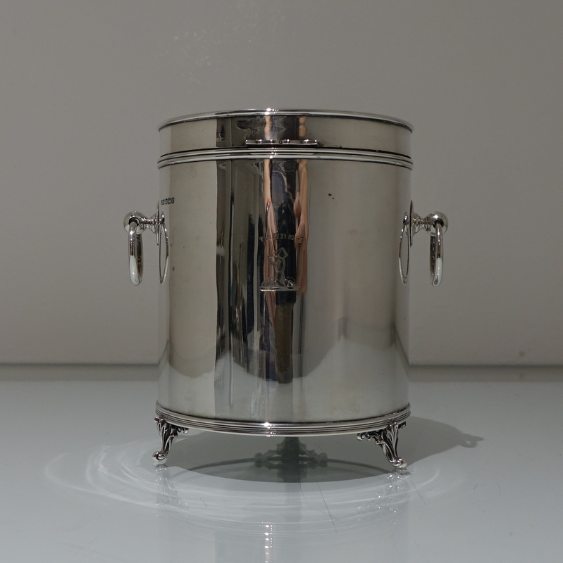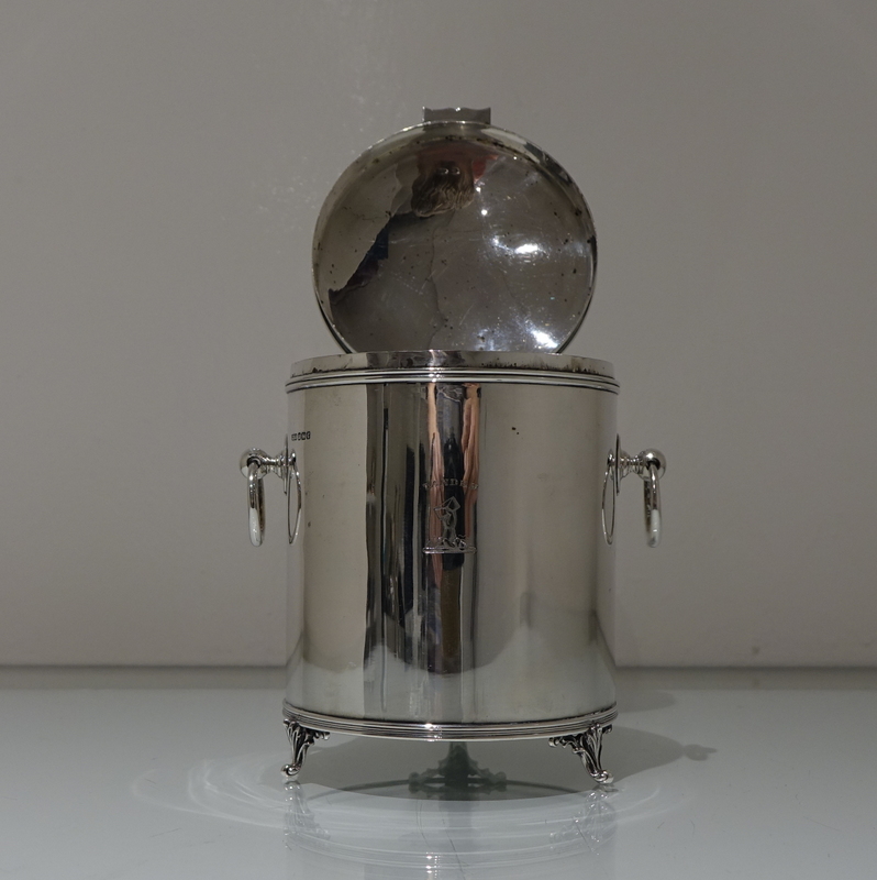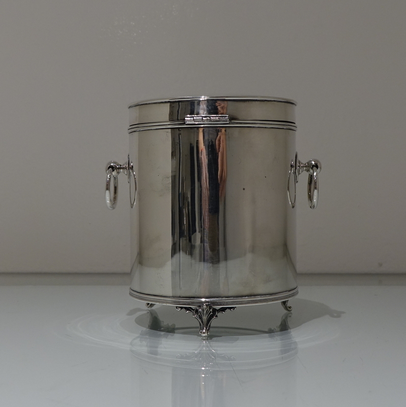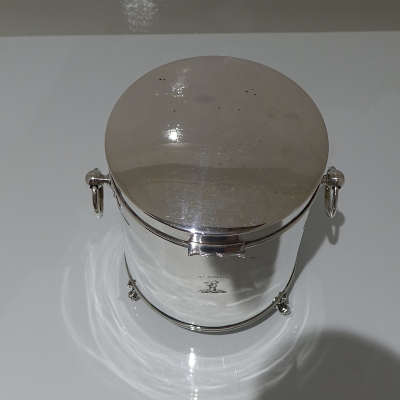 A very sweet and extremely desirable drum shaped silver biscuit box with two elegant drop ring handles. Â The lid of the box is hinged and the centre front has a stylish contemporary crest for importance.
