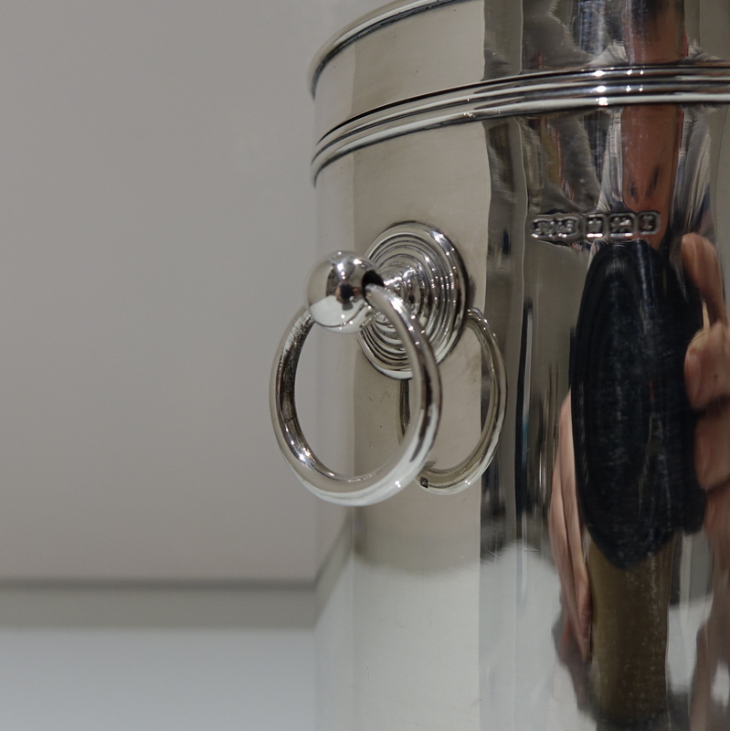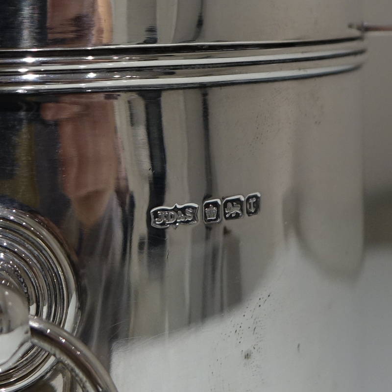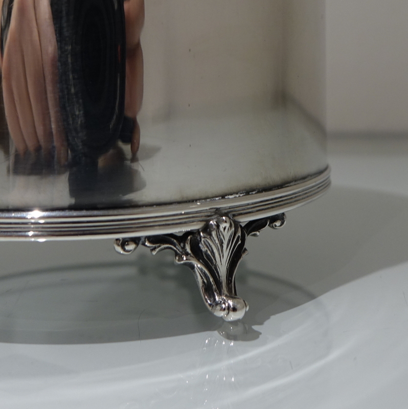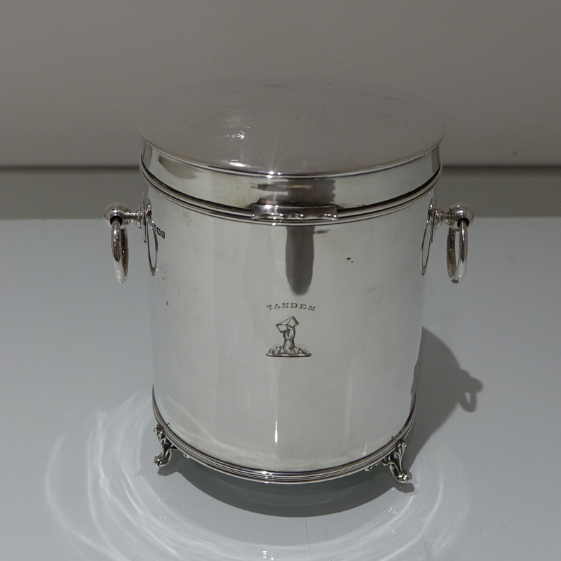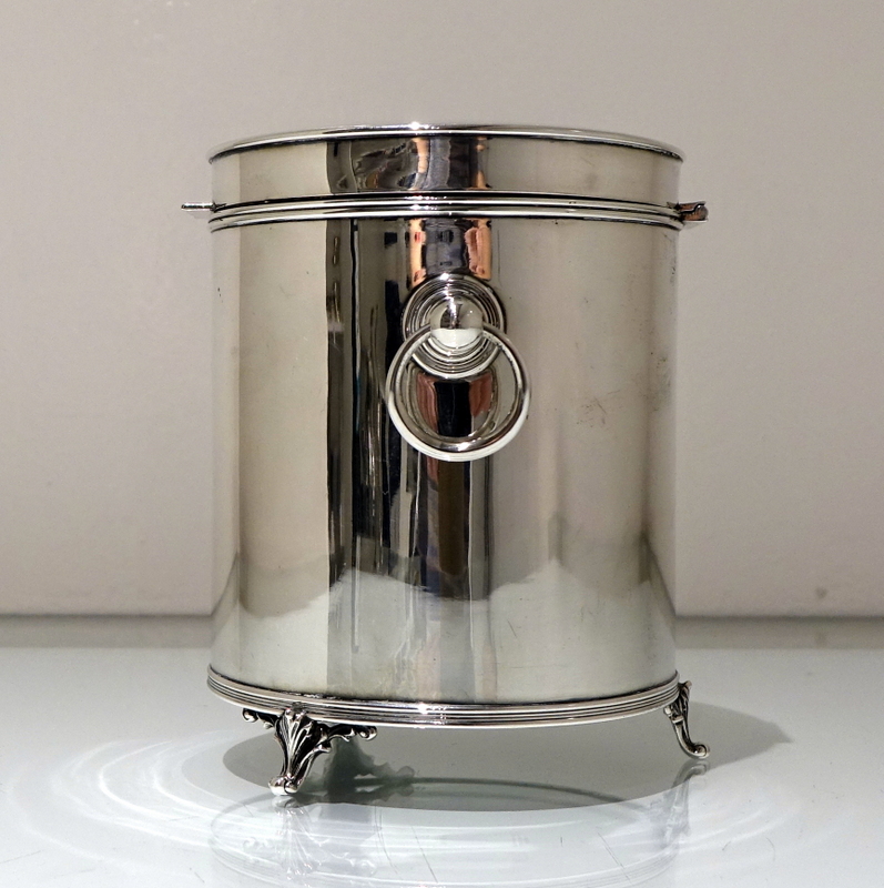 A very sweet and extremely desirable drum shaped silver biscuit box with two elegant drop ring handles. Â The lid of the box is hinged and the centre front has a stylish contemporary crest for importance.