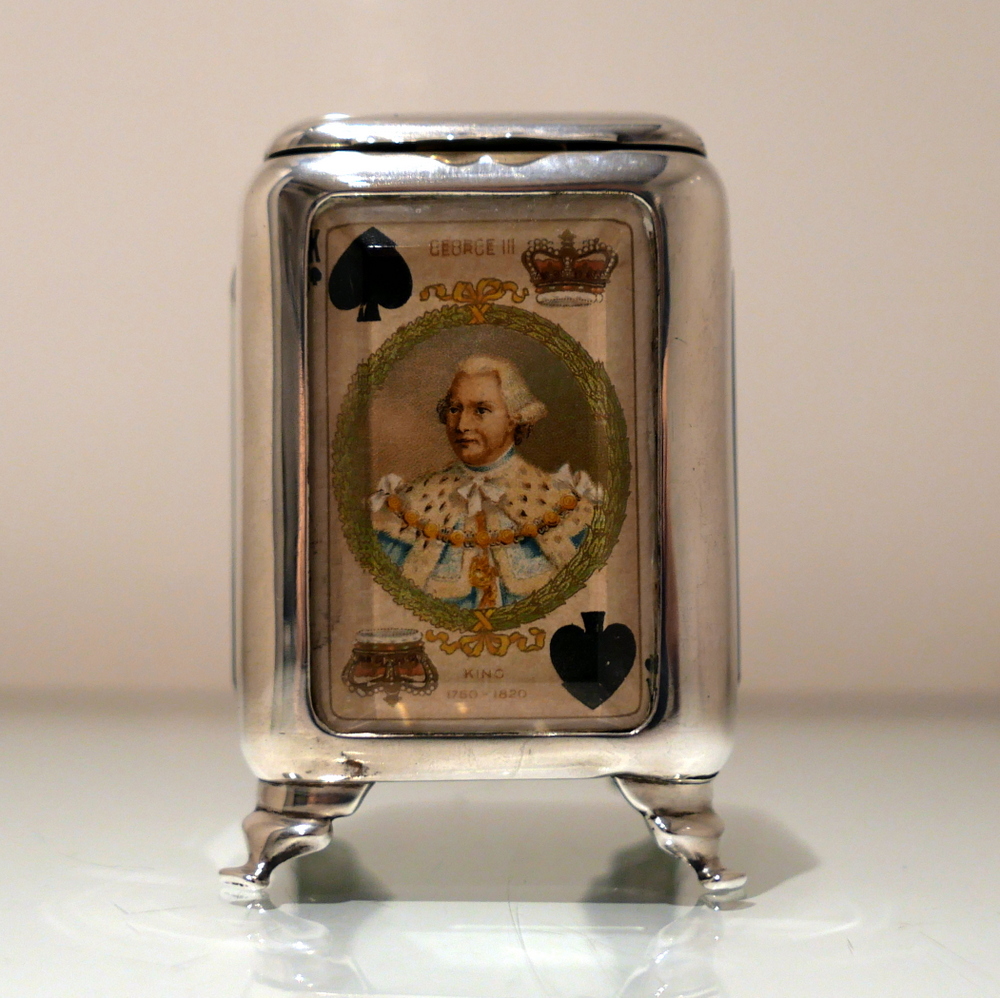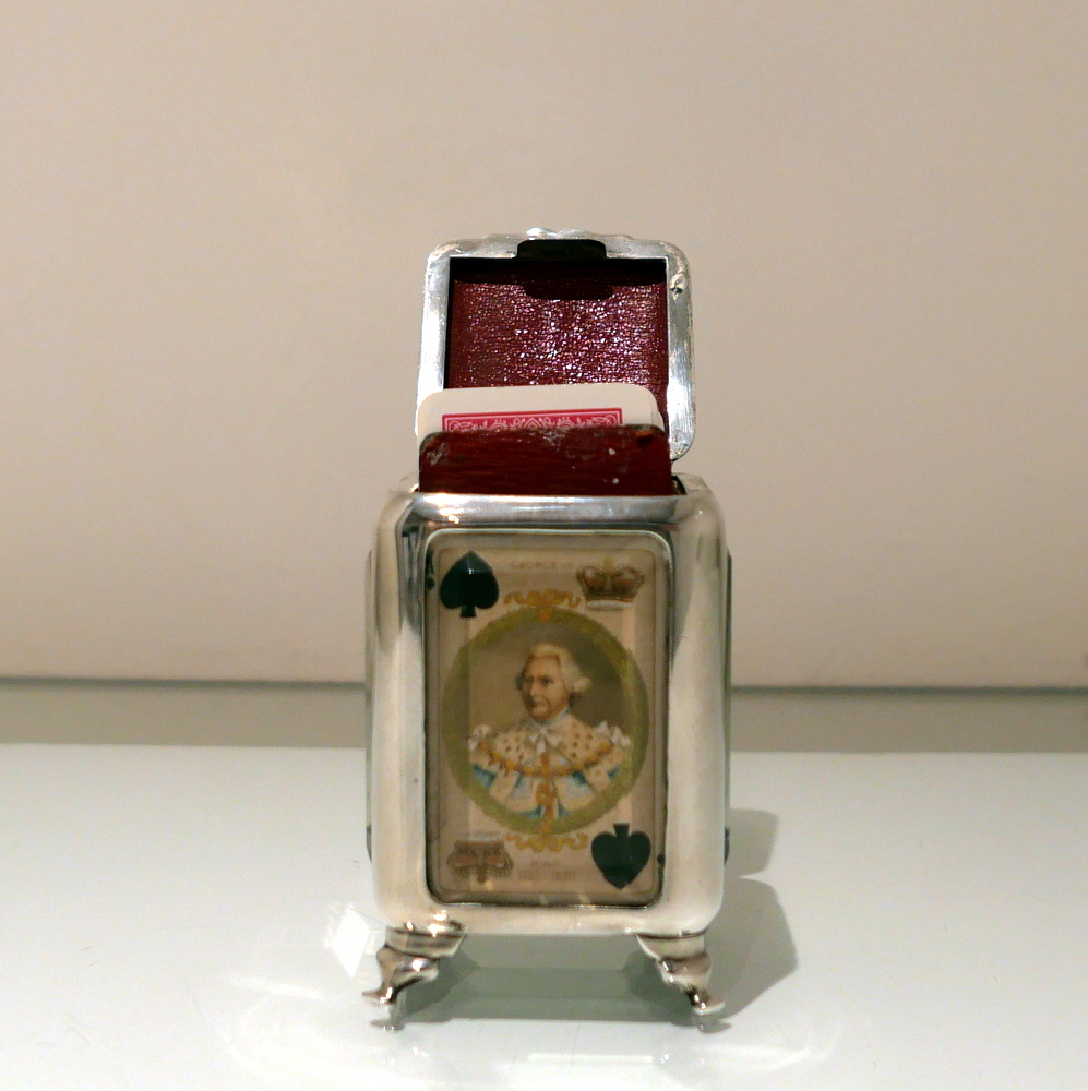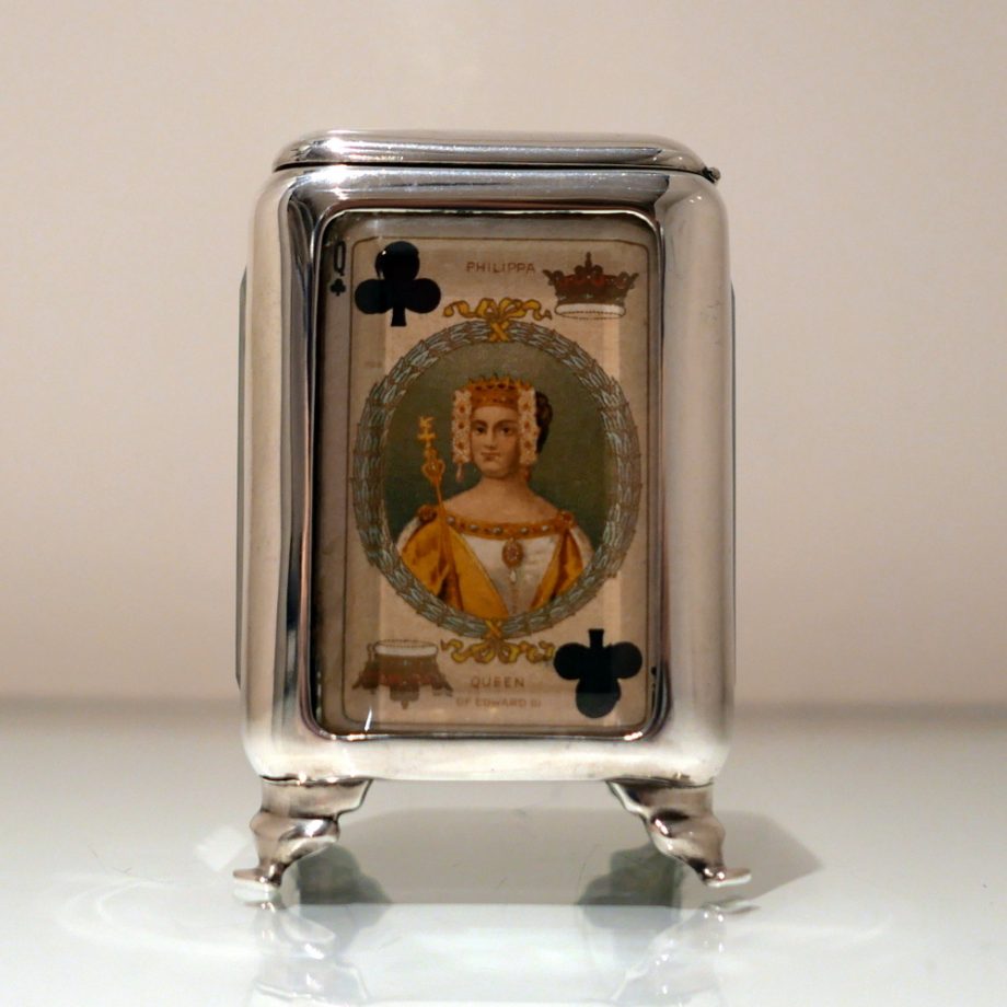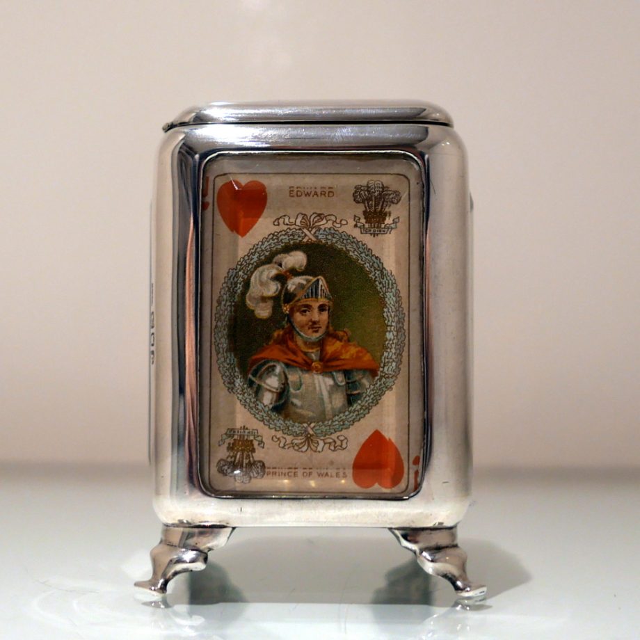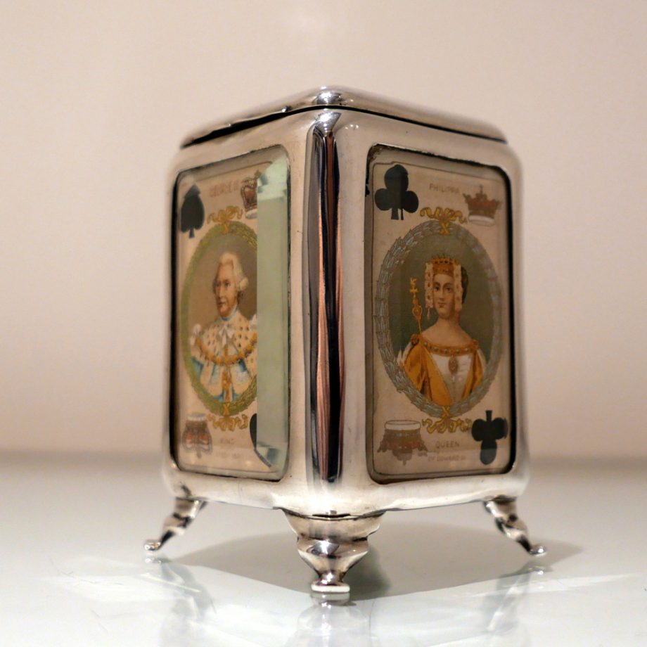 An incredibly rare and extremely stylish Edwardian silver “picture” card box. Â The hinged lid is typically plain formed in design, however the walls of the box each have a suite of cards framed behind a bevelled glass panel for decorative creativity. Â The inside of the box is elegantly lined.