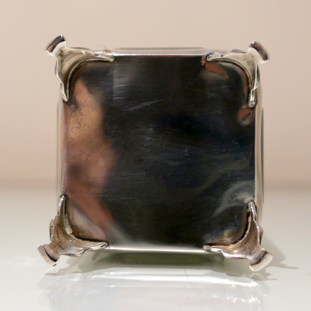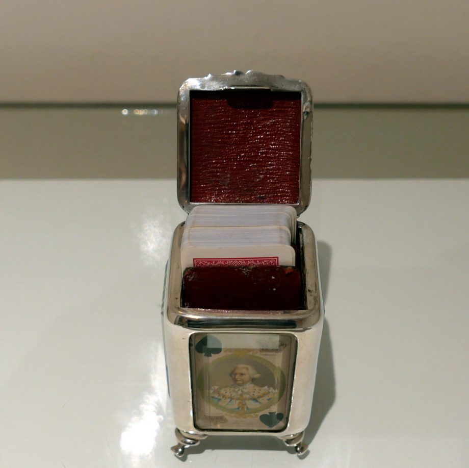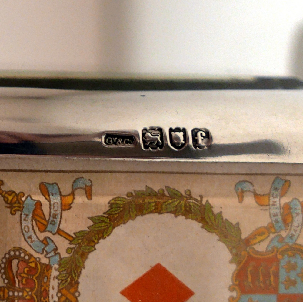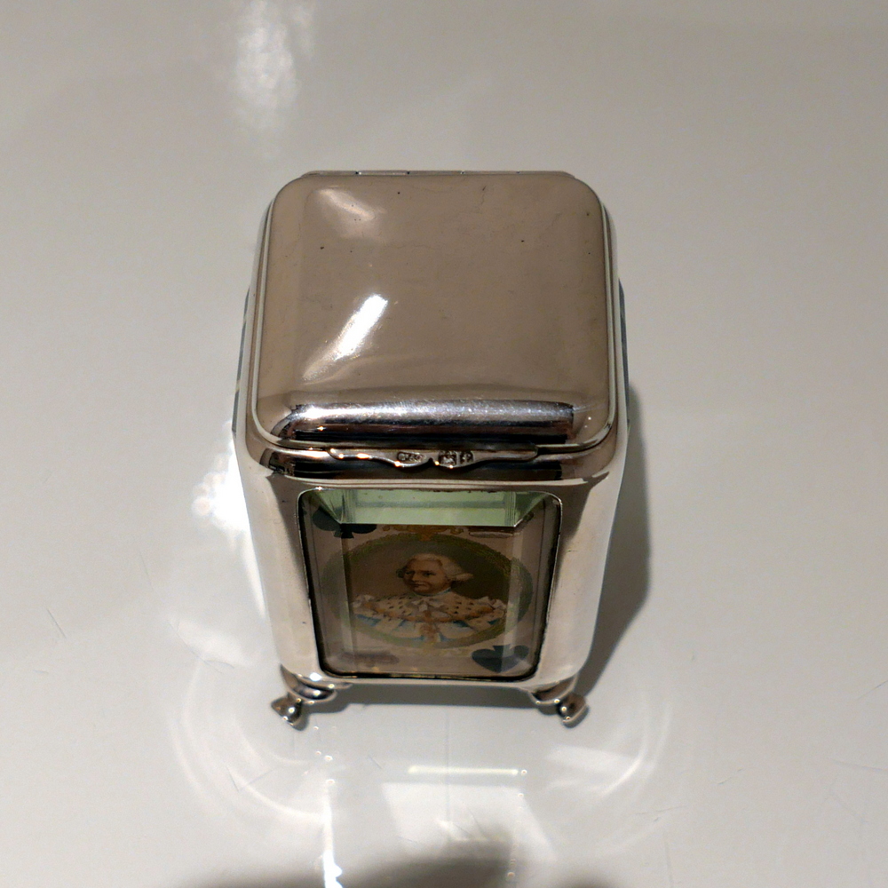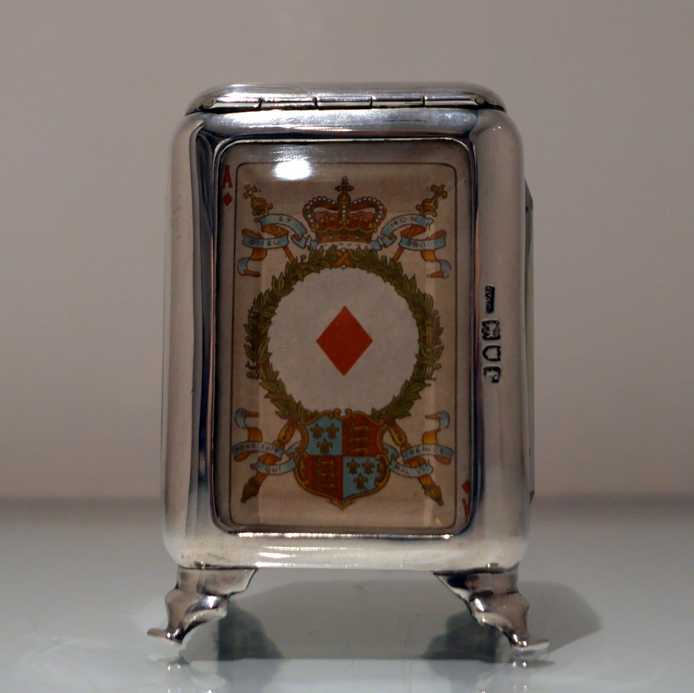 An incredibly rare and extremely stylish Edwardian silver “picture” card box. Â The hinged lid is typically plain formed in design, however the walls of the box each have a suite of cards framed behind a bevelled glass panel for decorative creativity. Â The inside of the box is elegantly lined.