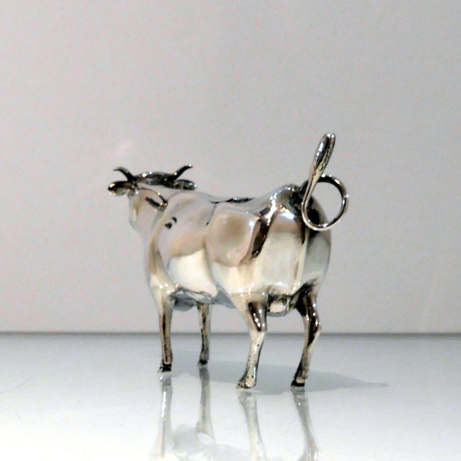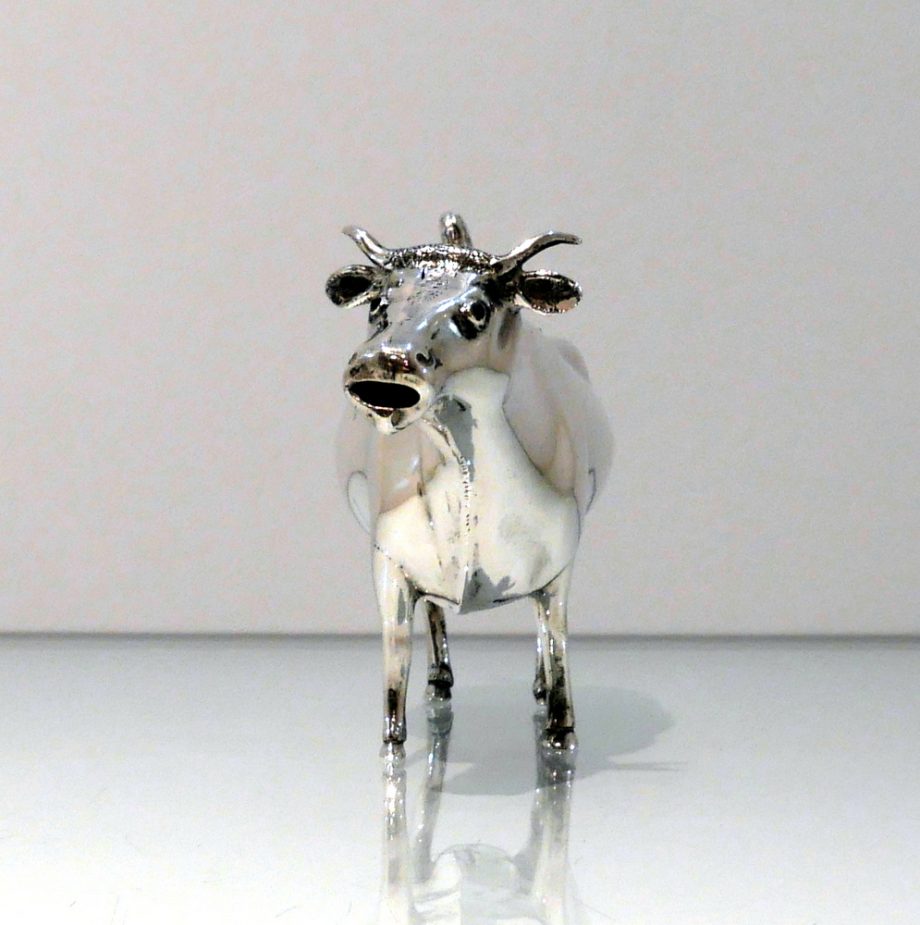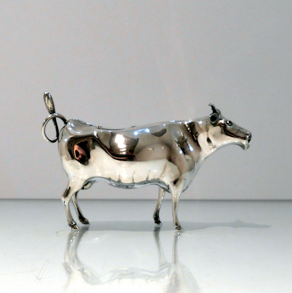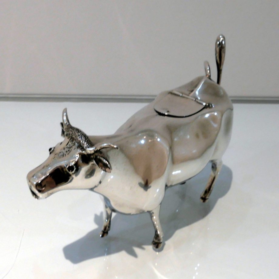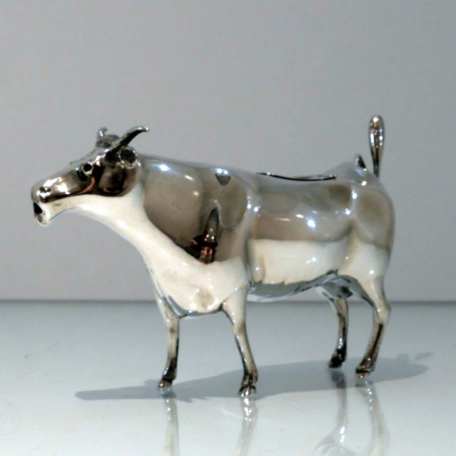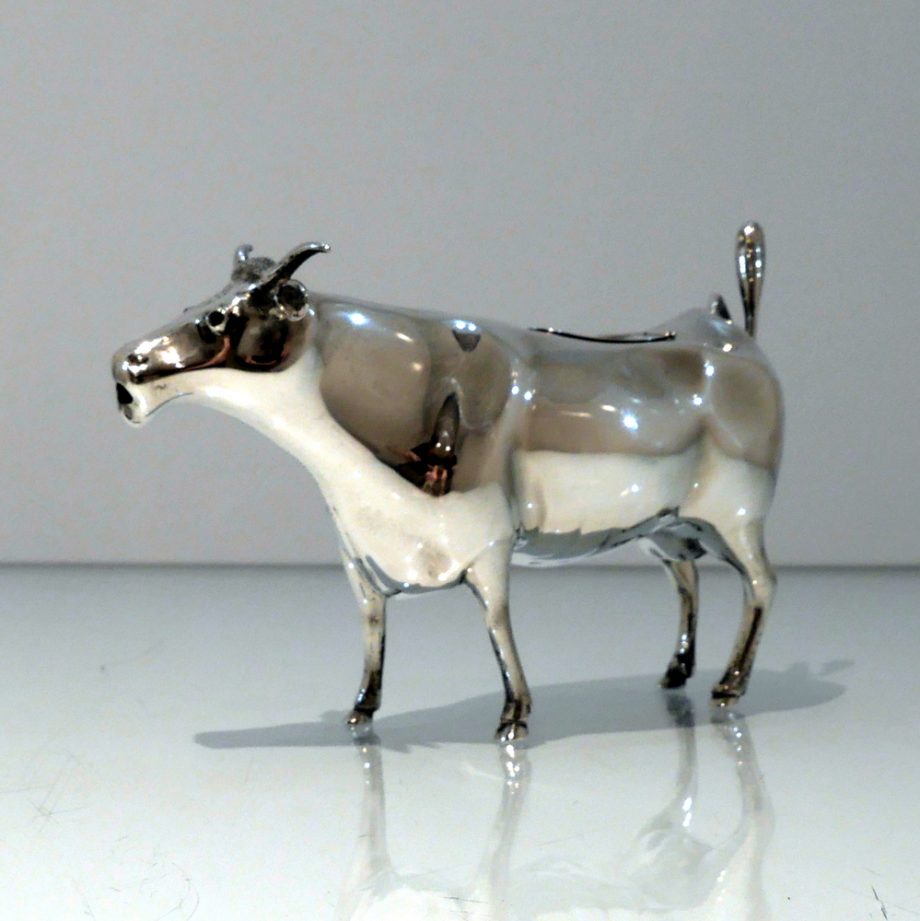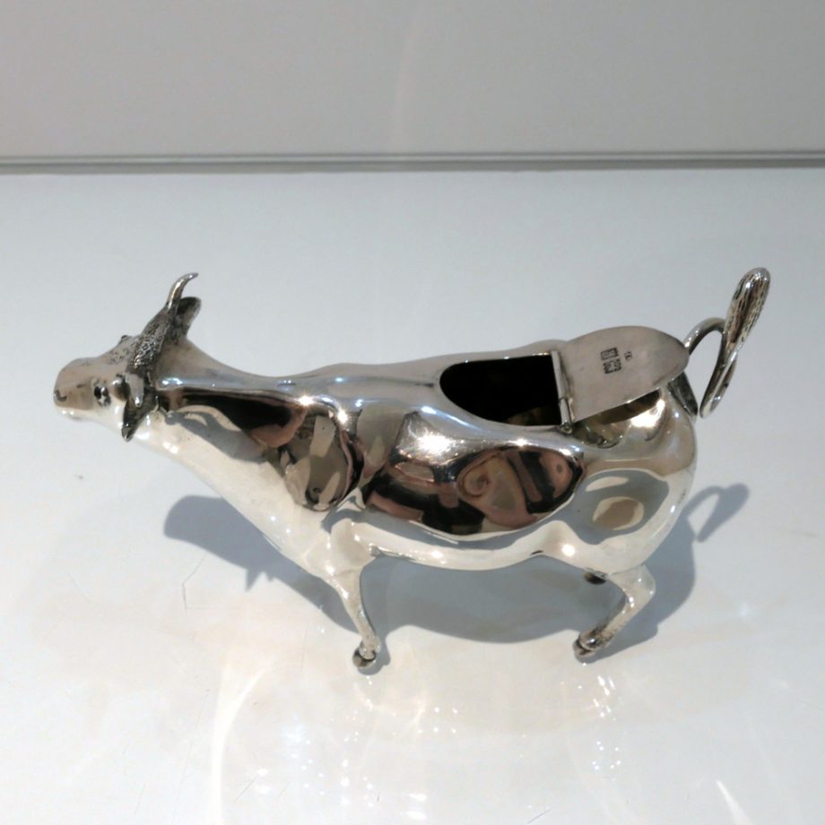 A fine looking early 20th century antique sterling silver cow creamer crafted with realistic detail. Â The hinged lid and swiping (tail) handle round off a delightfully elegant overall design.