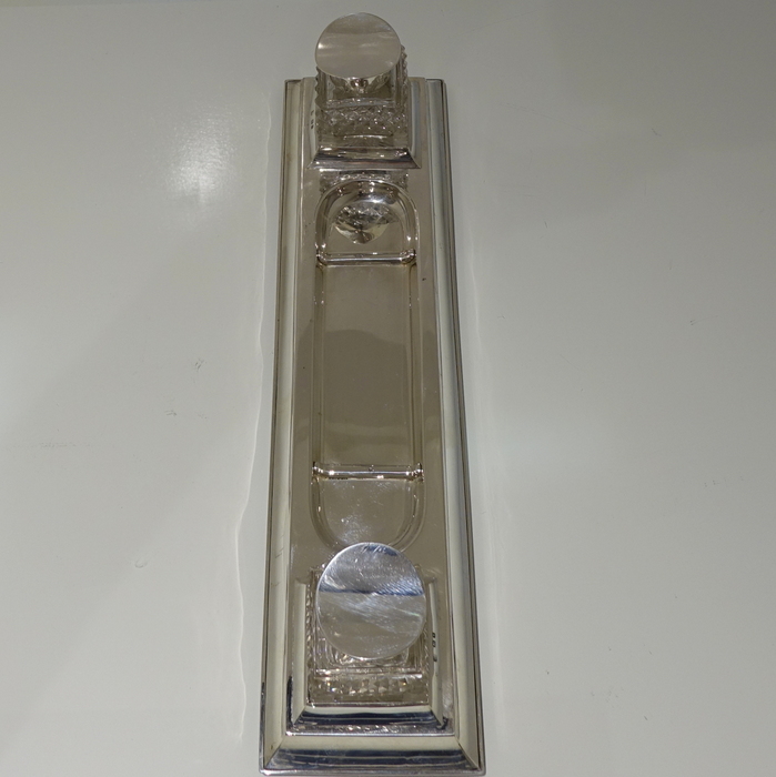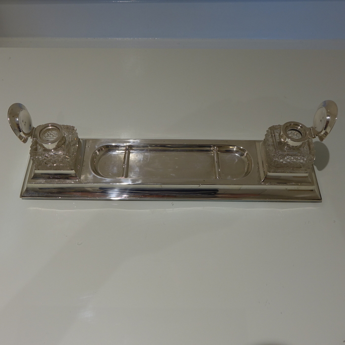 A highly stylish rectangular plain formed large elongated desk inkwell with central quill and nib tray. Â The ink bottles have square hobnail cut glass for decoration and are crowned with stylishly formed hinged lids.
