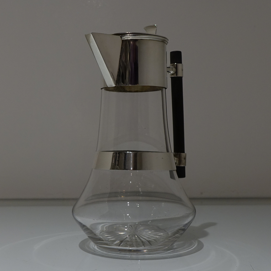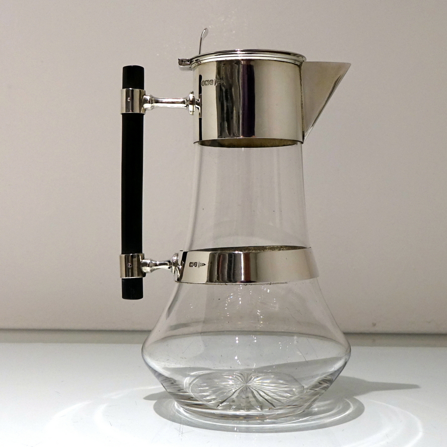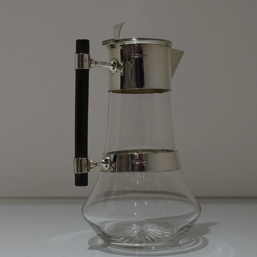 A truly stunning Edwardian silver and glass claret jug which is crafted with plain formed mount and support which then attaches to an ebony spun handle. Â The lid is hinged and is mounted with a stylish thumb piece. Â The bulbous glass has additional “star cutting” on the base for decorative lowlights.