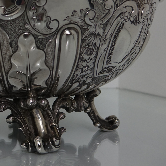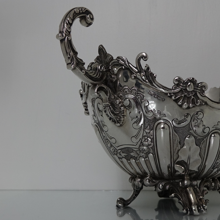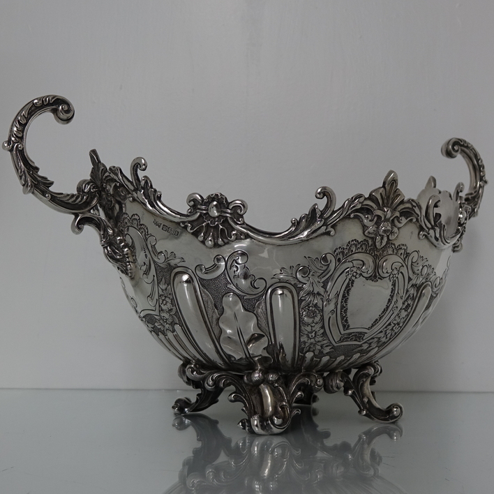 A very stylish acanthus leaf themed 0val rose bowl.  The body of bowl has splashing of reed, floral and  matt for decoration.  The bowl has a double cartouche and sits on four feet.