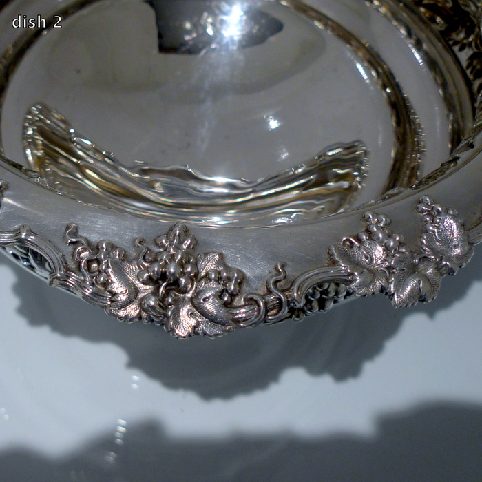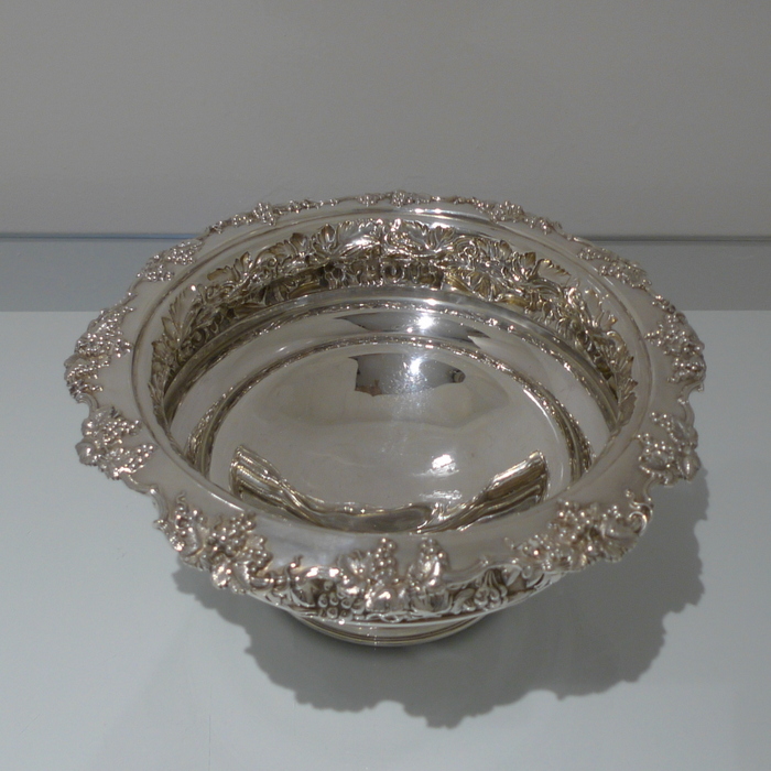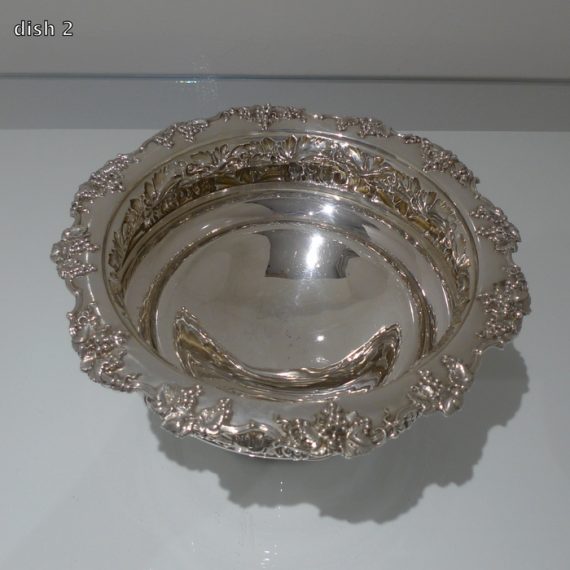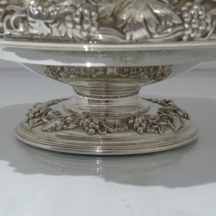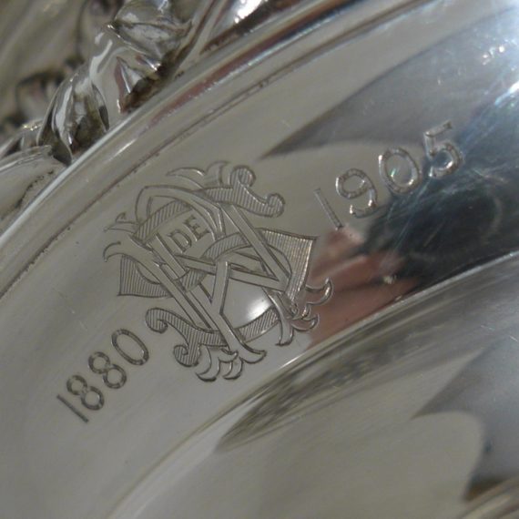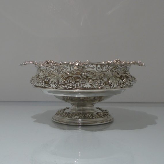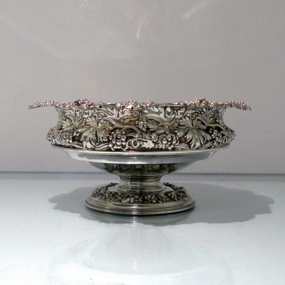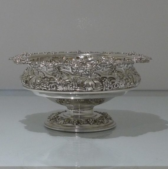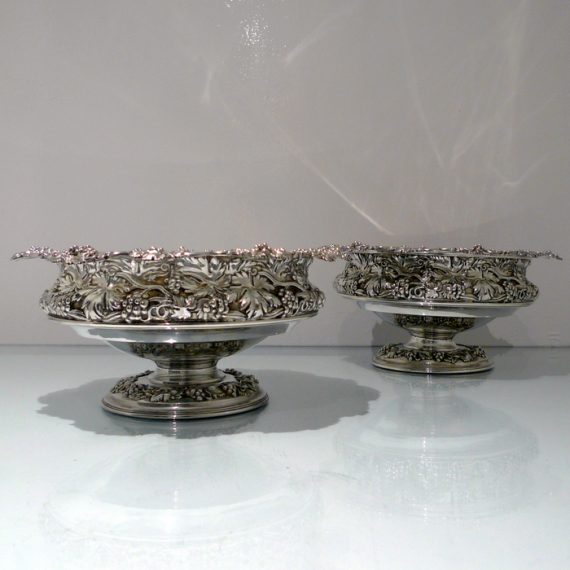 A very decorative pair of Edwardian circular bowls decorated with elegant grape and vine chasing on the upper section of the body. Â The raised pedestal foot has an additional band of decorative chasing for lowlights. Â The centre front on both bowls have stylish contemporary entwined initials and presentation dates inscribed.