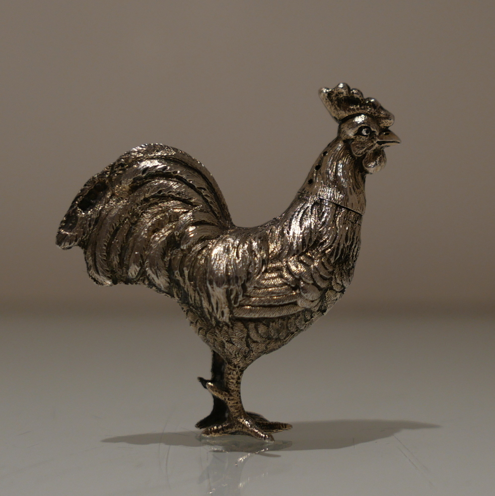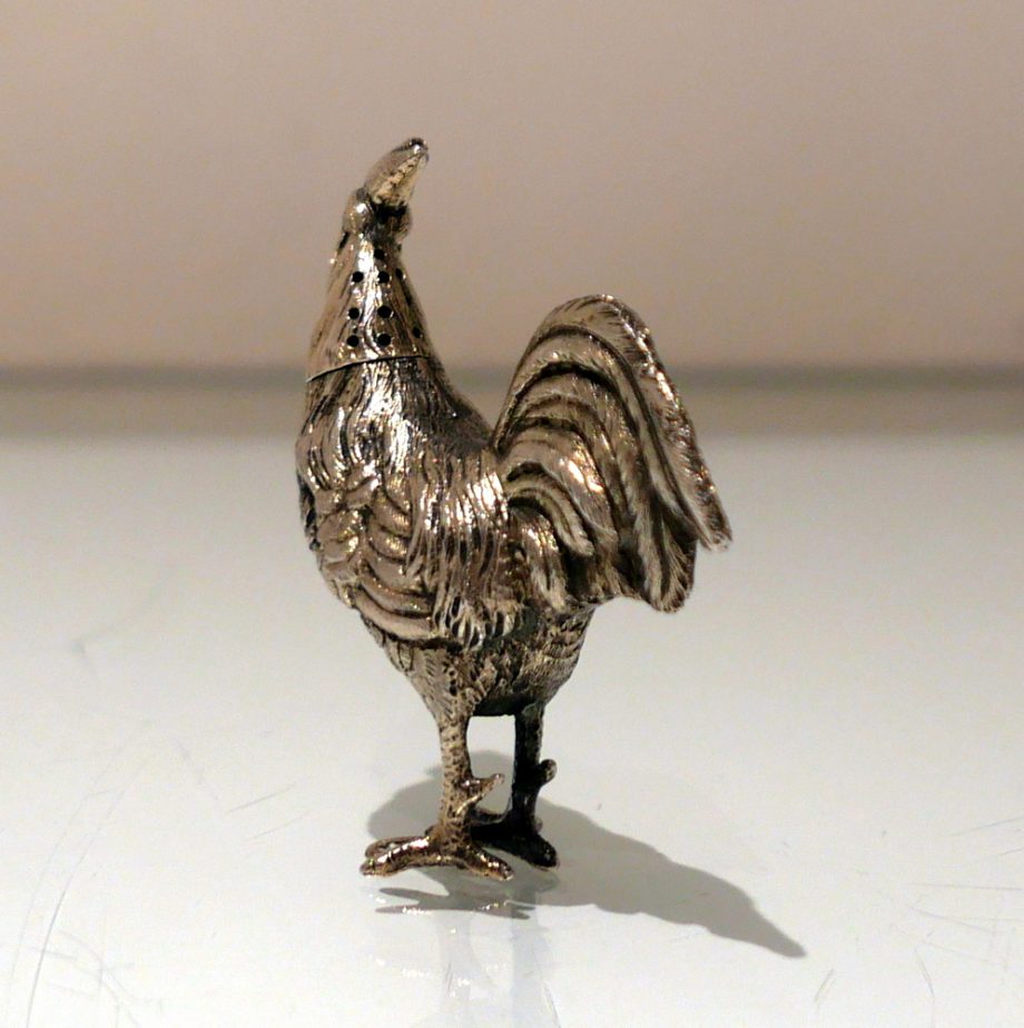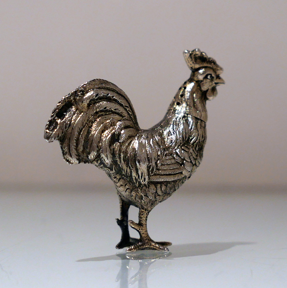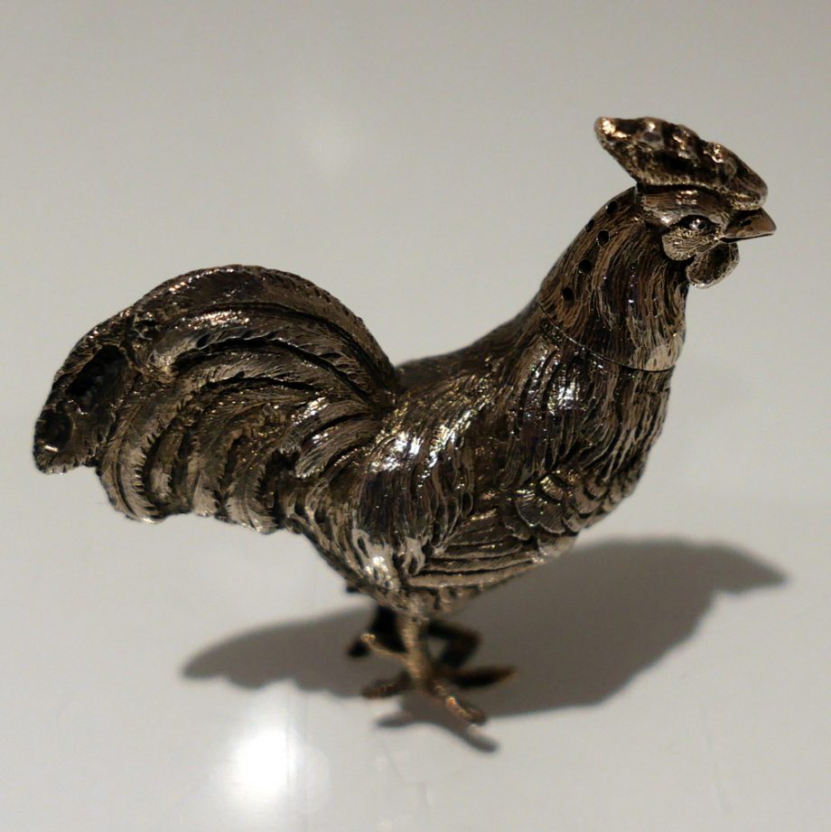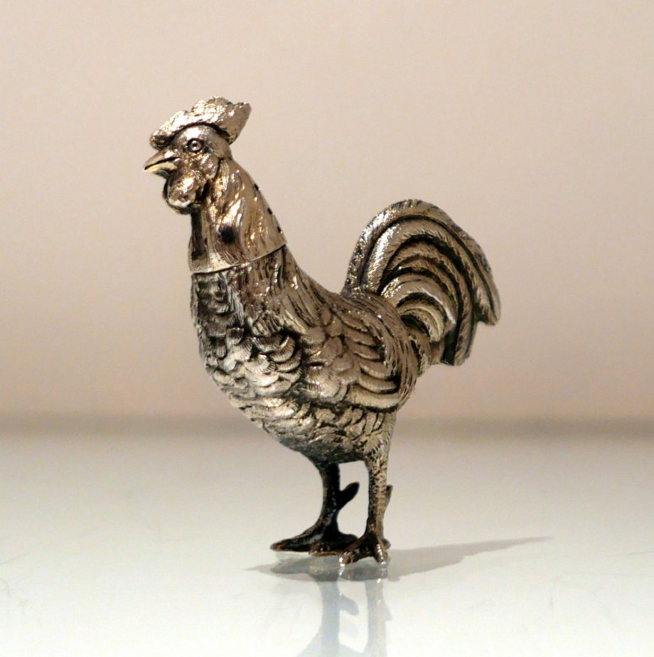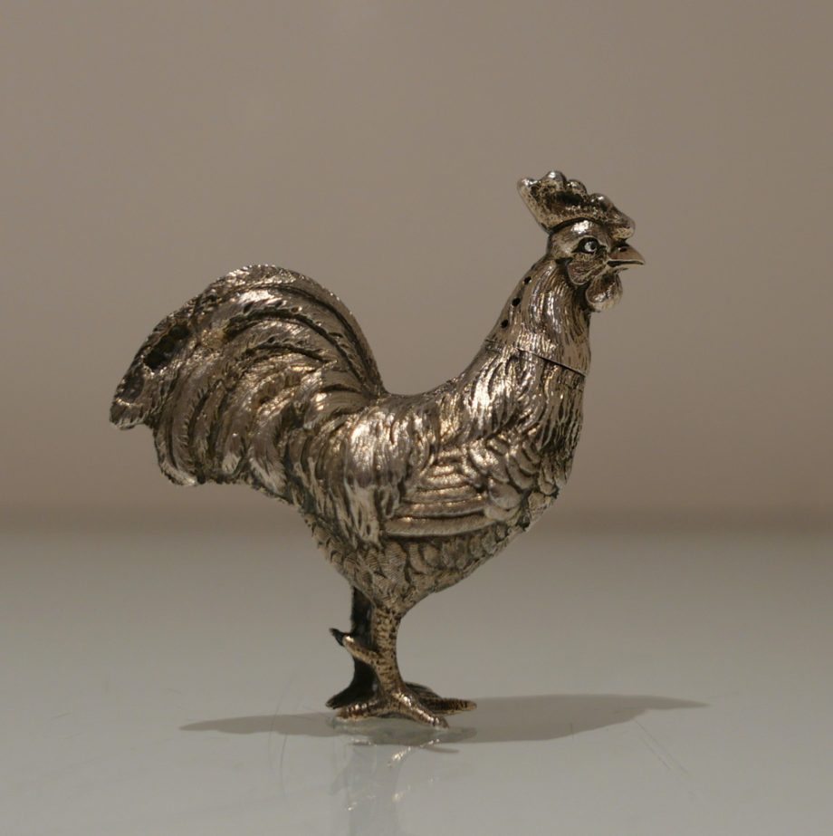A rare and incredibly sweet small silver ‘cockerel’ pepper modelled with elegant realistic detailing. Â The head is detachable and the pepper holes are formed on the back of the neck.