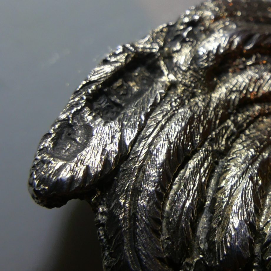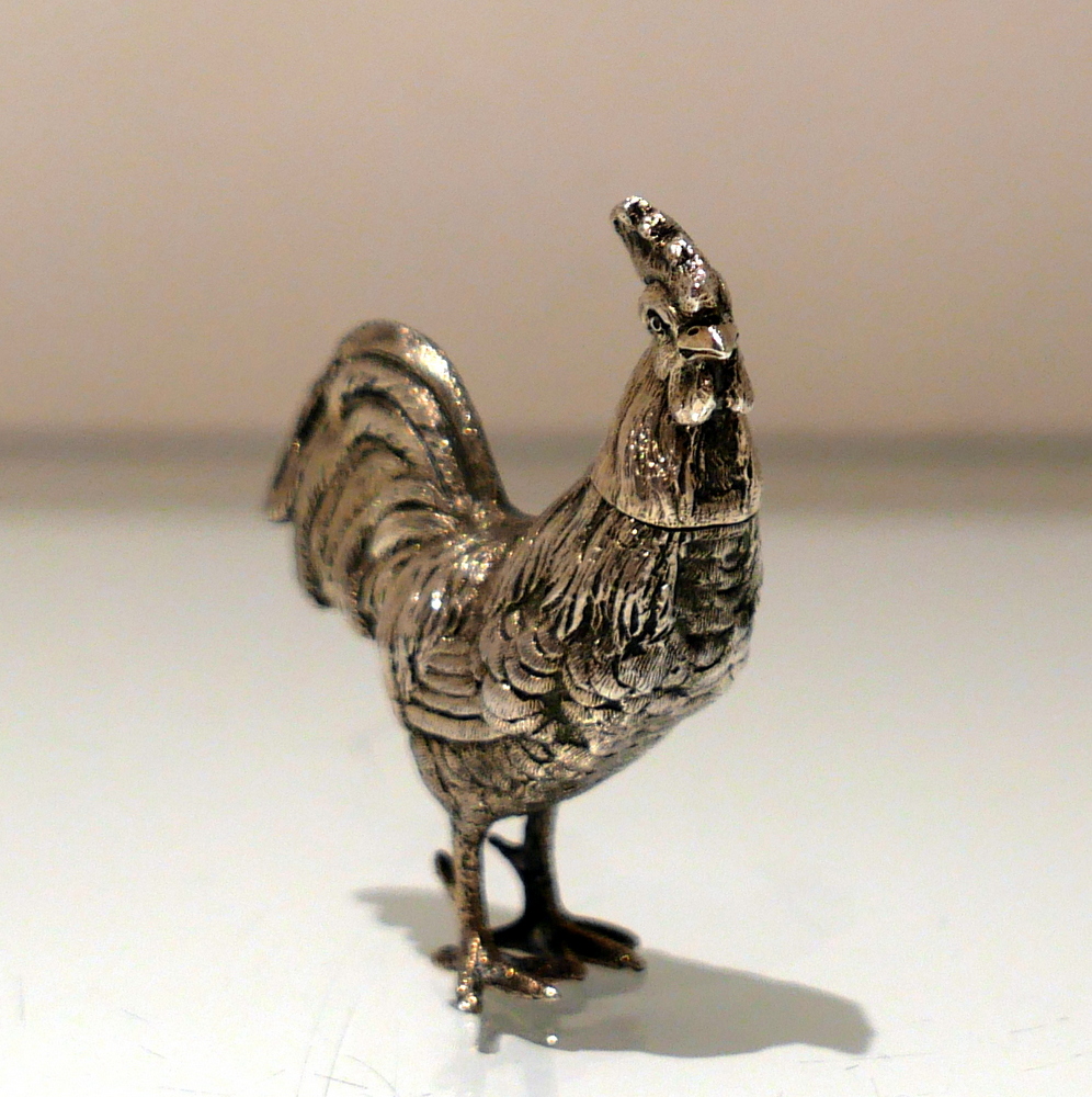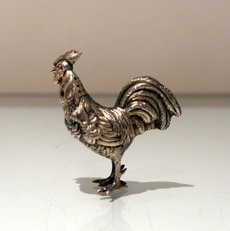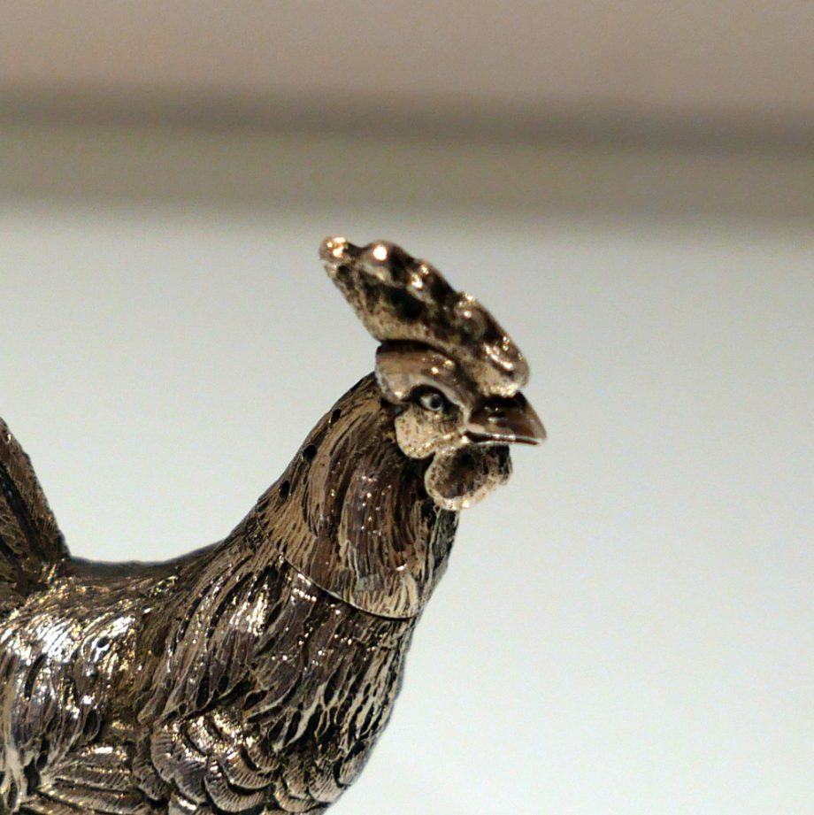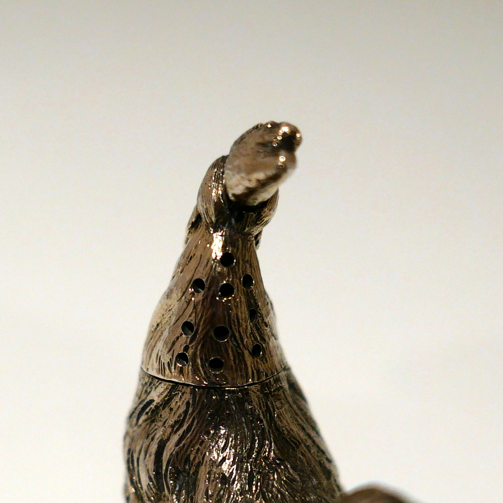 A rare and incredibly sweet small silver ‘cockerel’ pepper modelled with elegant realistic detailing. Â The head is detachable and the pepper holes are formed on the back of the neck.