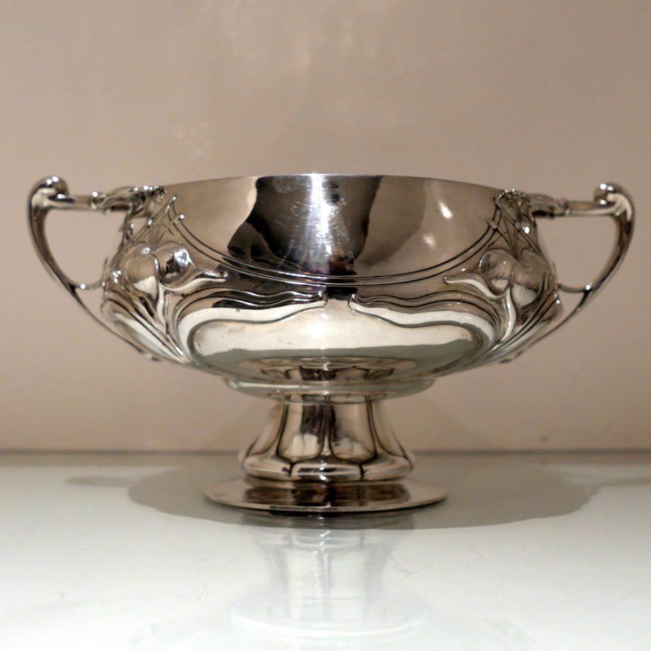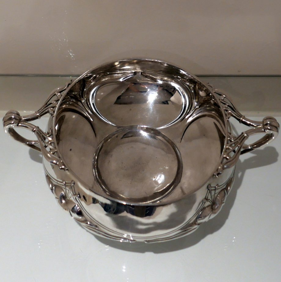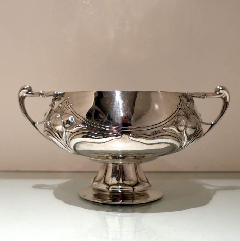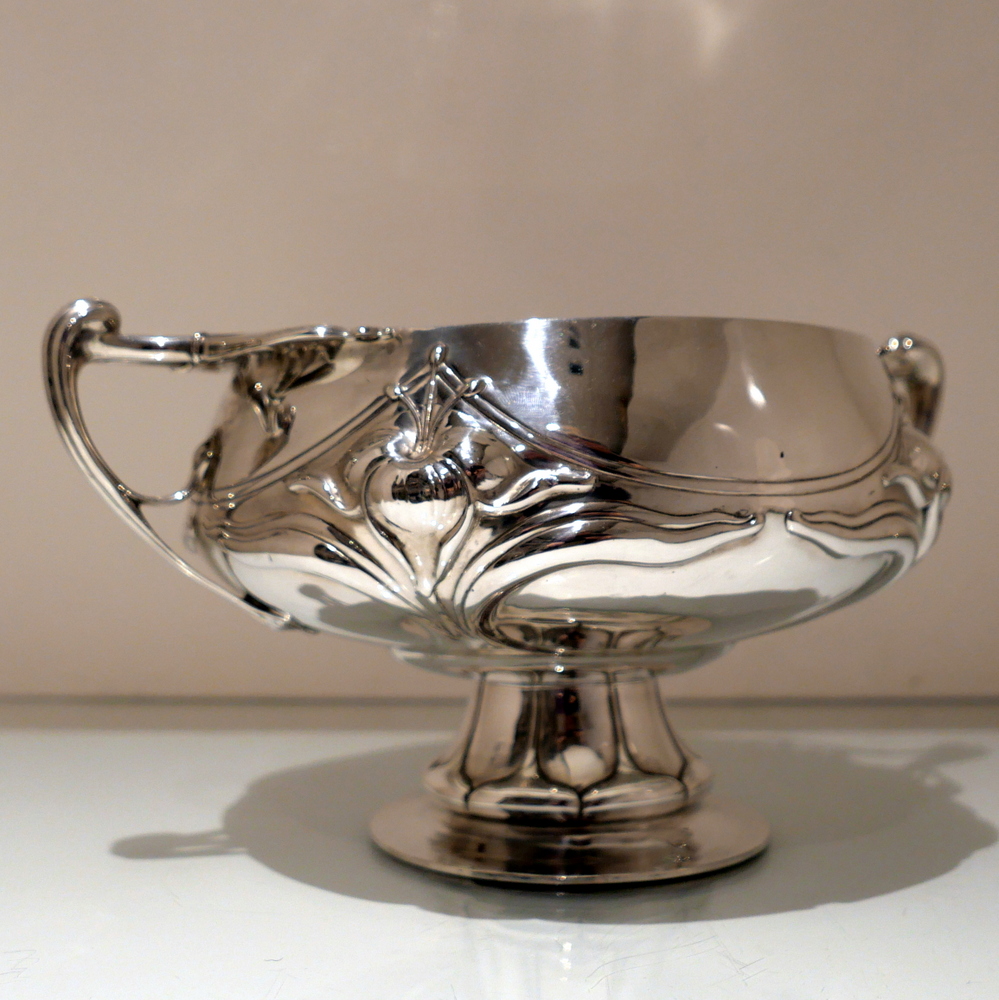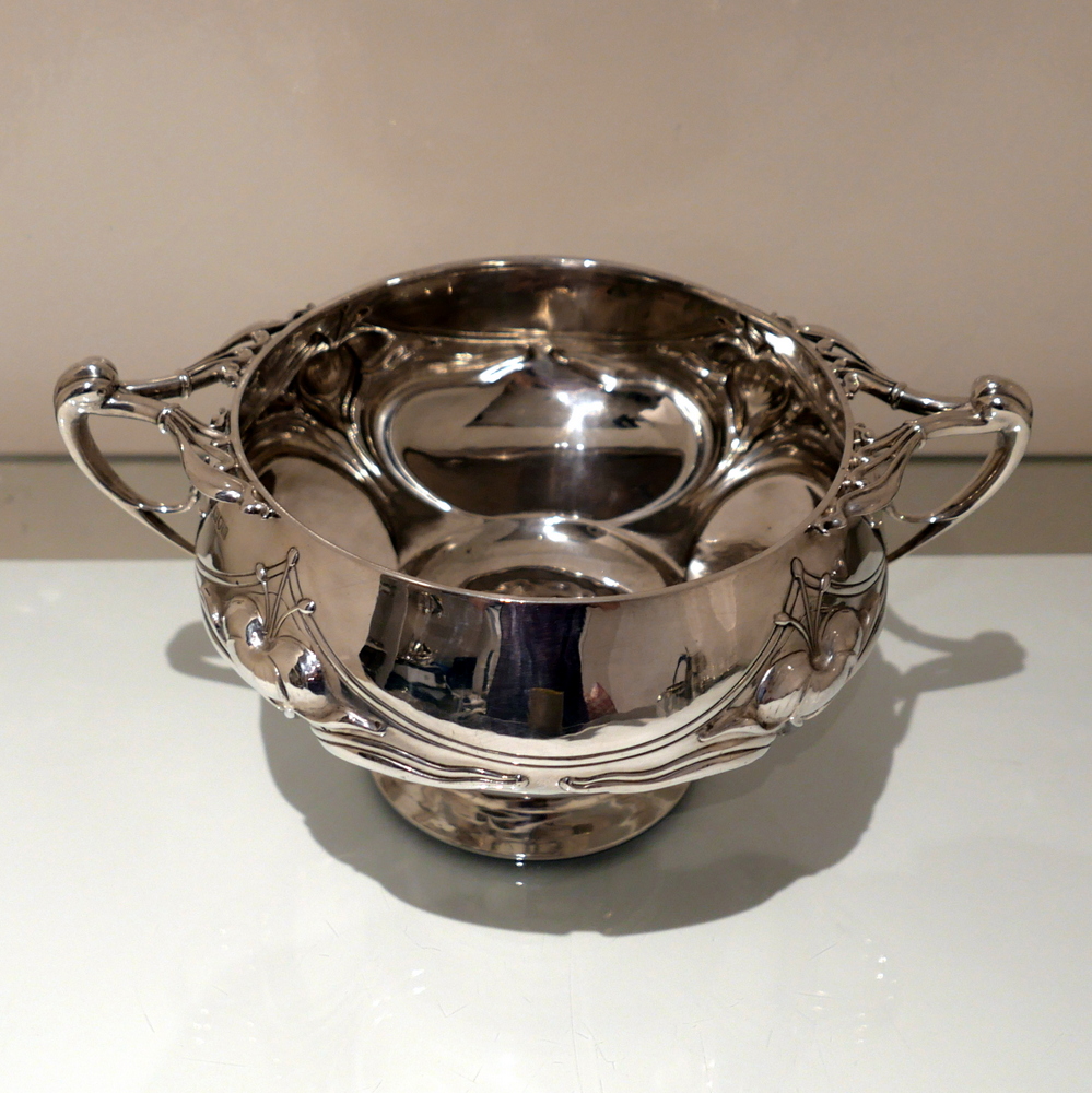 A stylish sterling silver art nouveau rose bowl decorated with elegant floral motifs and adjoining wire work handles.