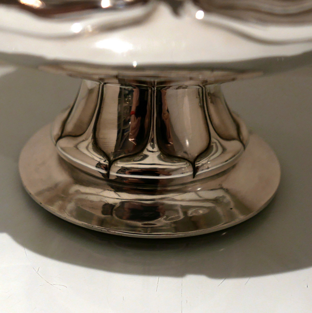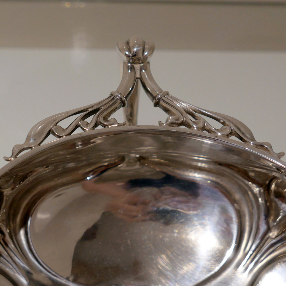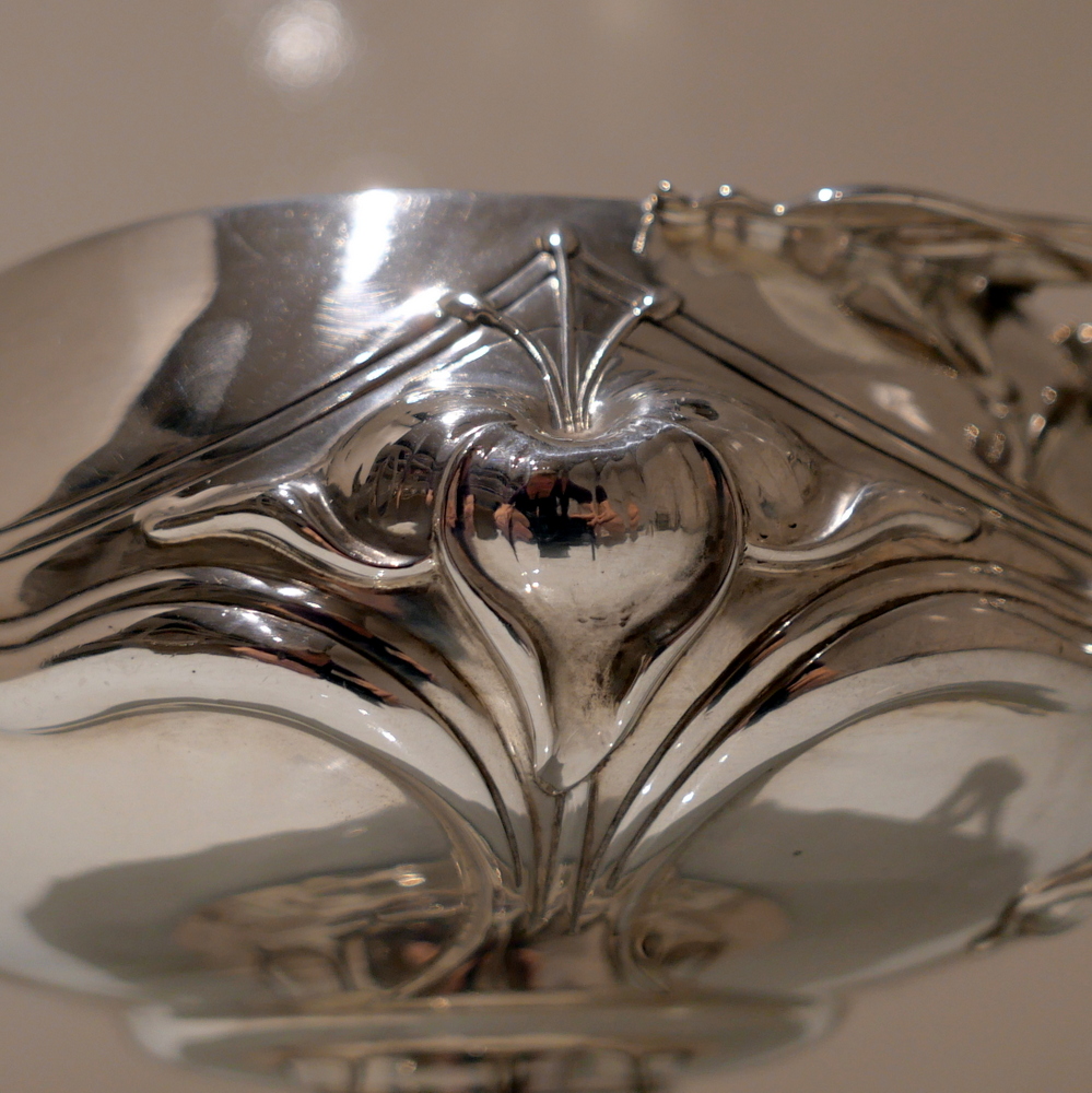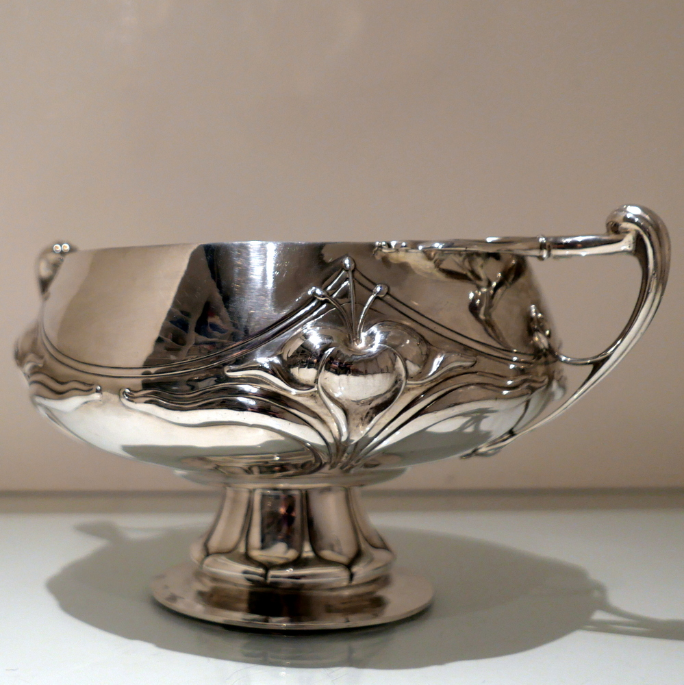 A stylish sterling silver art nouveau rose bowl decorated with elegant floral motifs and adjoining wire work handles.