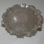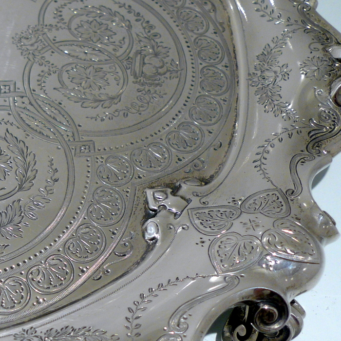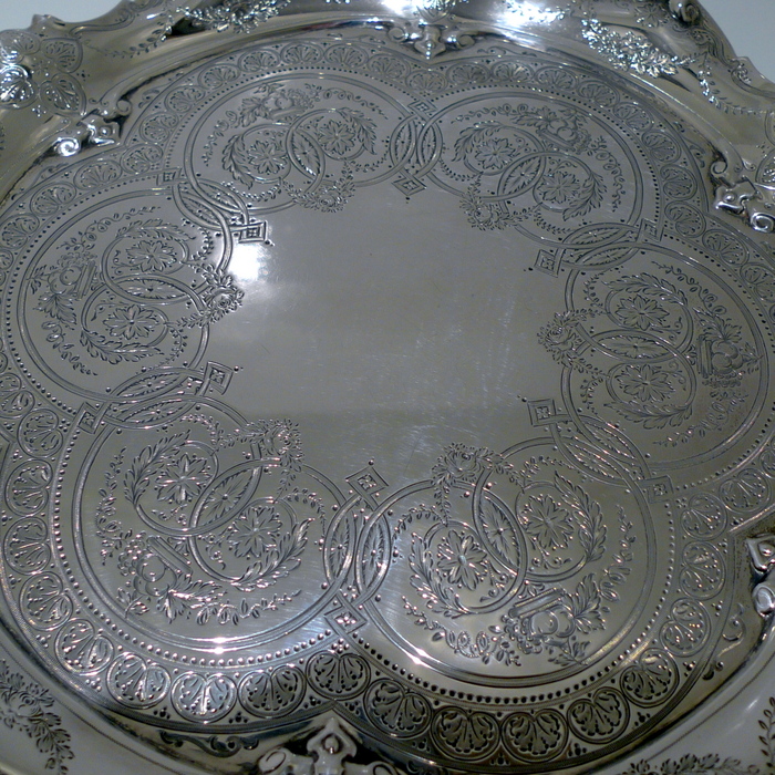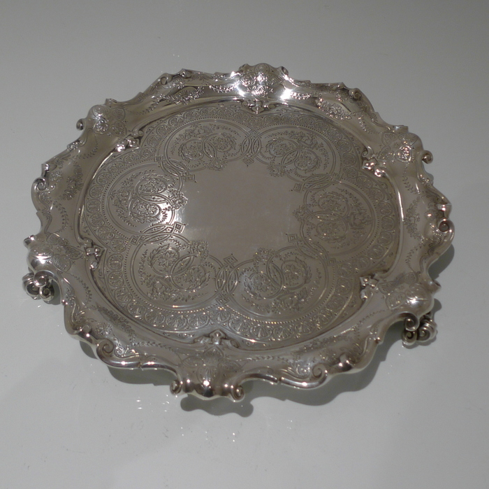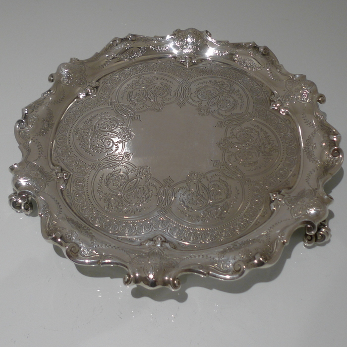 A splendid early Edwardian mid-sized shaped circular salver decorated with stunning bright cut hand engraving which is heavily influenced by the Victorian era. Â The salver sits on three stylish feet.