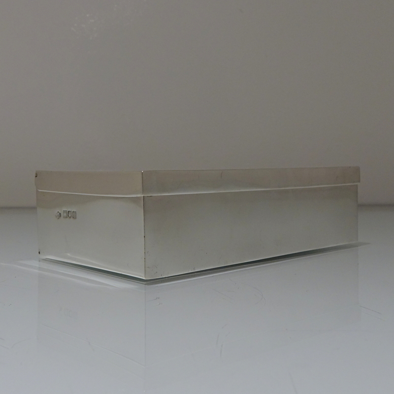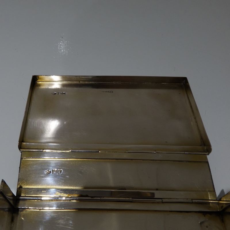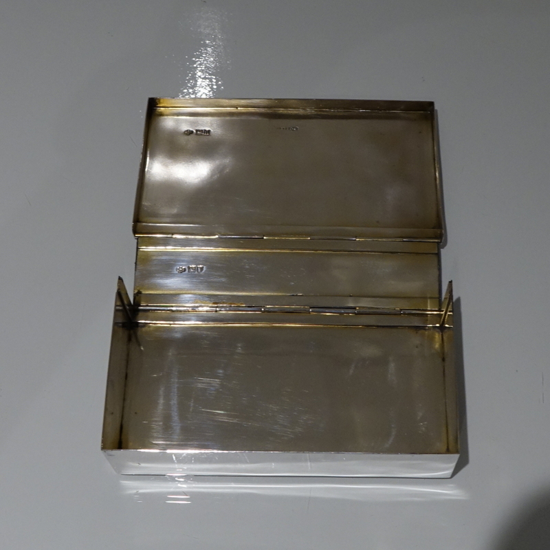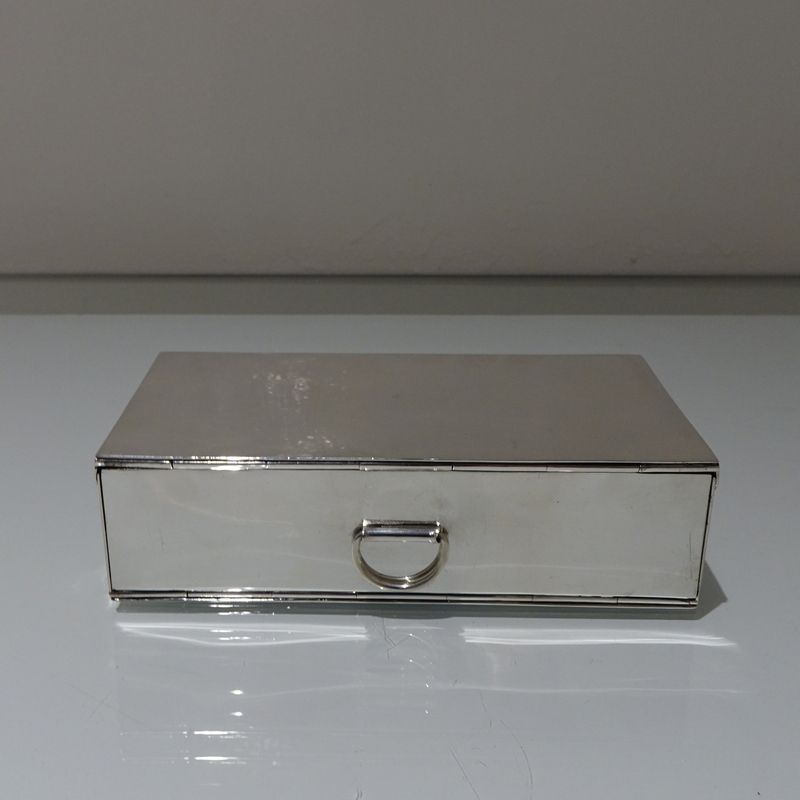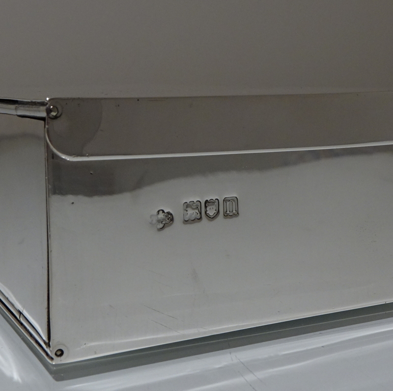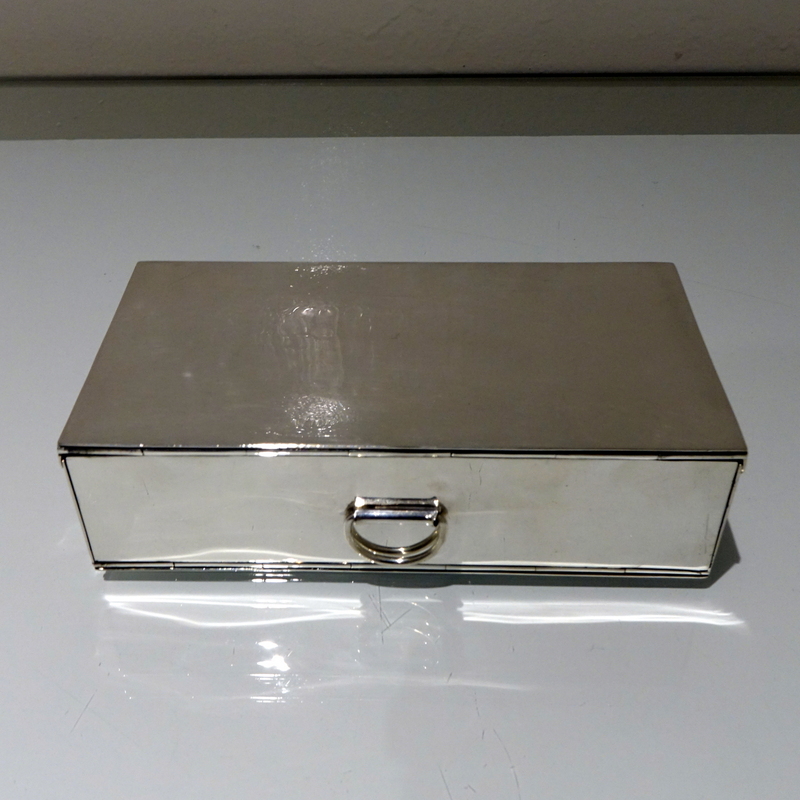 A splendid quality plain formed folding silver sandwich box with an elegant drop ring carry handle. Â The box is hinged in two sections.