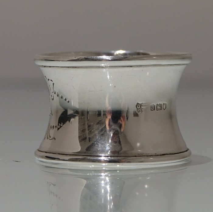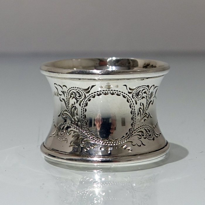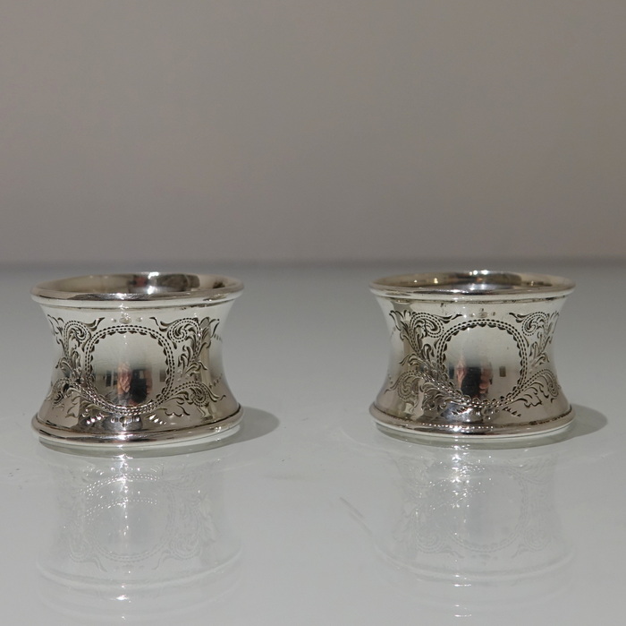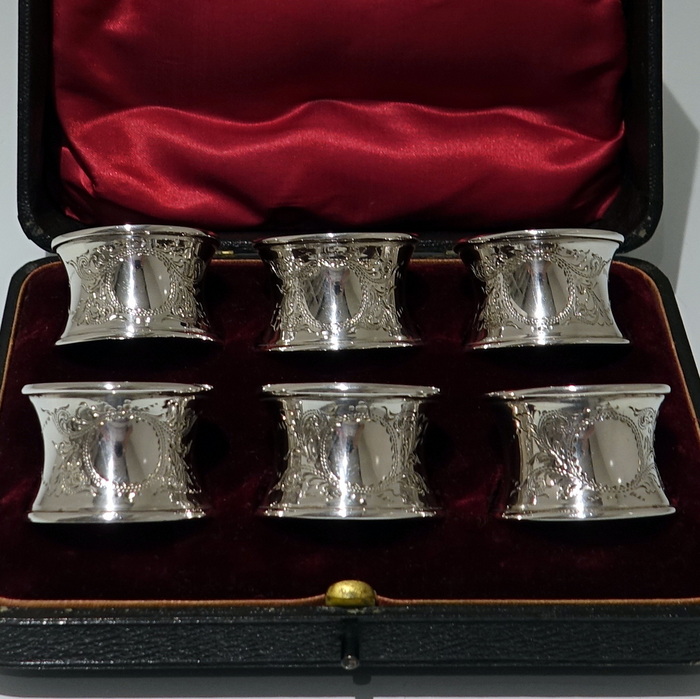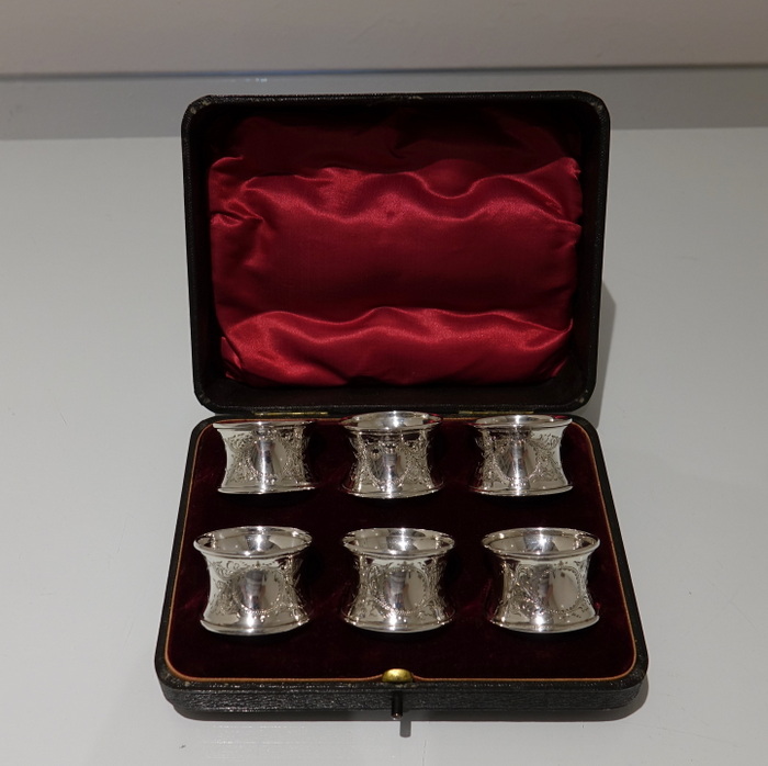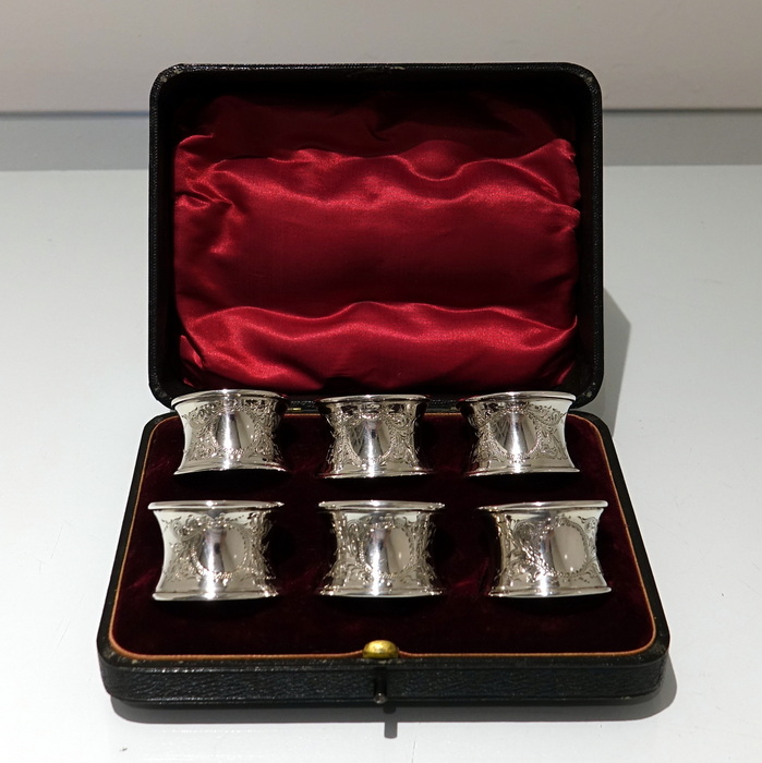 An elegant set of six Edwardian napkin rings presented in a red velvet lined case. Â The centre fronts of the napkins have circular cartouches with an elaborate bright cut surround.