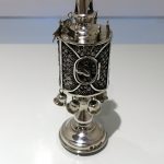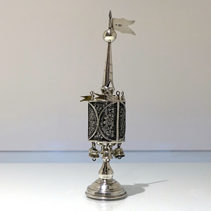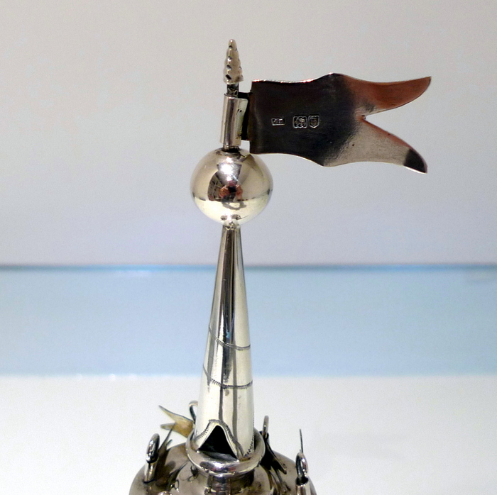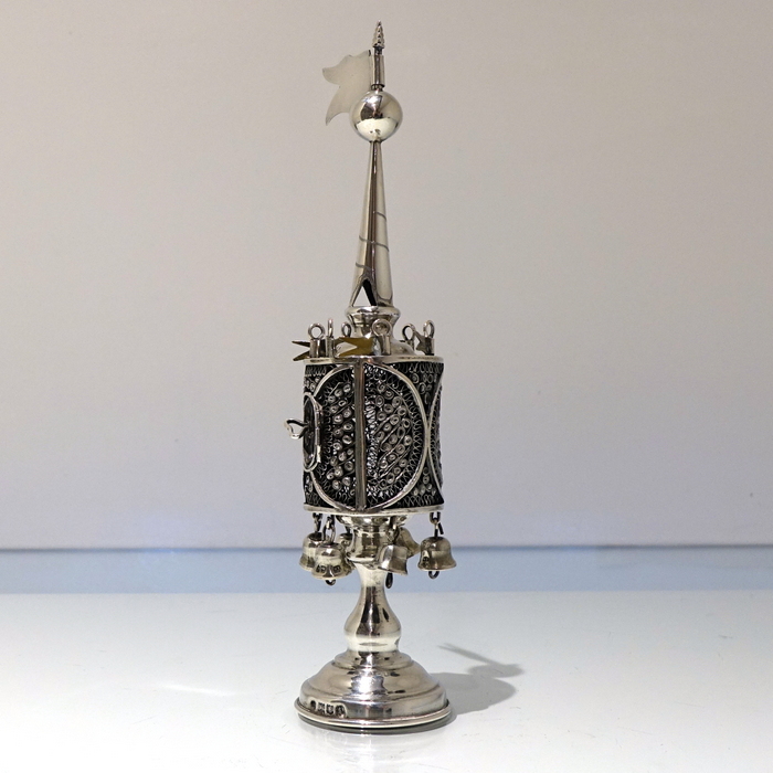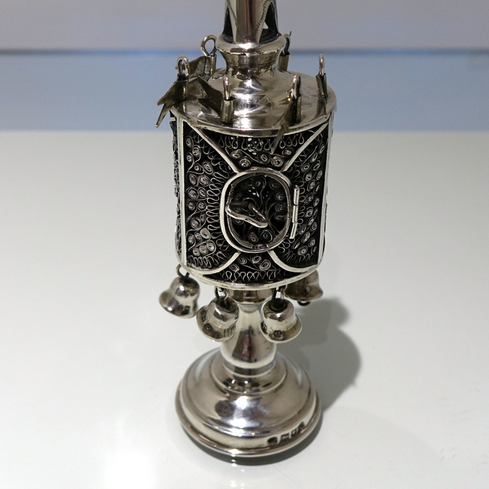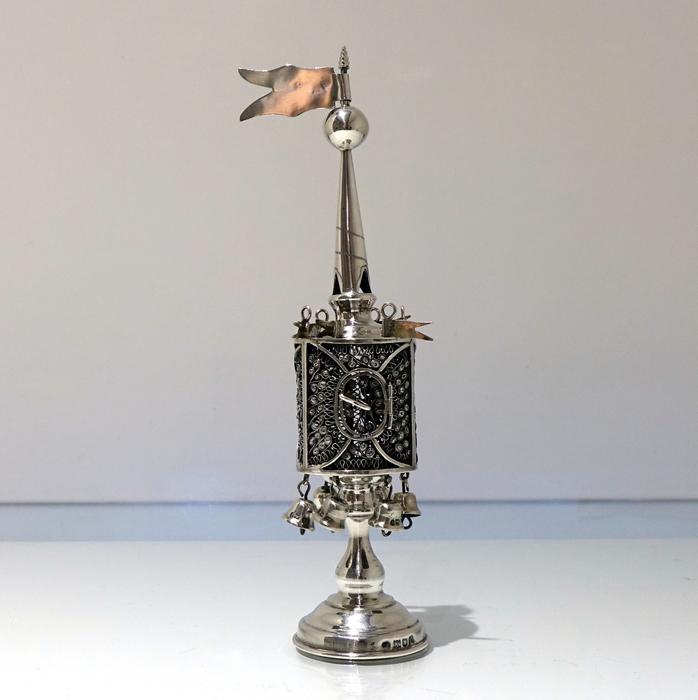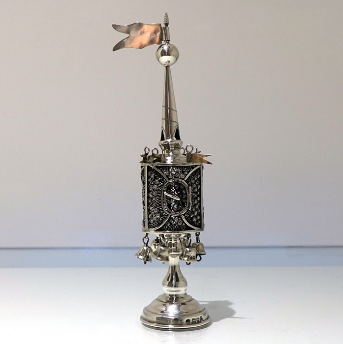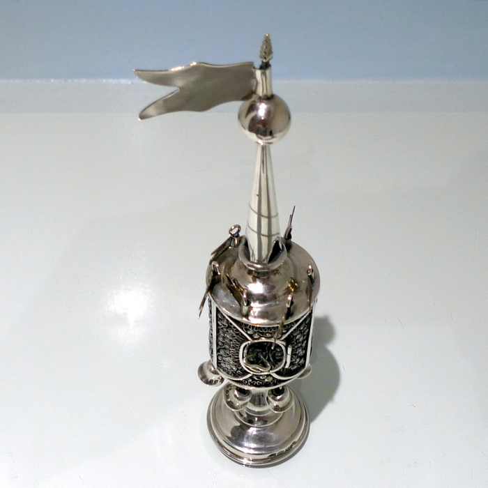 A stunningly beautiful and extremely collectable Edwardian spice tower. Â The central spice compartment is drum shaped with elegant intricate filagree walls and arched hinged door. Â Below this hang stylish bells for lower decoration and the spice tower itself is crown with a traditional mast and flag.