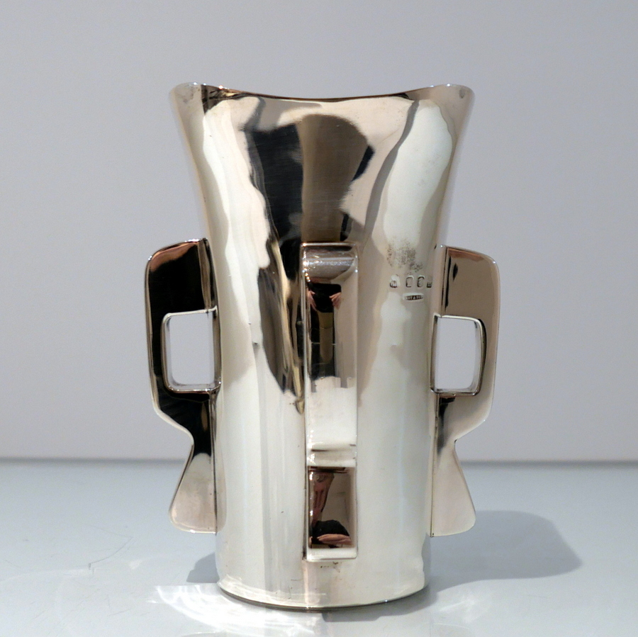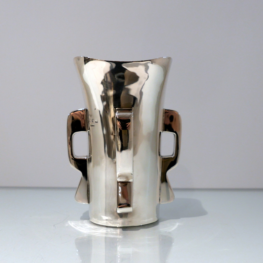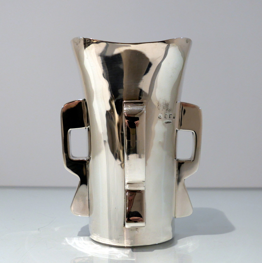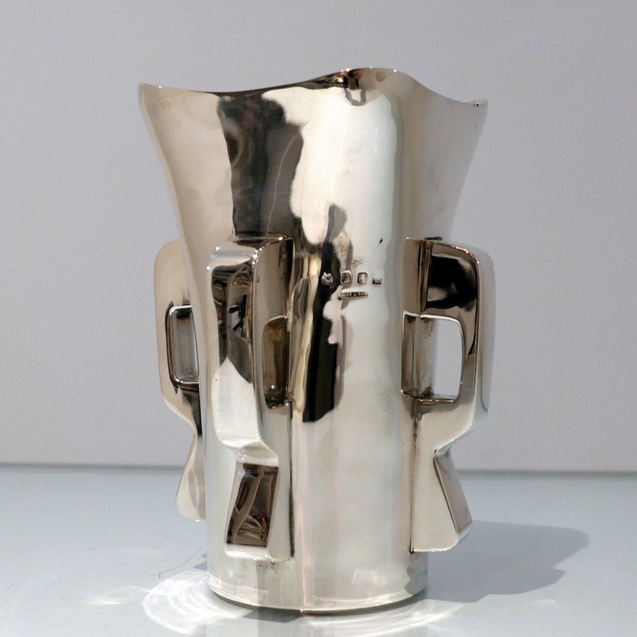 A stylish Edwardian four handled silver flower vase/cup designed with an elegantly tapering plain formed body. Â The magnificently stylish “square’ formed applied handles have a ‘gothic’ orientated stylisation.