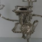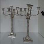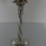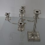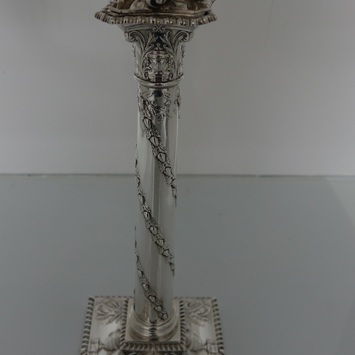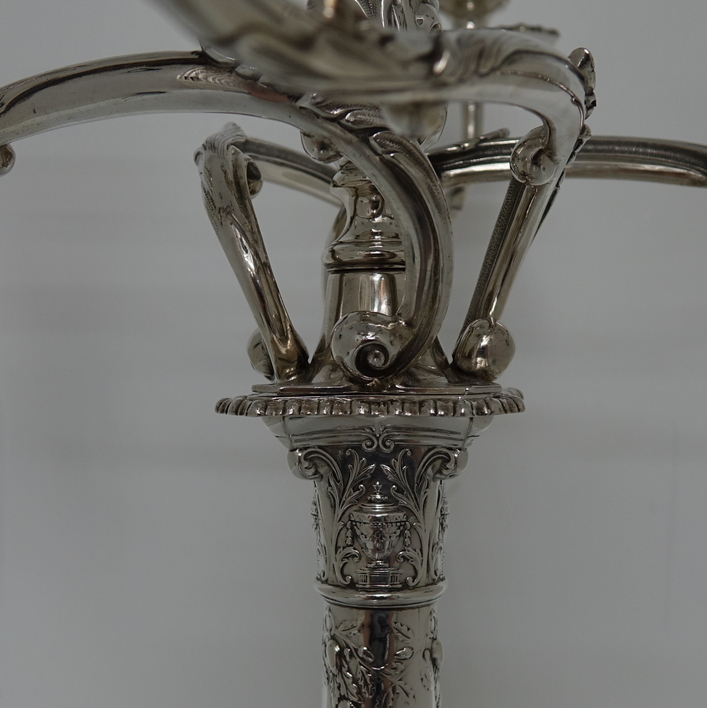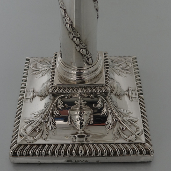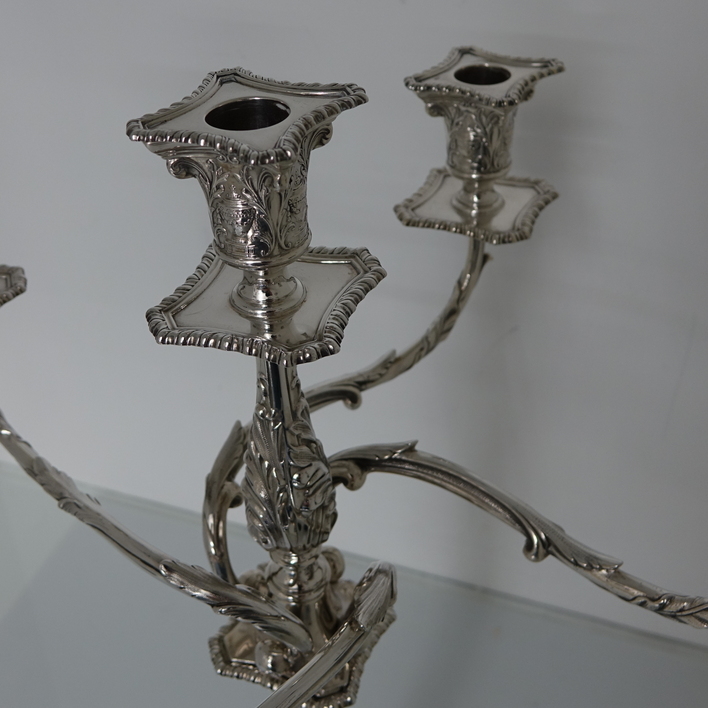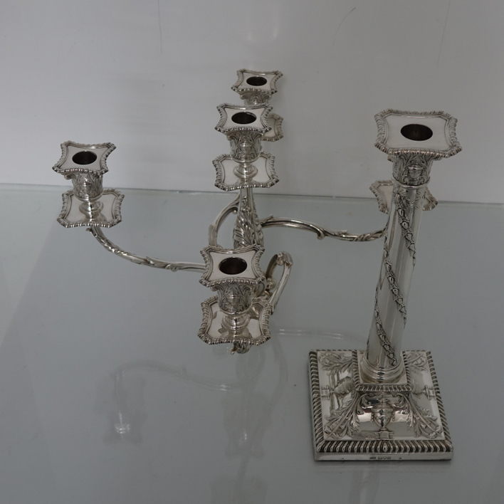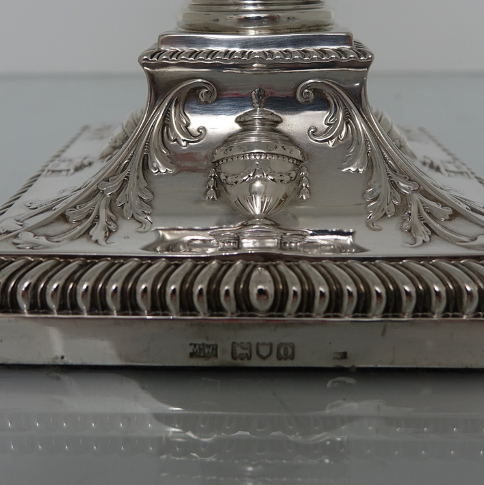 A very stylish pair of silver five-light, square base candelabras with elegantly spread branches. The bases and the capitals of the candelabra have urn and floral decoration and the base boasts a gadrooned border. The columns of the candelabra have spiralling floral decoration. The five branches on each candelabra are ornate and the central column is decorated with foliage. The nozzles and the drip pans have gadroon borders. A stunningly beautifully crafted pair of candelabras.
