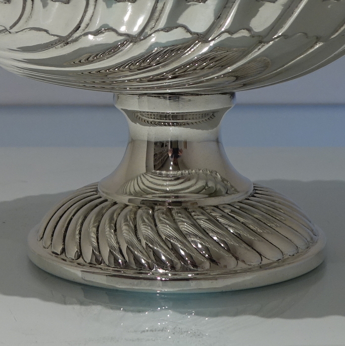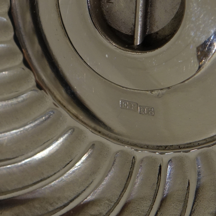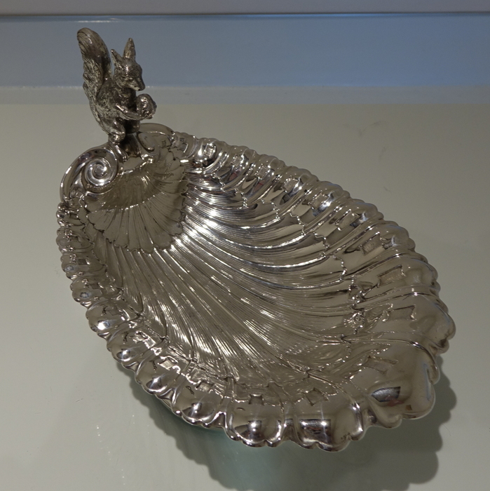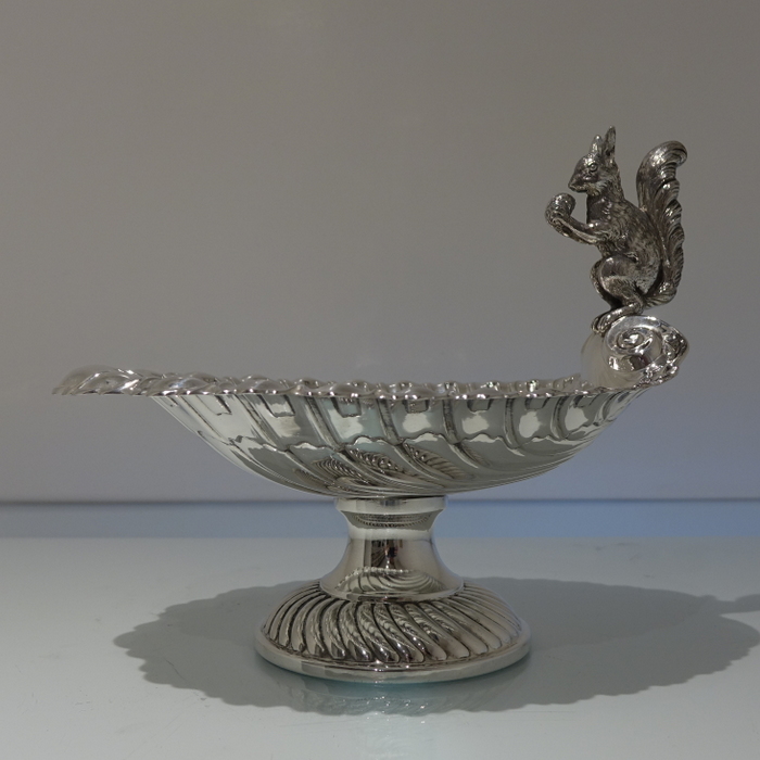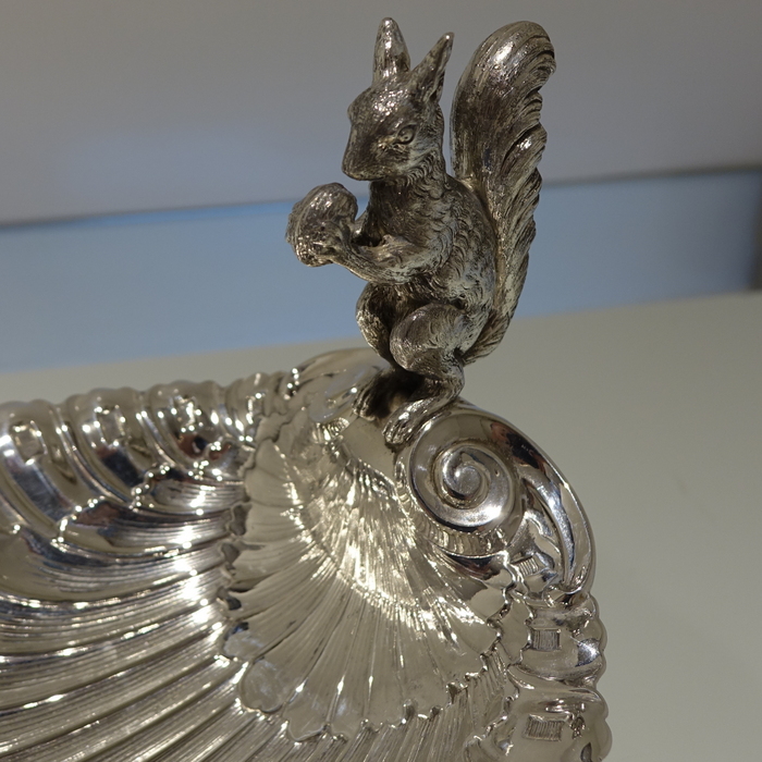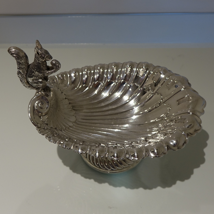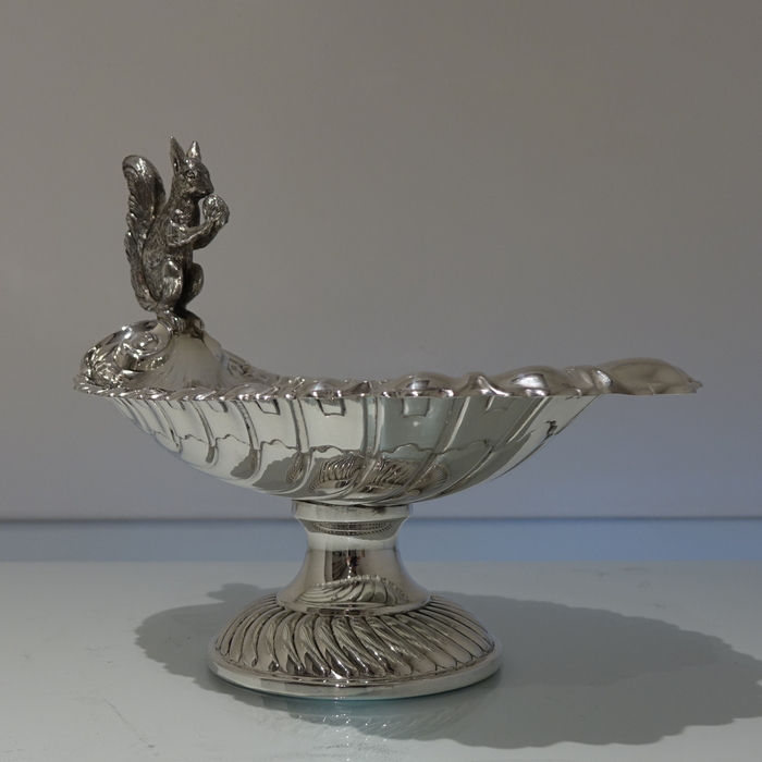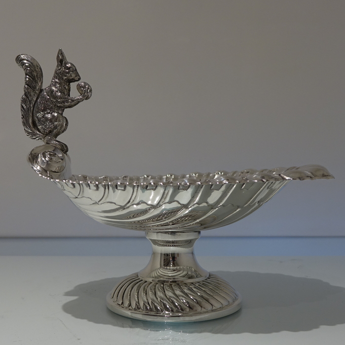 A fabulous silver-plate squirrel (handle) nut dish decorated with waves of naturalistic fluting on the bowl for highlights. Â The foot is circular raised pedestal and has an additional band of fluting for lowlights.